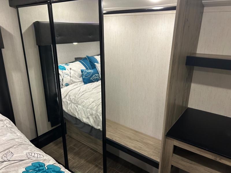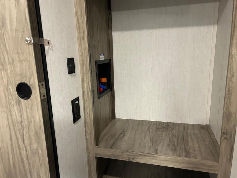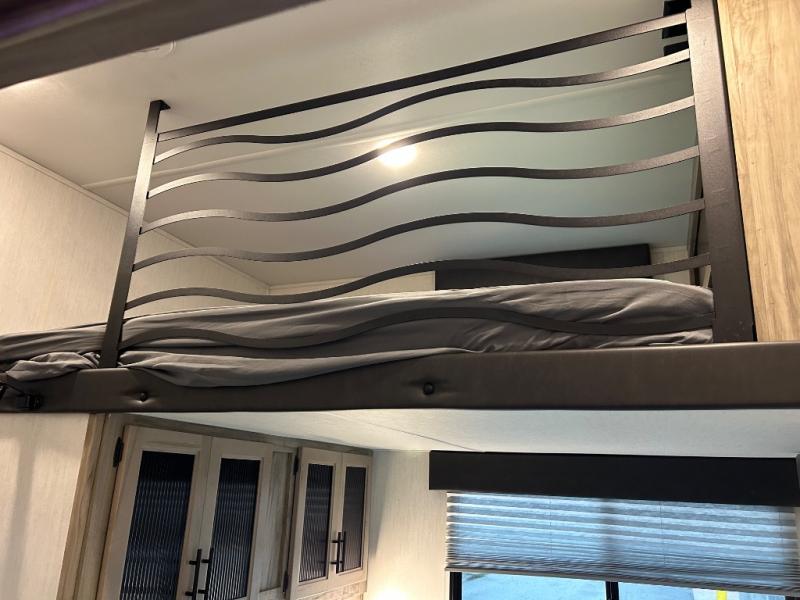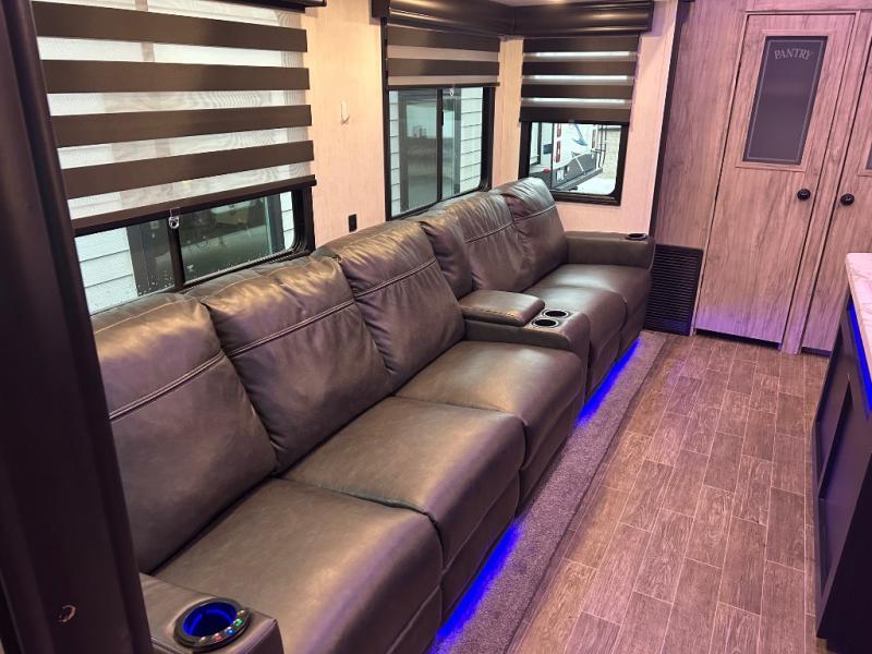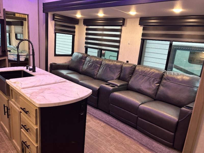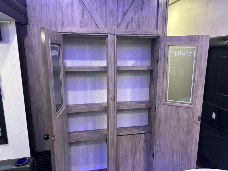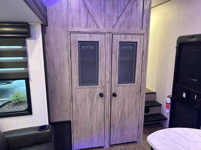 This Cherokee Arctic Wolf Suite fifth wheel is an excellent choice if you have a large family that wants to get away! Not only is there a private bedroom up front for you, but there is also a bedroom suite in the back. This suite has a 54" x 74" bed next to some wardrobe storage, a 60" x 80" loft above the bed with a ladder, a half bathroom all to itself, and the second exterior entry door. What a space! You'll also be highly impressed with the living area because it has a large slide that holds two sets of home theater seating with removable tables in front. Now you can sit down and enjoy dinner while you watch the optional residential-size LED TV that you added above the fireplace. The large pantry is another feature you'll appreciate since it can store all of the food needed to feed your group, and the Juice Pack 50W solar panel will help your unit stay powered wherever you camp.