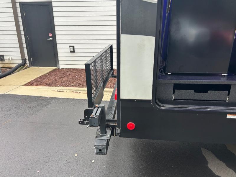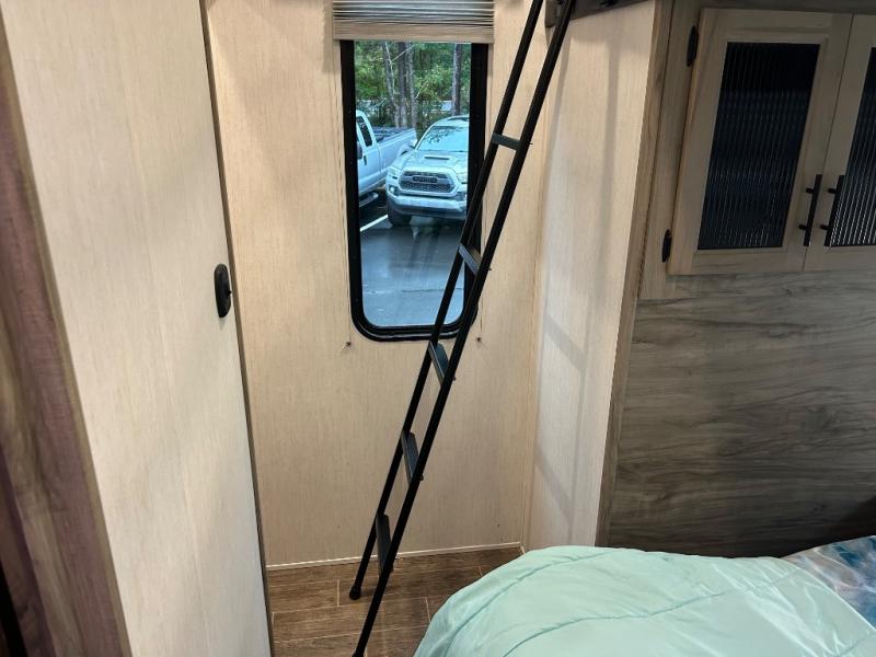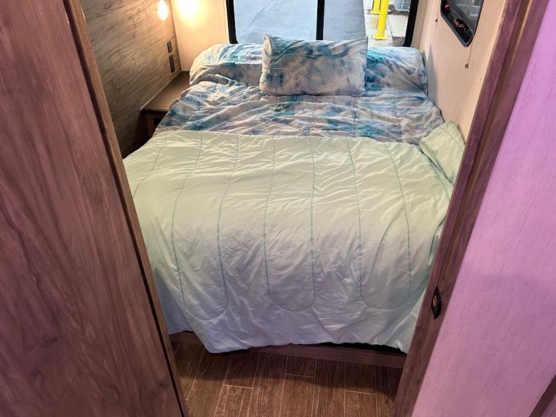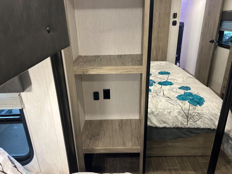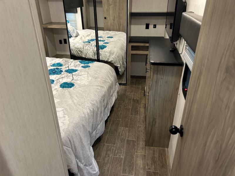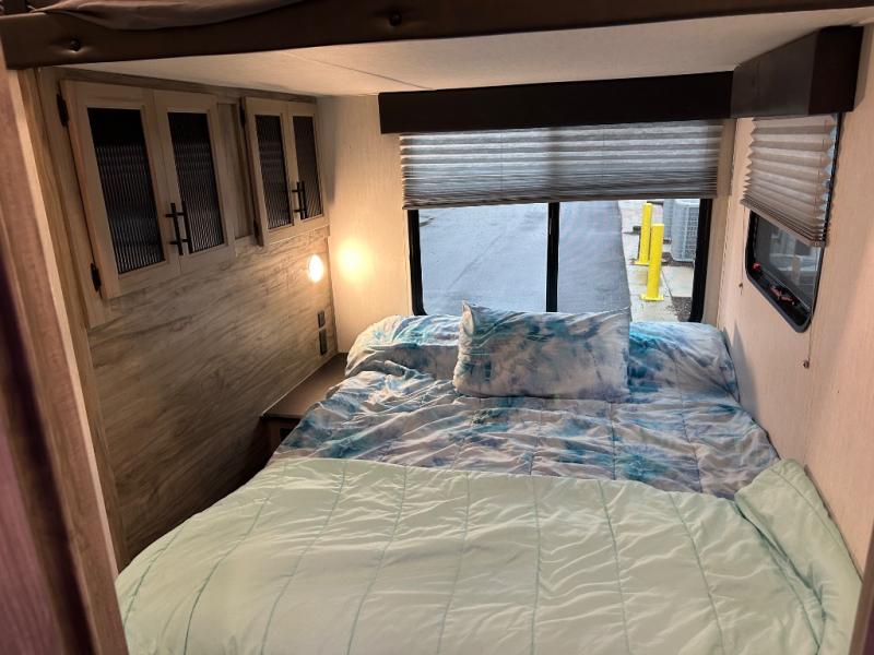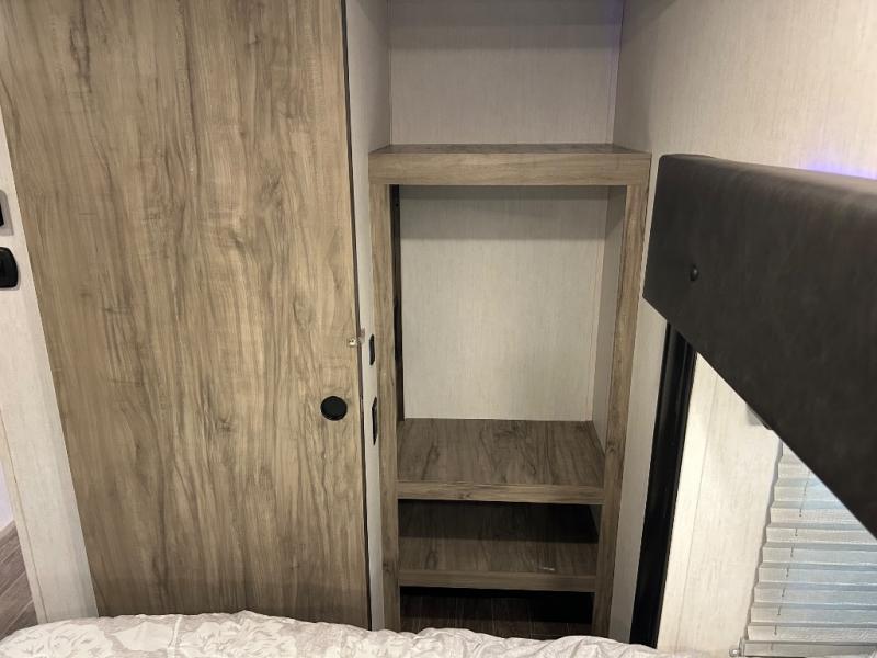 This Cherokee Arctic Wolf Suite fifth wheel is an excellent choice if you have a large family that wants to get away! Not only is there a private bedroom up front for you, but there is also a bedroom suite in the back. This suite has a 54" x 74" bed next to some wardrobe storage, a 60" x 80" loft above the bed with a ladder, a half bathroom all to itself, and the second exterior entry door. What a space! You'll also be highly impressed with the living area because it has a large slide that holds two sets of home theater seating with removable tables in front. Now you can sit down and enjoy dinner while you watch the optional residential-size LED TV that you added above the fireplace. The large pantry is another feature you'll appreciate since it can store all of the food needed to feed your group, and the Juice Pack 50W solar panel will help your unit stay powered wherever you camp.