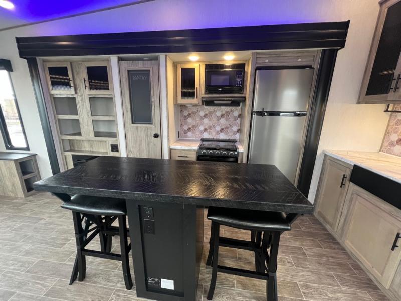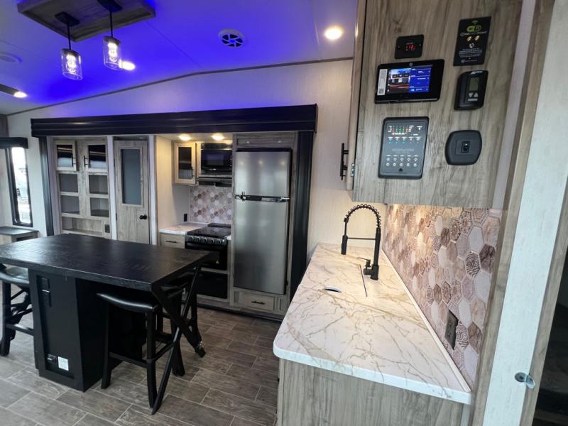 If you're ready to take a trip with the whole family, check out this Cherokee Arctic Wolf Suite fifth wheel! This unit has been uniquely designed with a middle private bunkhouse. A barn-style door separates this bunkhouse from the hallway, and if you go further down the hallway, you will find the front master bedroom which includes a desk/make-up area, a full-width closet with built-in shelves, a dresser with shoe storage, a king bed slide, and a closet prepped for a stackable washer/dryer. The living room is very comfortable for everyone with its two sets of home theater seating, tri-fold sofa, and fireplace, and you even have four bar stools around the kitchen island for a cozy snack area.