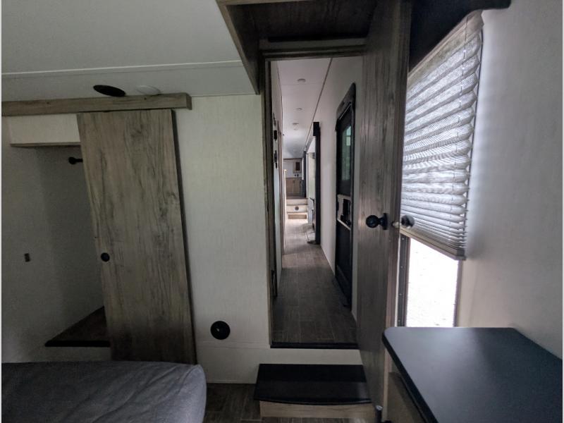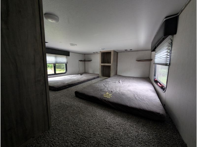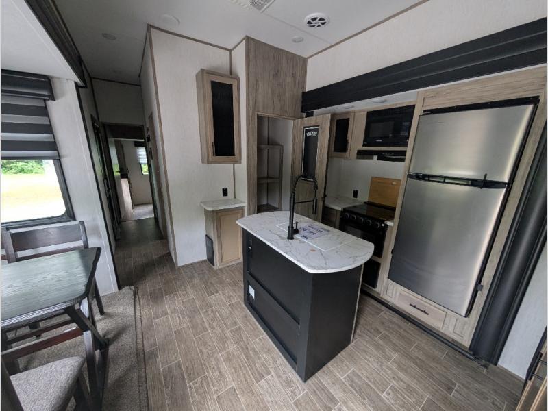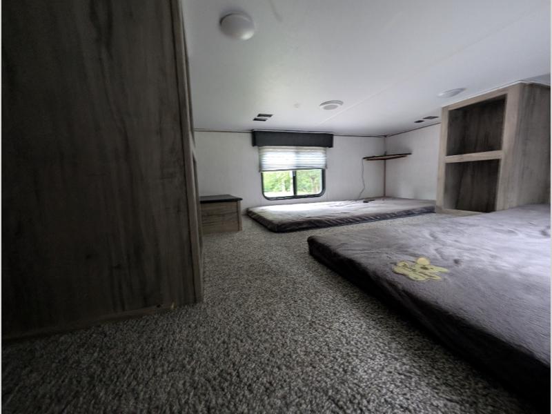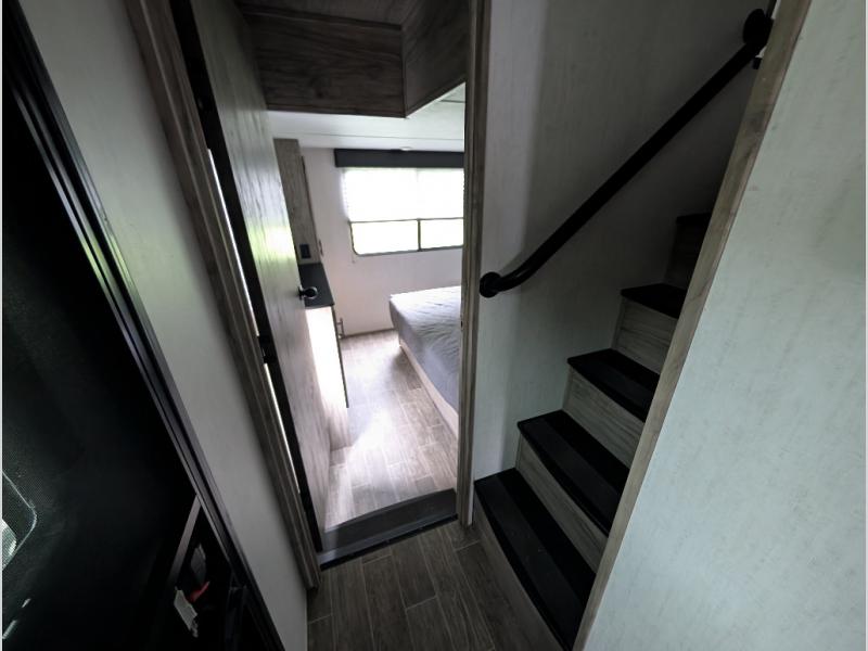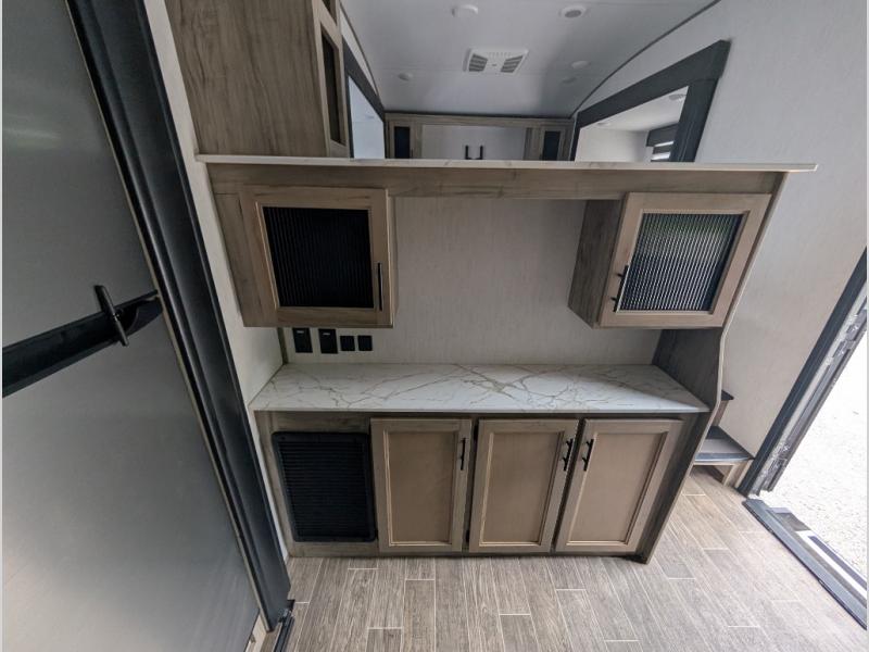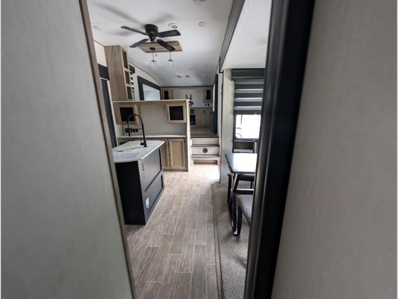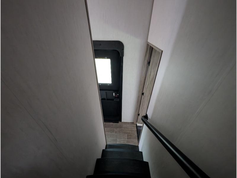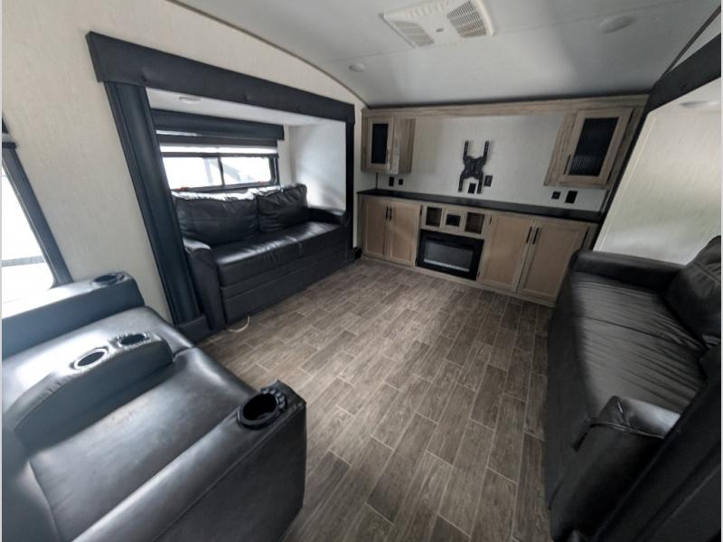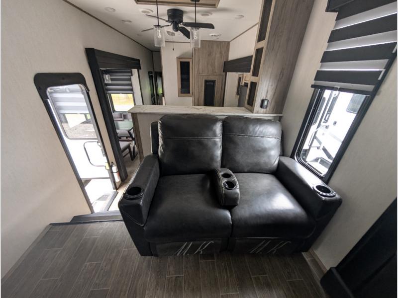 You won't believe how amazing this Cherokee Arctic Wolf Suite fifth wheel is until you see it for yourself! One thing that sets this unit a part from others is its great loft area that has stairs leading up to it. In the loft you will find two oversized bunk mats with shelves above, two storage spaces, and a TV hookup. Right below the loft is a rear private bedroom that has a king bed slide across from a dresser with shoe storage. This bedroom is even located right next to the second entry door, so you'll have easy access late at night. The kitchen is a great place to spend your time because it has an island with ceiling fan above, so you can stay cool while you work diligently preparing dinner. You'll also find residential convenience in the buffet and coffee bar. Opposing slides keep this space open, and there is another set of opposing slides in the front living room where you will find two tri-fold sofas, theater seating, and a fireplace.