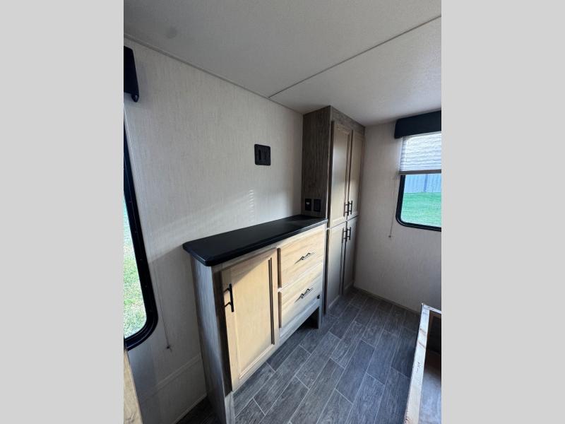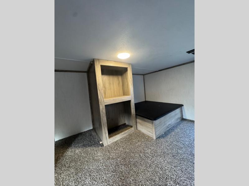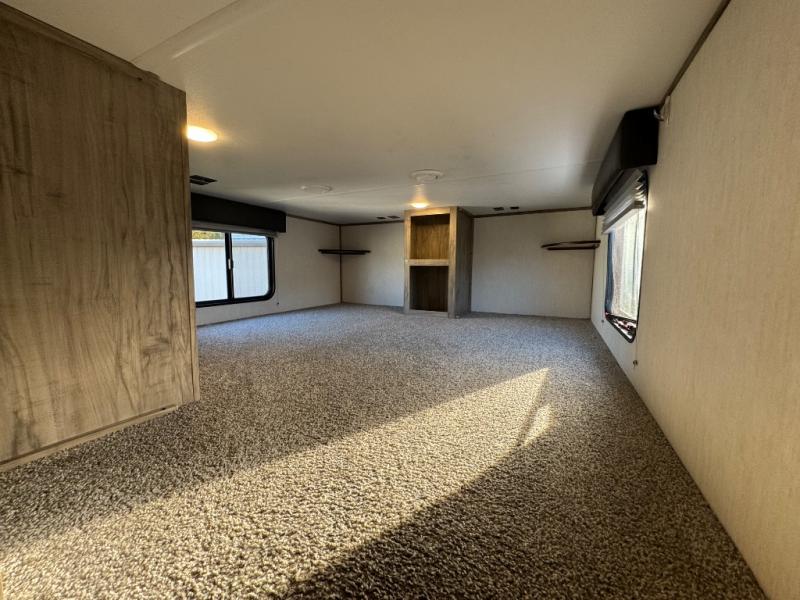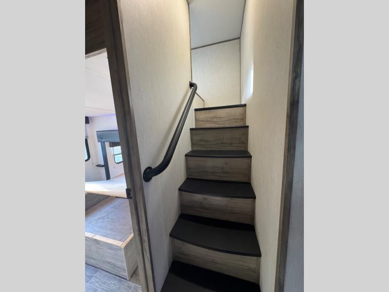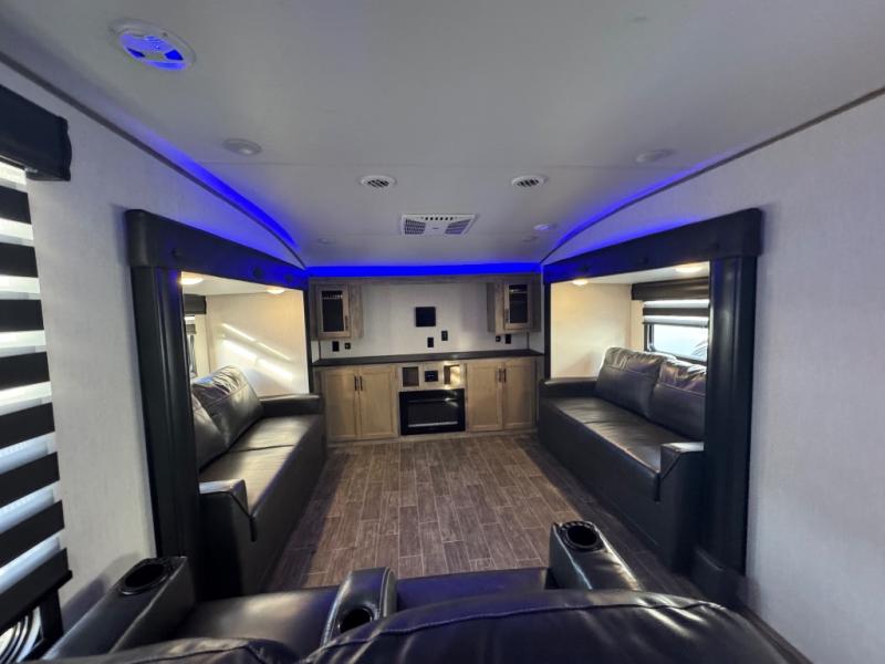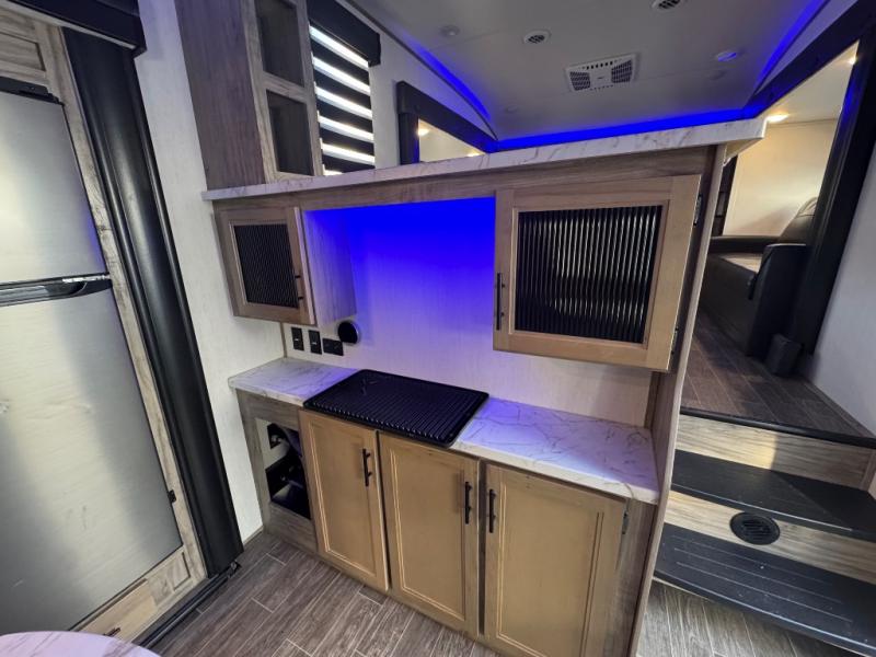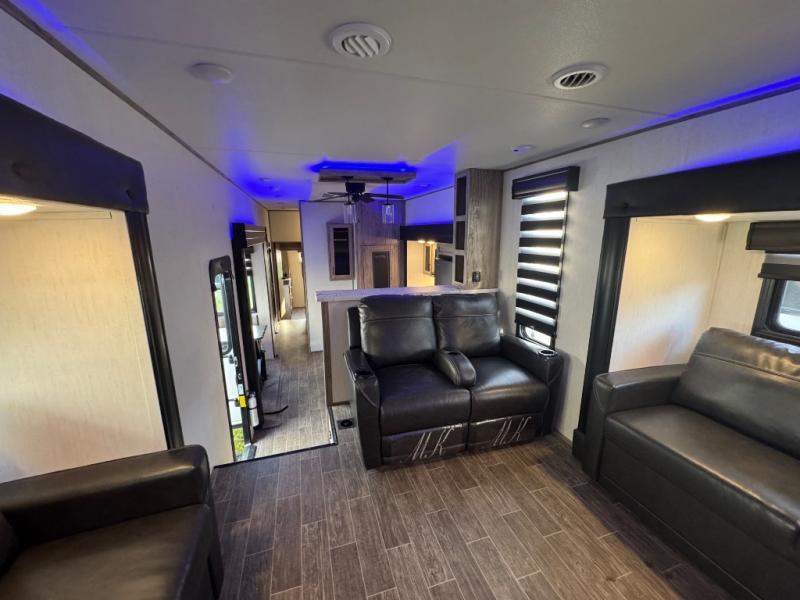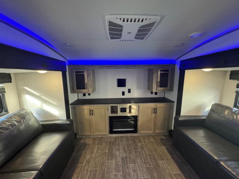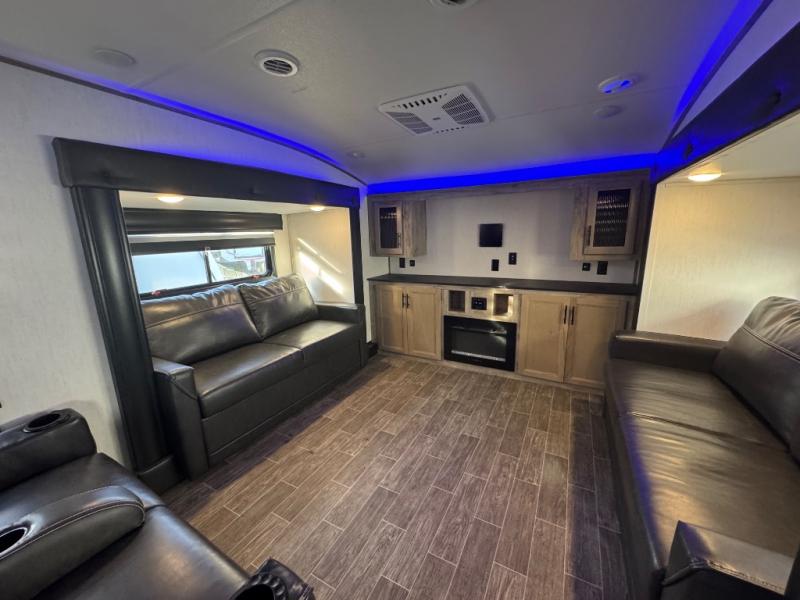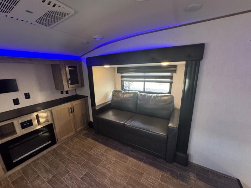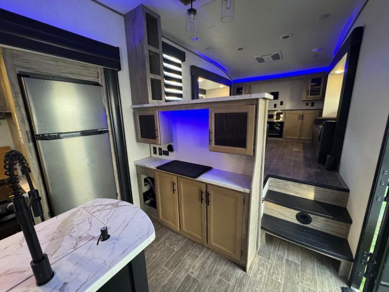 You won't believe how amazing this Cherokee Arctic Wolf Suite fifth wheel is until you see it for yourself! One thing that sets this unit a part from others is its great loft area that has stairs leading up to it. In the loft you will find two oversized bunk mats with shelves above, two storage spaces, and a TV hookup. Right below the loft is a rear private bedroom that has a king bed slide across from a dresser with shoe storage. This bedroom is even located right next to the second entry door, so you'll have easy access late at night. The kitchen is a great place to spend your time because it has an island with ceiling fan above, so you can stay cool while you work diligently preparing dinner. You'll also find residential convenience in the buffet and coffee bar. Opposing slides keep this space open, and there is another set of opposing slides in the front living room where you will find two tri-fold sofas, theater seating, and a fireplace.