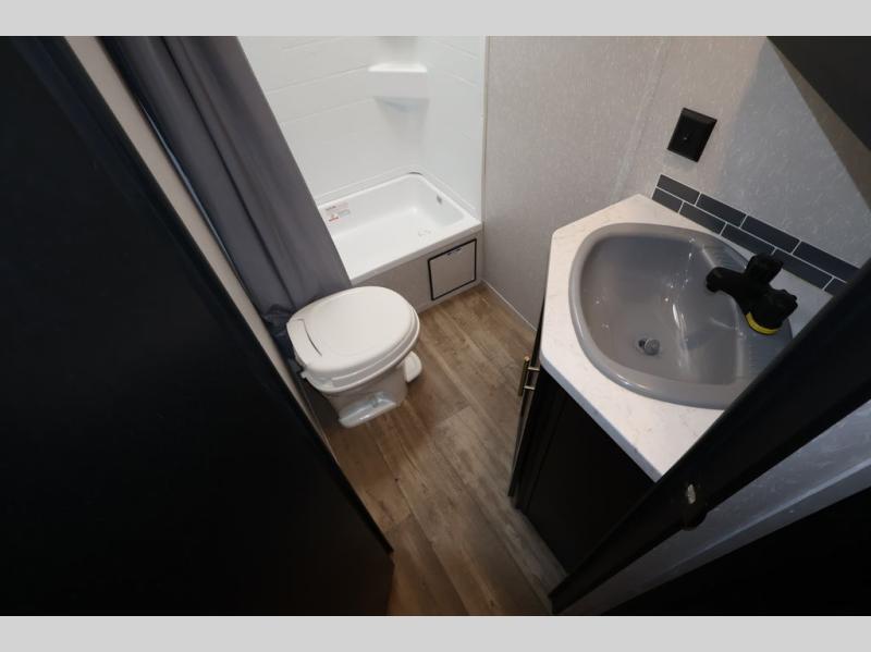 With this Cherokee Grey Wolf travel trailer, there are a set of double-size bunks that your kiddos are sure to love, and you will love having your own Cherokee Sleep System bed. The bed can be easily folded up to give you a full sofa. The location of the full bathroom in the back next to the bunk beds offers even more convenience, especially at night. This unit will give your larger family a great camping experience. You will find ample storage both inside and out with large overhead cabinets inside and wardrobes on either side of the front bed. On the outside, there are storage compartments for your exterior camping gear in both the front and rear making it easy to stow away outdoor camp chairs and games that you can enjoy while hanging out under the 15' power awning.