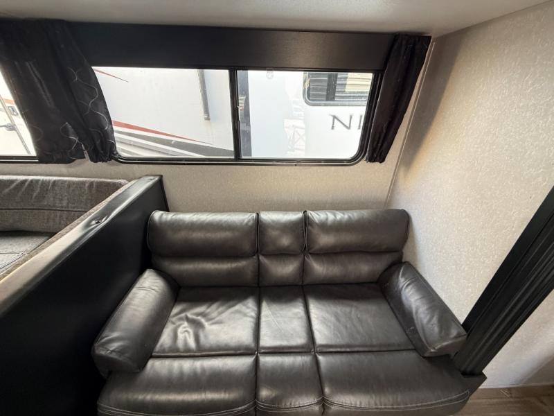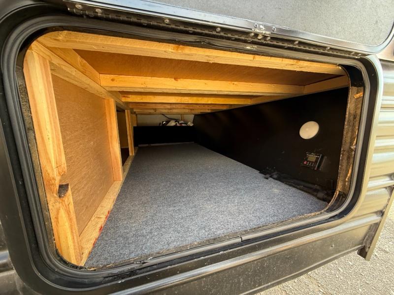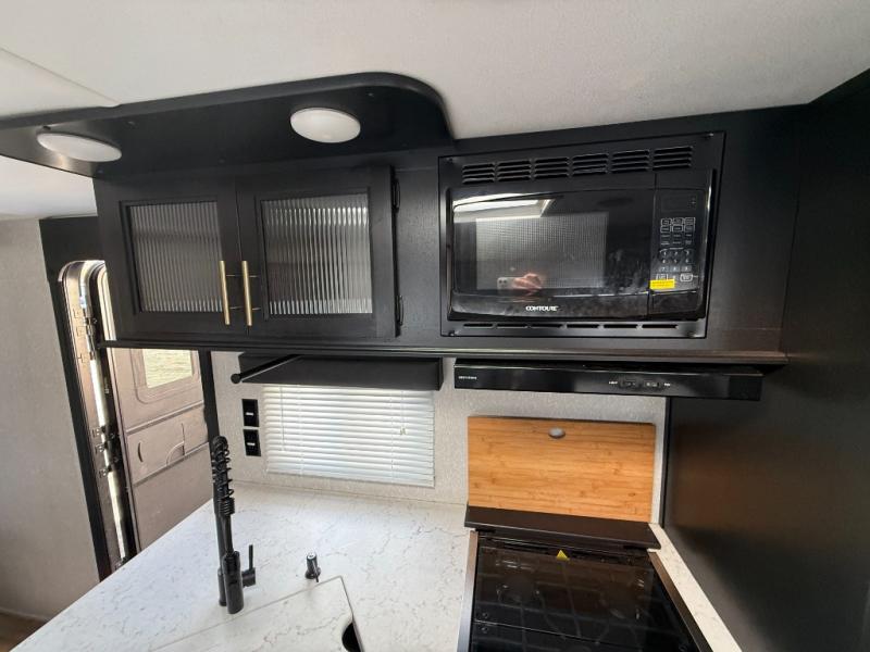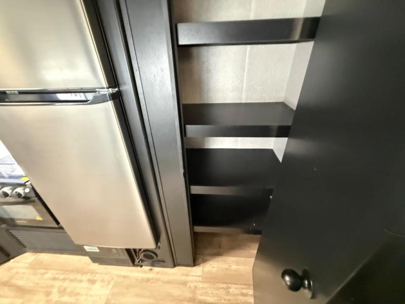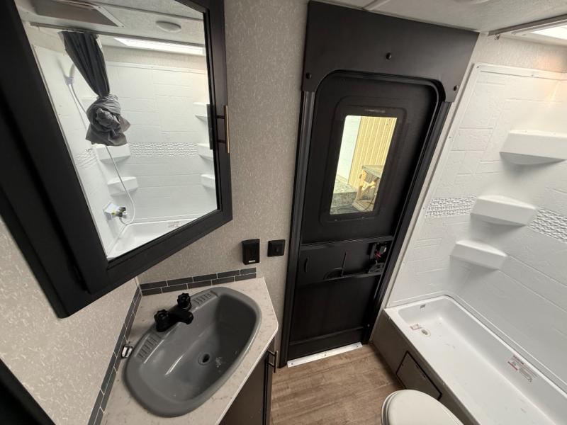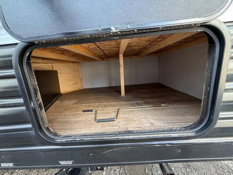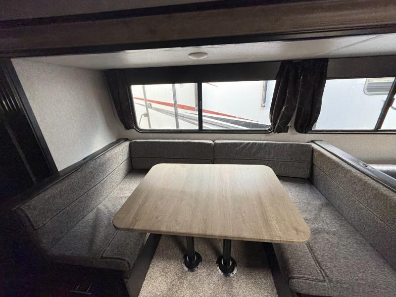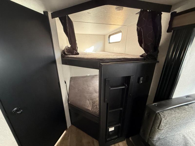 Come on inside this Cherokee Grey Wolf travel trailer and experience the convenience of a smooth flow of traffic in and out with two entry doors. The rear door leads into a full bath which is great for accessibility when outside and when you need to use the bathroom. Once inside, you will notice the large U-shaped dinette and the sofa which sit on the slide and create a spacious footprint for moving about, as well as great places to play games and socialize with your friends and family. A walk-in pantry provides plenty of storage allowing you to stock up on your favorite snacks and dry goods for your family adventure. At night, there is sleeping space for everyone between the double-size bunks and the queen-size bed, plus the furniture.