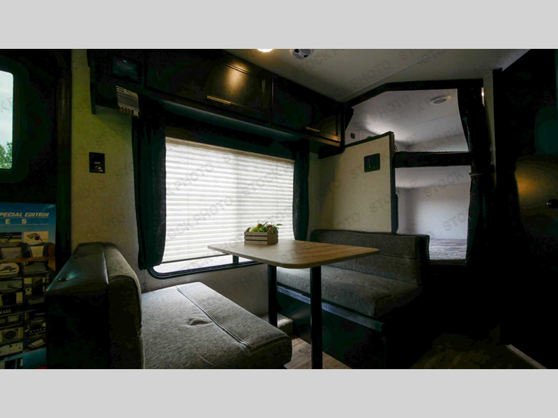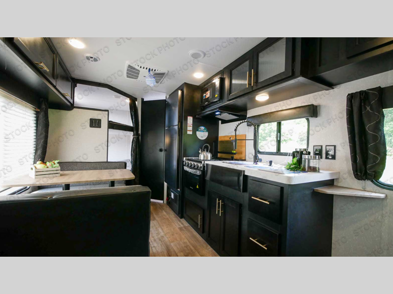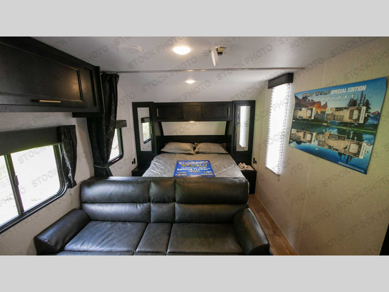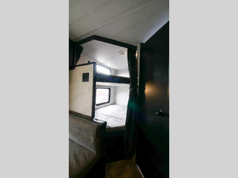 Enjoy cooking for nine in this Cherokee Grey Wolf travel trailer. With a three-burner cooktop, an overhead microwave, and an oven, you can easily cook just like home. The residential farm-style stainless steel sink makes cleaning your larger pots and pans quite simple, and the large overhead cabinets make storage an easy task as well. There is plenty of seating for the whole gang with the sofa and the booth dinette to play a game or two after you have enjoyed your delicious meal. Your kiddos are sure to love having their own set of double-size bunks conveniently located next to the rear bath, and you will love having your own front semi-private bedroom when you close the privacy curtain. You can also create some outdoor living space beneath the 15' power awning so that you can enjoy the great outdoors whether rain or shine!