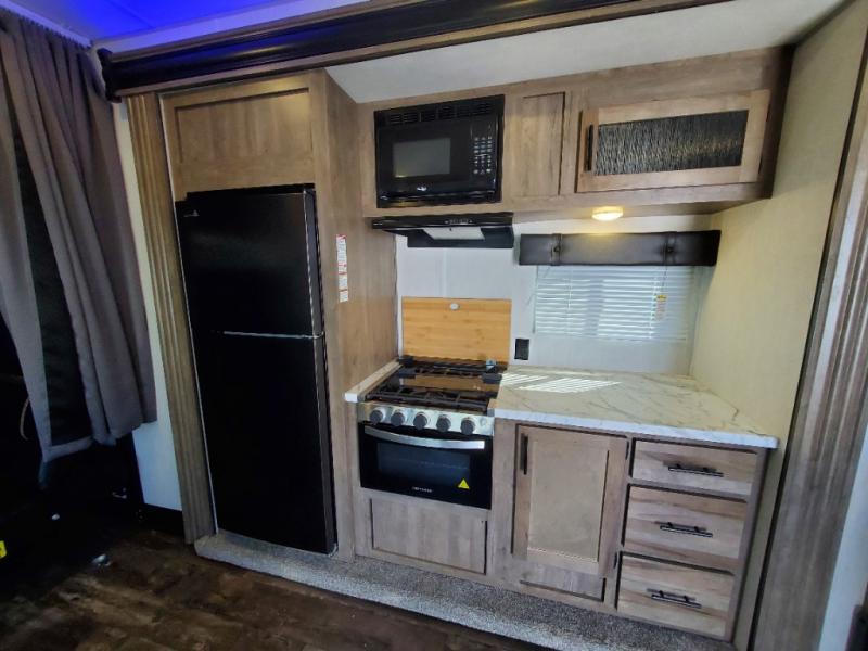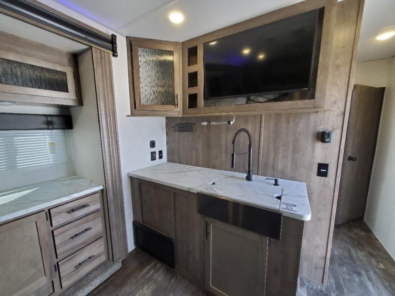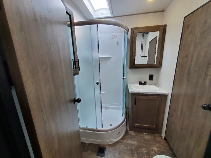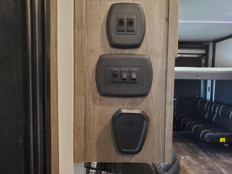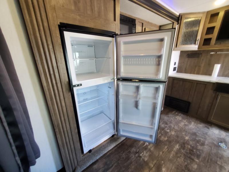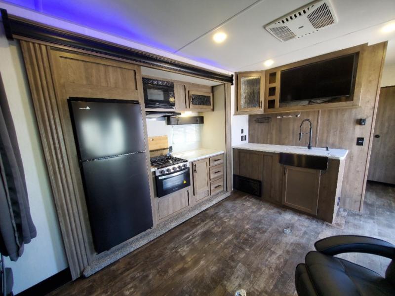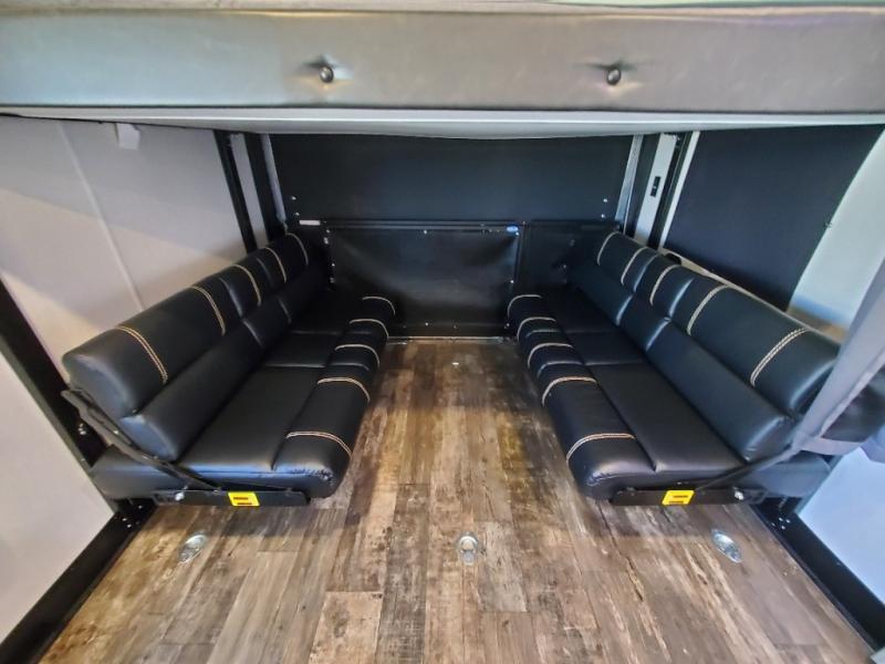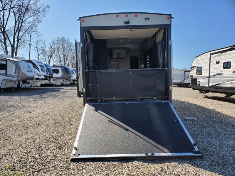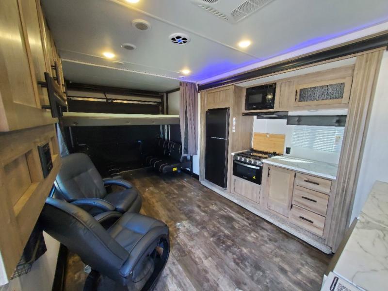 This toy hauler is ready to take you on your greatest adventures! With a 15' garage area, a 84" x 96" ramp door "party patio", and a reverse activated light and backup camera, you can easily load and unload your toys. The exterior 30 gallon fuel station will keep your toys fueled and the three burner cooktop and 10 cu. ft. refrigerator will keep your family fueled. Everyone can freshen up in the dual entry bathroom with the radius shower then play a few card games at the folding dinette table while also enjoying the entertainment center across from it. The front private bedroom welcomes you to lay your head on the 67" x 74" Wolf Pack king bed for a good night's rest!