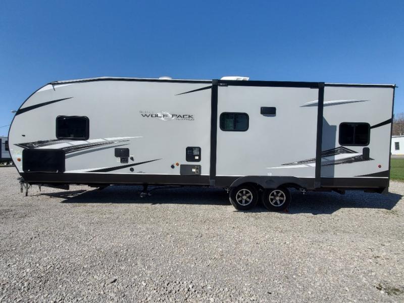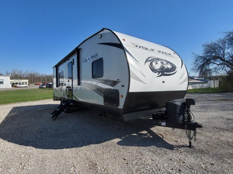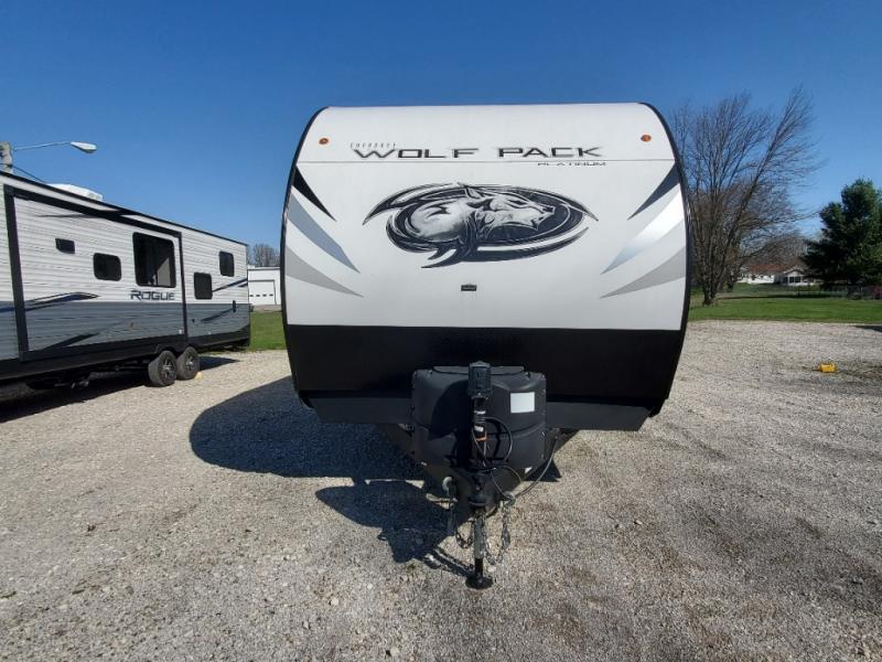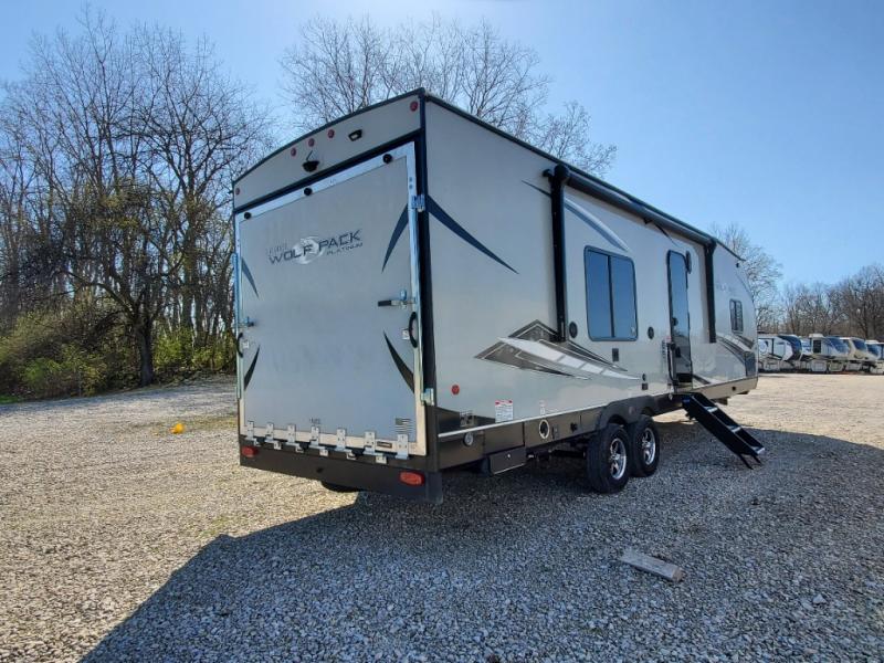 Run with the pack in any one of these Forest River Cherokee Wolf Pack toy haulers! They are affordable and versatile with a 102" widebody design to pack in all of the necessary features for a great adventure with your family and toys. The grey high gloss gel exterior will turn heads on the highway and the LED interior/exterior lights will make life easier. An outside shower with hot and cold water helps to keep the mud outside where it belongs. With an external 30 gallon fuel station, you won't have to worry about your toys being low on fuel. The Platinum package adds extra conveniences like a ramp door patio deck railing system, a Happijac bed lift system, and an industrial rubber garage floor on enclosed garage models. Come find the perfect model for you today!