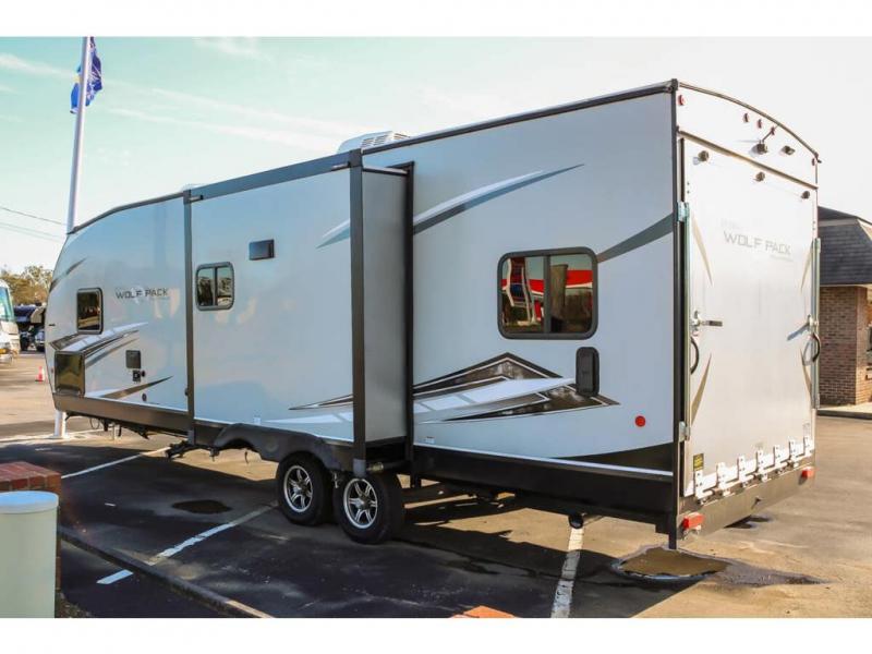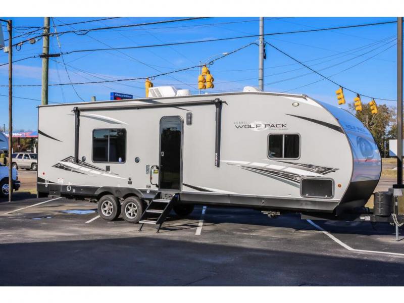 Run with the pack in any one of these Forest River Cherokee Wolf Pack toy haulers! They are affordable and versatile with a 102" widebody design to pack in all of the necessary features for a great adventure with your family and toys. The grey high gloss gel exterior will turn heads on the highway and the LED interior/exterior lights will make life easier. An outside shower with hot and cold water helps to keep the mud outside where it belongs. With an external 30 gallon fuel station, you won't have to worry about your toys being low on fuel. The Platinum package adds extra conveniences like a ramp door patio deck railing system, a Happijac bed lift system, and an industrial rubber garage floor on enclosed garage models. Come find the perfect model for you today!