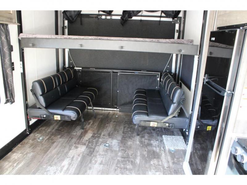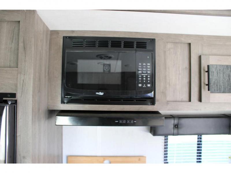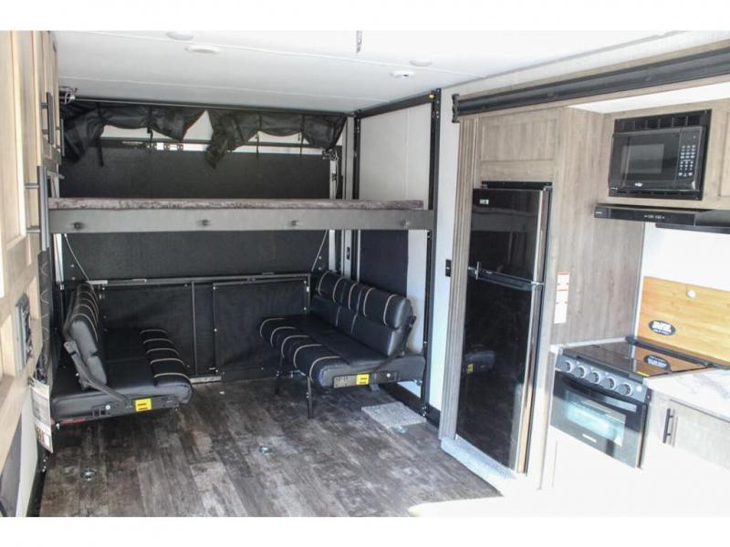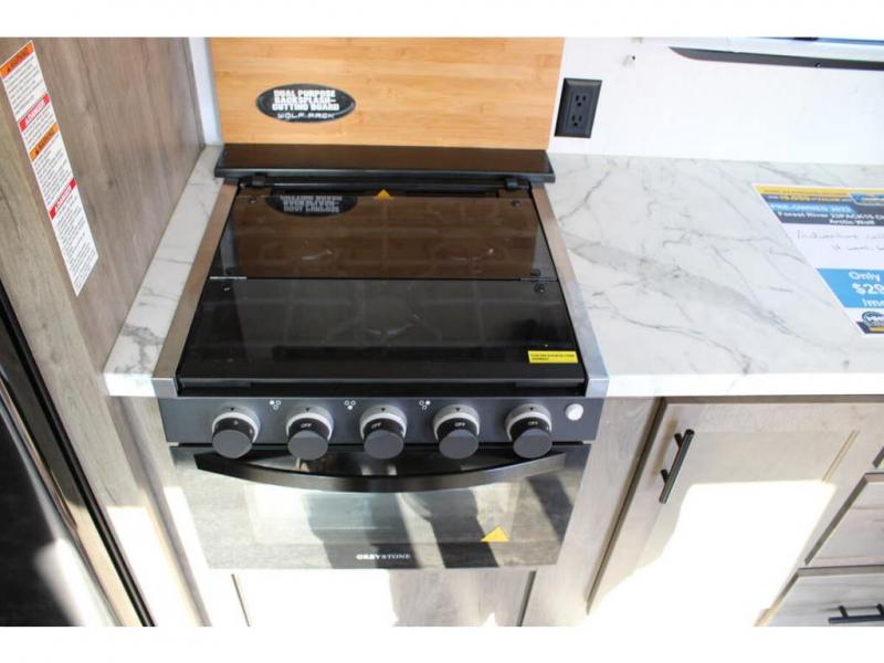 This toy hauler is ready to take you on your greatest adventures! With a 15' garage area, a 84" x 96" ramp door "party patio", and a reverse activated light and backup camera, you can easily load and unload your toys. The exterior 30 gallon fuel station will keep your toys fueled and the three burner cooktop and 10 cu. ft. refrigerator will keep your family fueled. Everyone can freshen up in the dual entry bathroom with the radius shower then play a few card games at the folding dinette table while also enjoying the entertainment center across from it. The front private bedroom welcomes you to lay your head on the 67" x 74" Wolf Pack king bed for a good night's rest!