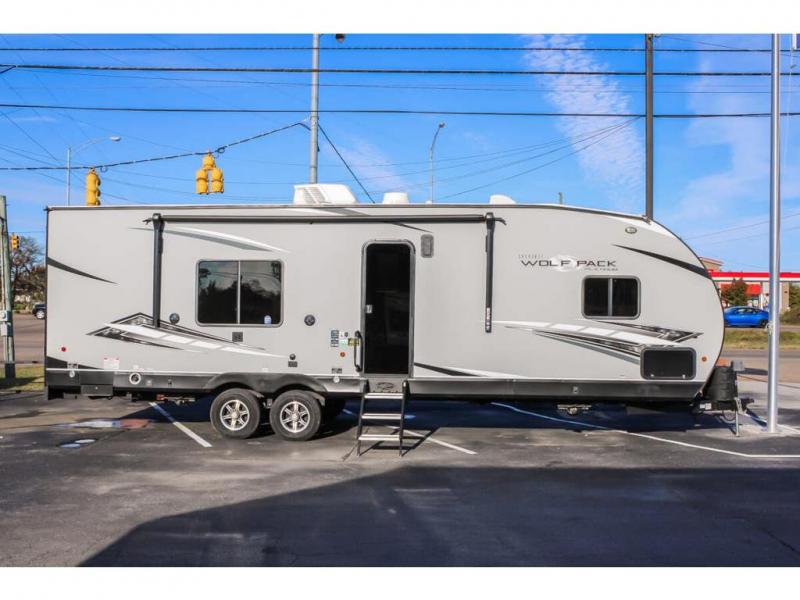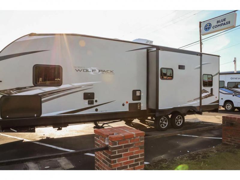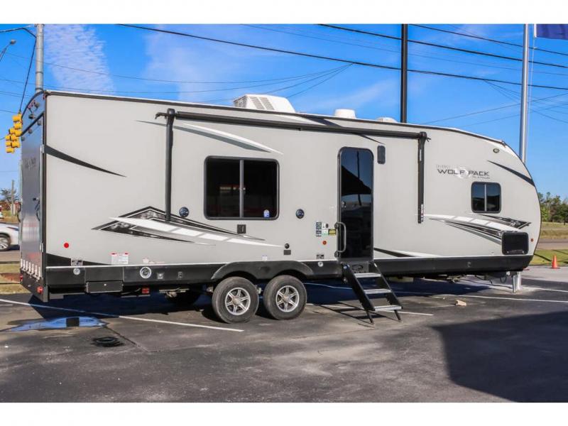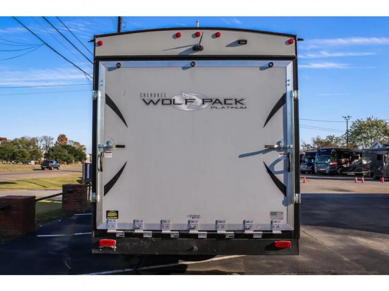Run with the pack in any one of these Forest River Cherokee Wolf Pack toy haulers! They are affordable and versatile with a 102" widebody design to pack in all of the necessary features for a great adventure with your family and toys. The grey high gloss gel exterior will turn heads on the highway and the LED interior/exterior lights will make life easier. An outside shower with hot and cold water helps to keep the mud outside where it belongs. With an external 30 gallon fuel station, you won't have to worry about your toys being low on fuel. The Platinum package adds extra conveniences like a ramp door patio deck railing system, a Happijac bed lift system, and an industrial rubber garage floor on enclosed garage models. Come find the perfect model for you today!