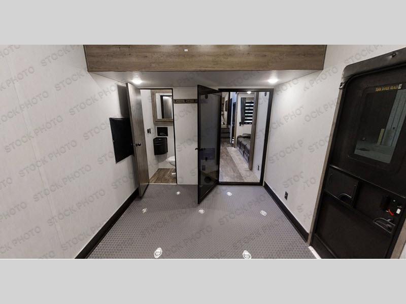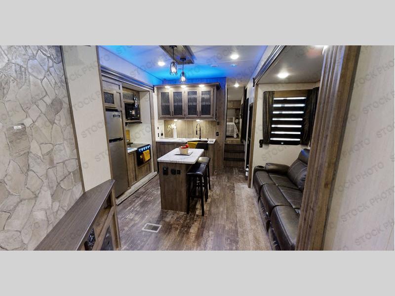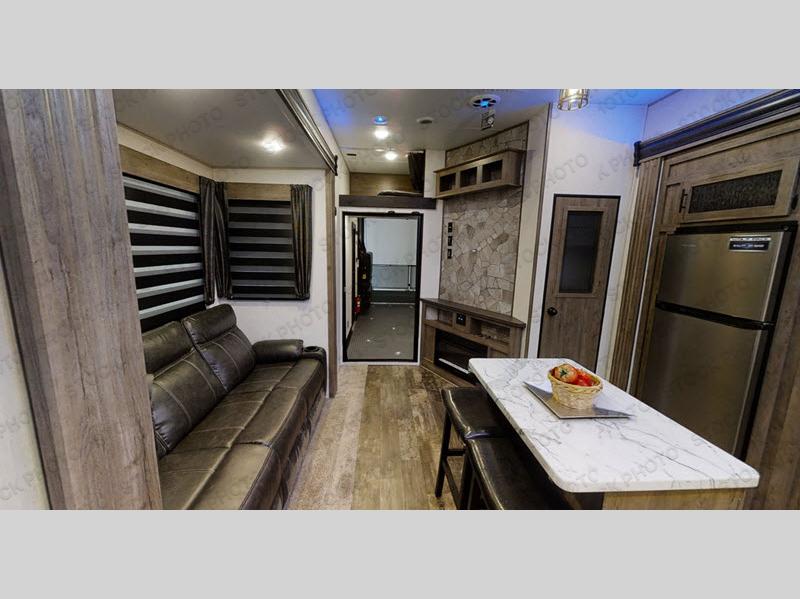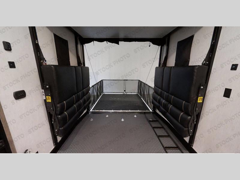 There's a comfortable sleeping spot for everyone in this toy hauler! Starting with the 67" x 74" Wolf Pack king bed in the front private bedroom which also has a wardrobe with a nightstand slide and an entrance into the dual entry bathroom. The 14' garage area has a folding dinette table below a Happijac bed lift system, a half bathroom, an area prepped to add an optional washer and dryer, and a loft above it all. You could even transform the party recliner sofa into an extra sleeping space when you aren't watching a movie or enjoying the fireplace at the entertainment center. The bar top island with stools is the perfect place to enjoy your morning coffee while reading the newspaper. A few exterior features you will enjoy include a 96" x 96" ramp door "party patio", a reverse activated light and backup camera, a front storage/generator prep area, dual entry doors, and two power awnings to protect you rain or shine!