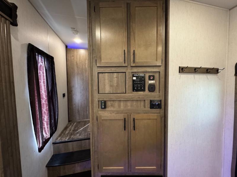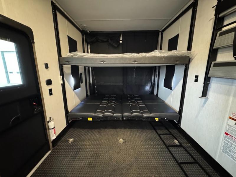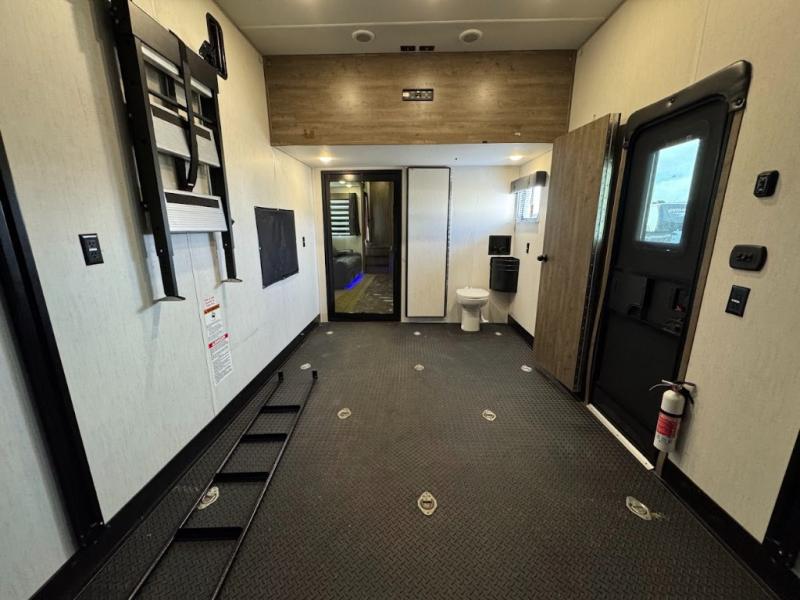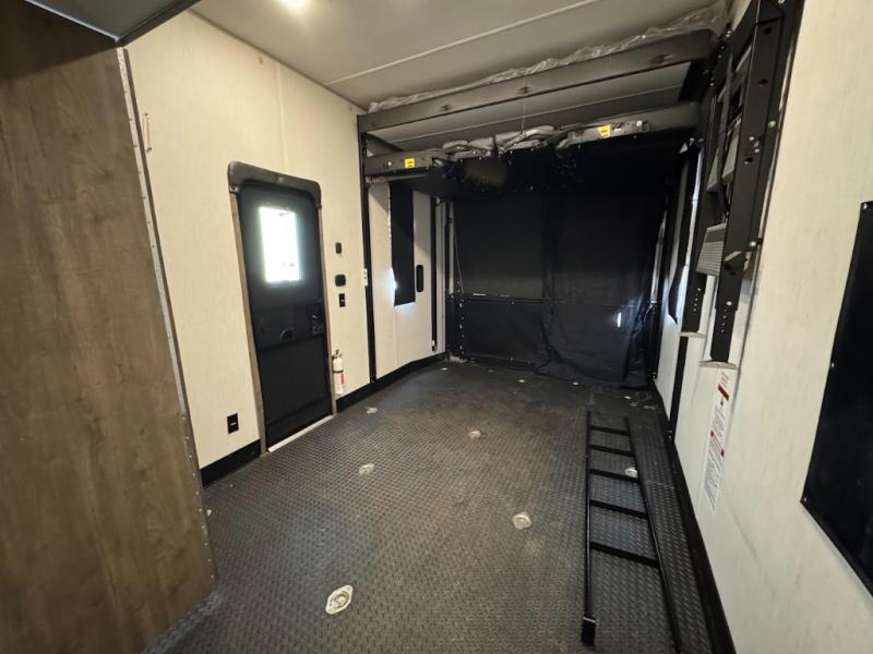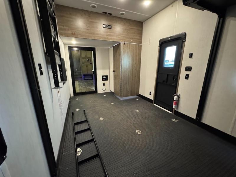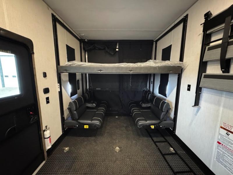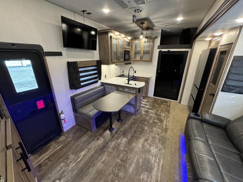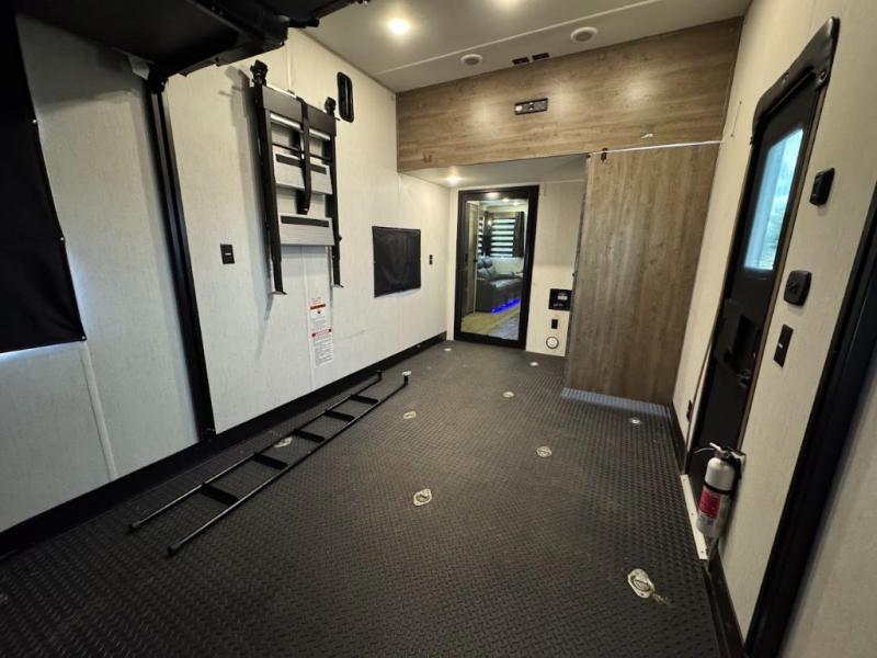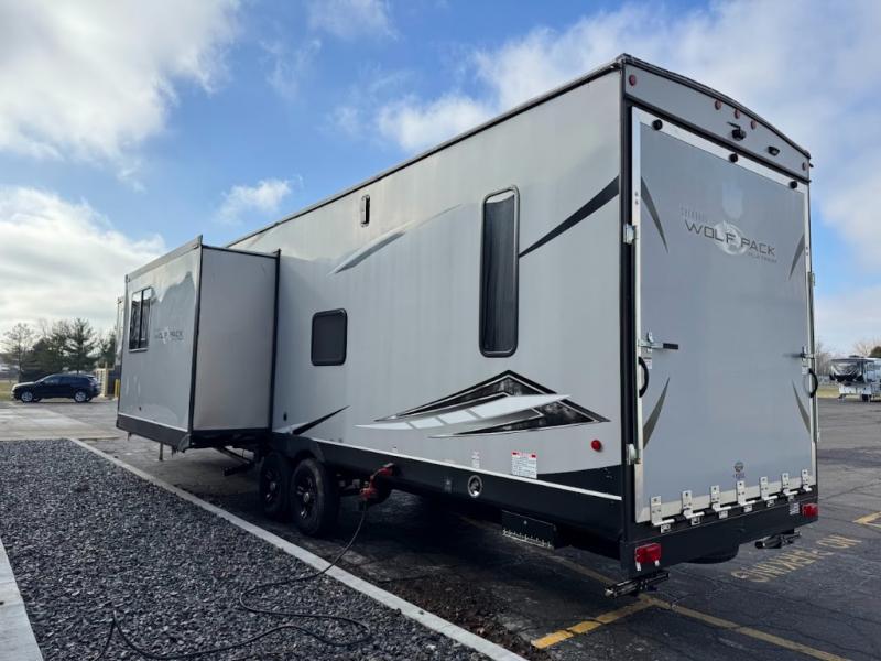 Come see all that this toy hauler has to offer! From the folding half bathroom walls in the 15' 10" garage to the outside kitchen protected by one of the two power awnings. The garage area also has a folding dinette table with a Happijac bed lift system above it, an area prepped to add an optional washer and dryer, and one of the dual entry doors to the unit. The little ones will love the loft above it all, and a 96" x 96" ramp door "party patio" will be perfect for guests. The open kitchen has everything you need to prepare your best home cooked meals including a large pantry and a table with bench seating to enjoy them at. Relax each night on the party recliner sofa while enjoying the fireplace across from it. The dual entry bathroom has a radius shower and is easy for everyone to access, especially those staying in the front private bedroom where there is a 67" x 74" Wolf Pack king bed to lay your head on at night and a wardrobe with nightstand slide!