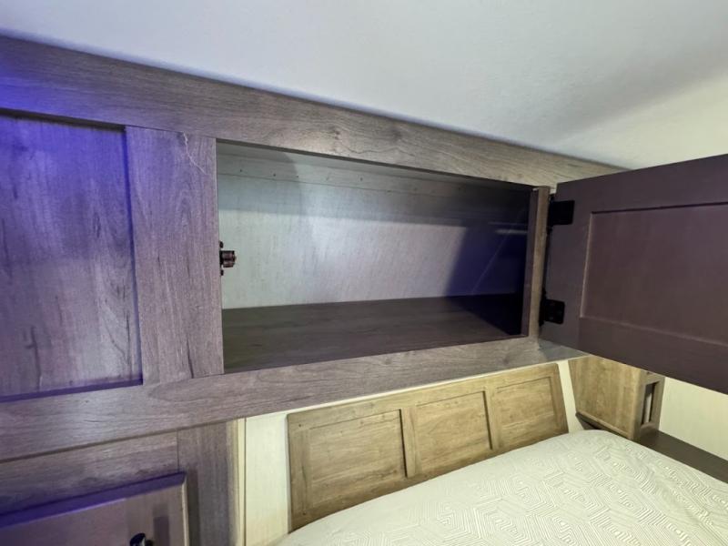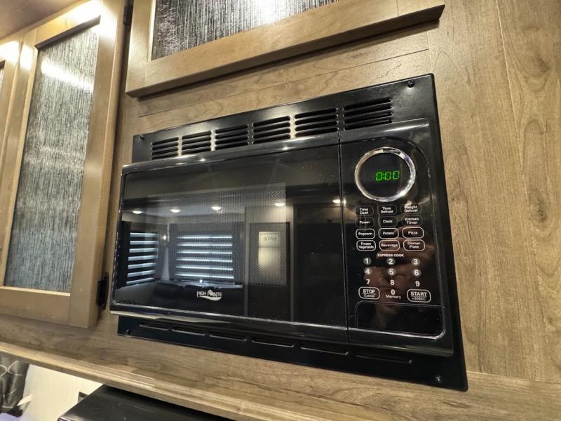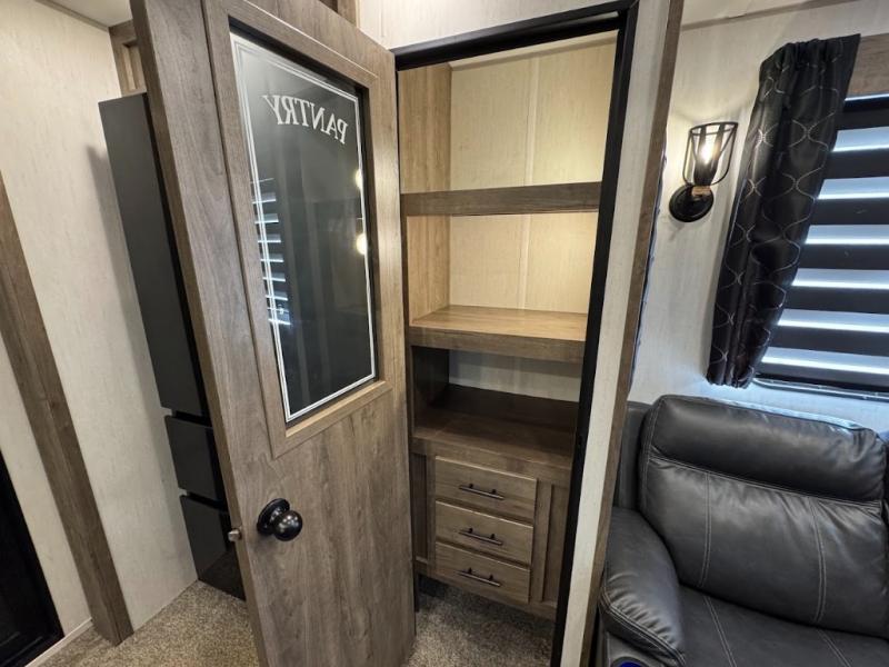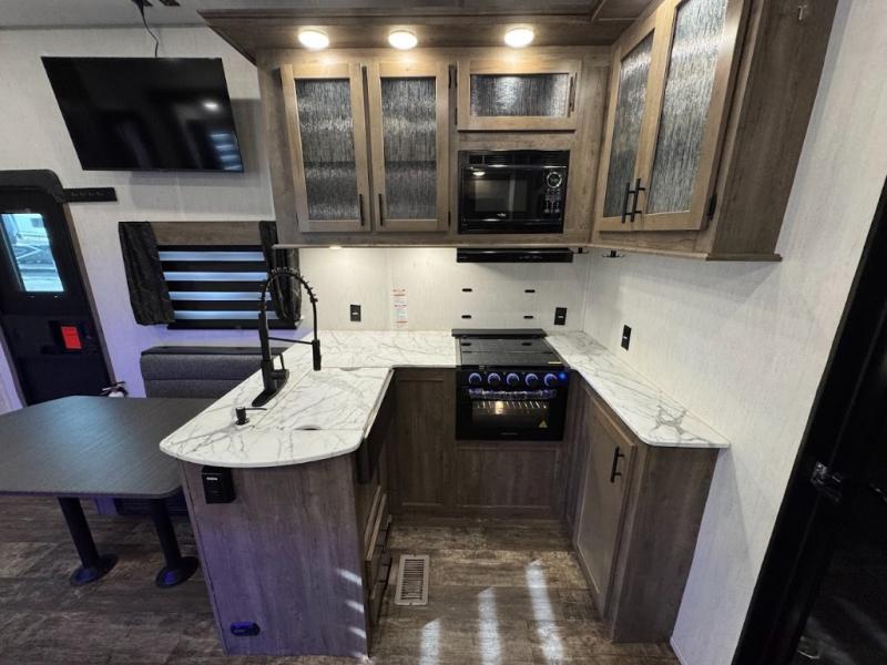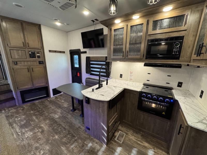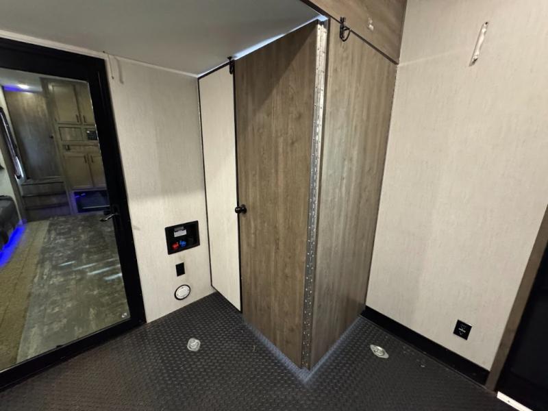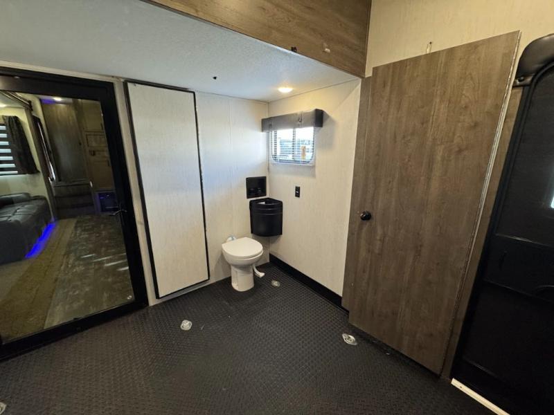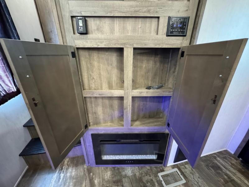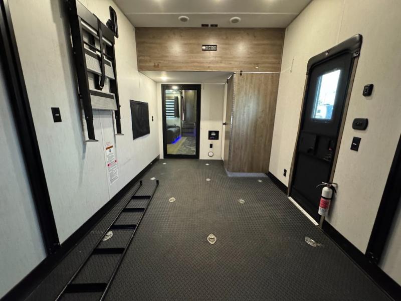 Come see all that this toy hauler has to offer! From the folding half bathroom walls in the 15' 10" garage to the outside kitchen protected by one of the two power awnings. The garage area also has a folding dinette table with a Happijac bed lift system above it, an area prepped to add an optional washer and dryer, and one of the dual entry doors to the unit. The little ones will love the loft above it all, and a 96" x 96" ramp door "party patio" will be perfect for guests. The open kitchen has everything you need to prepare your best home cooked meals including a large pantry and a table with bench seating to enjoy them at. Relax each night on the party recliner sofa while enjoying the fireplace across from it. The dual entry bathroom has a radius shower and is easy for everyone to access, especially those staying in the front private bedroom where there is a 67" x 74" Wolf Pack king bed to lay your head on at night and a wardrobe with nightstand slide!