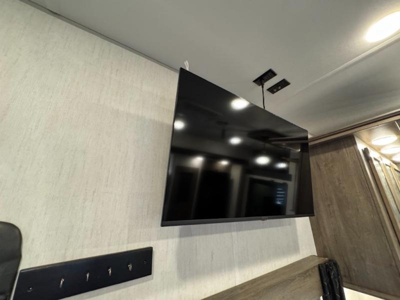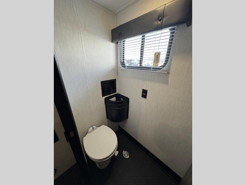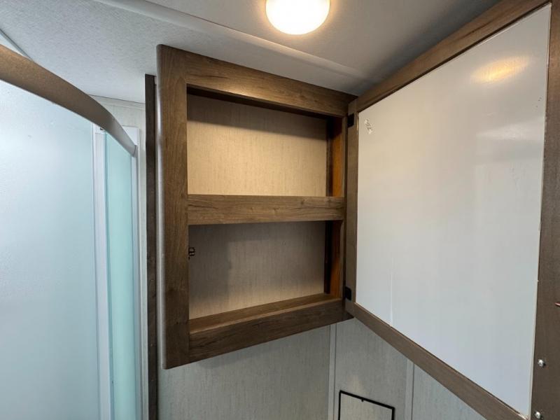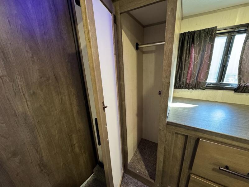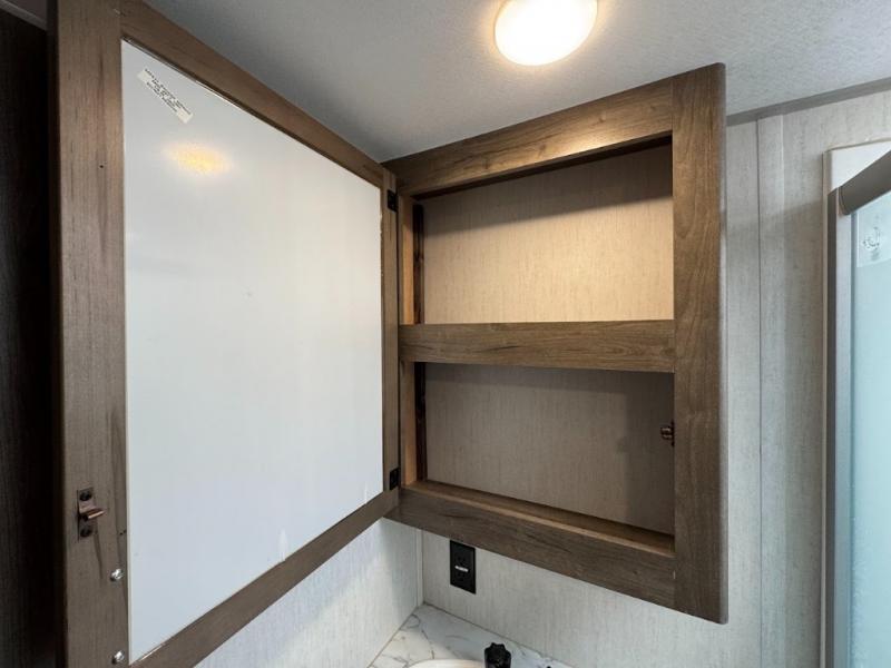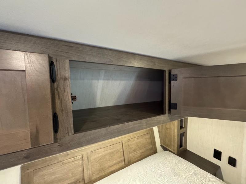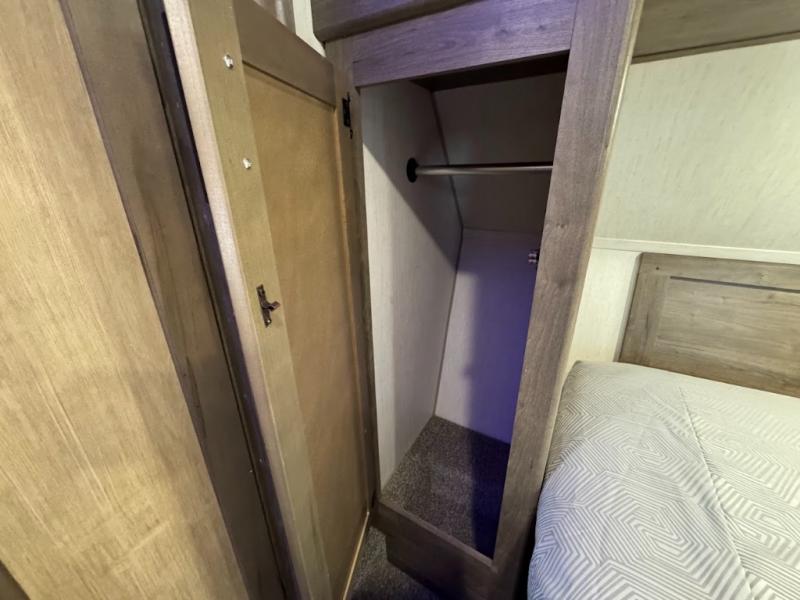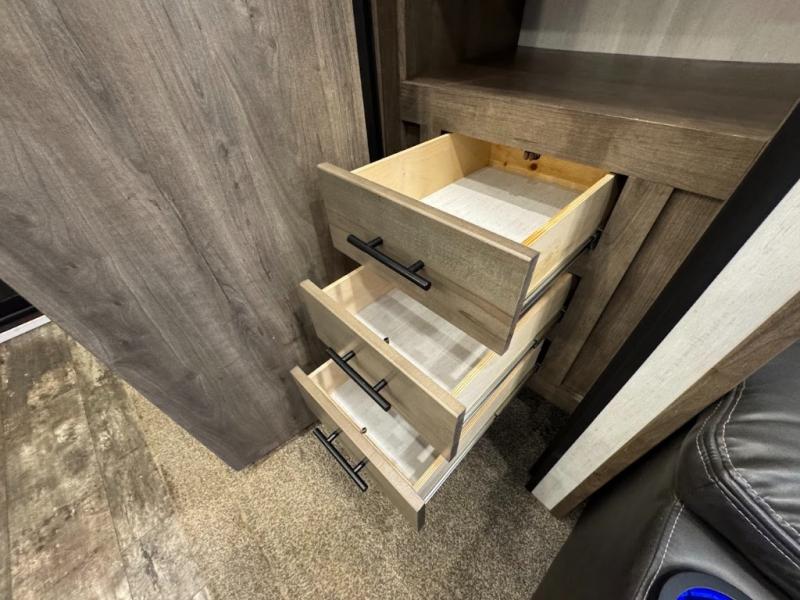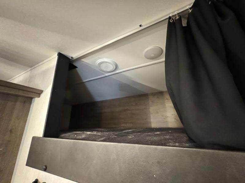 Come see all that this toy hauler has to offer! From the folding half bathroom walls in the 15' 10" garage to the outside kitchen protected by one of the two power awnings. The garage area also has a folding dinette table with a Happijac bed lift system above it, an area prepped to add an optional washer and dryer, and one of the dual entry doors to the unit. The little ones will love the loft above it all, and a 96" x 96" ramp door "party patio" will be perfect for guests. The open kitchen has everything you need to prepare your best home cooked meals including a large pantry and a table with bench seating to enjoy them at. Relax each night on the party recliner sofa while enjoying the fireplace across from it. The dual entry bathroom has a radius shower and is easy for everyone to access, especially those staying in the front private bedroom where there is a 67" x 74" Wolf Pack king bed to lay your head on at night and a wardrobe with nightstand slide!