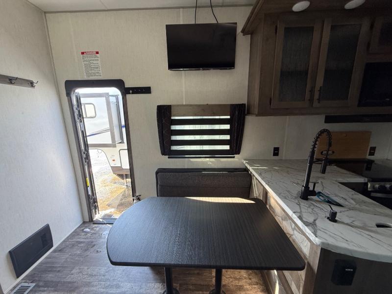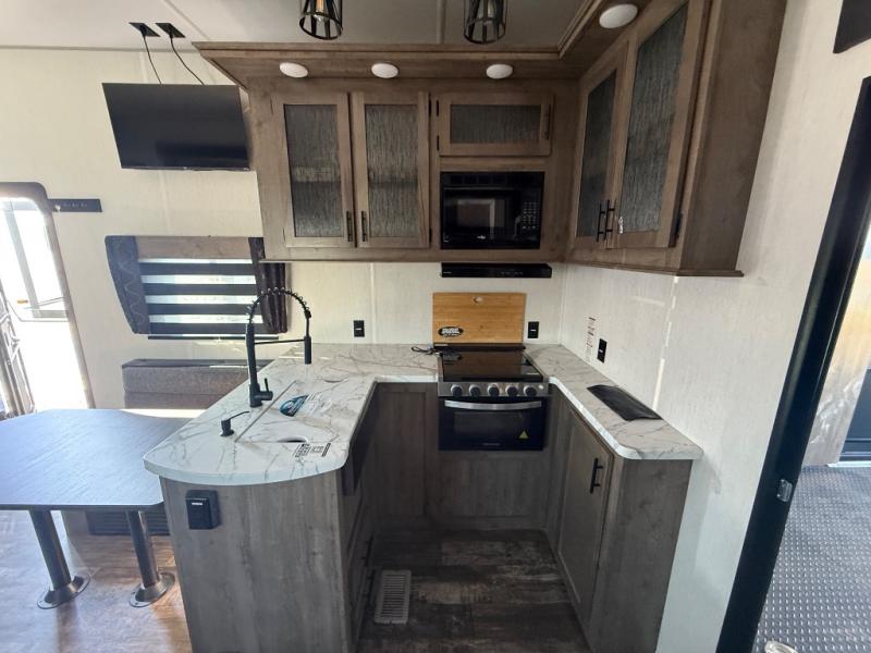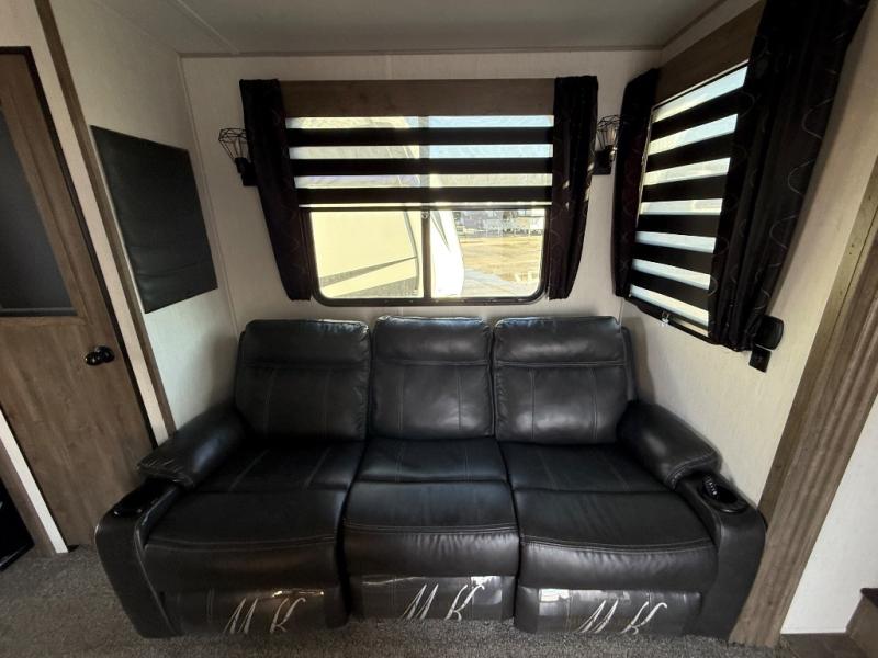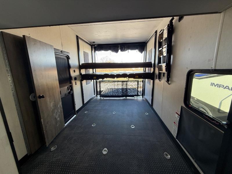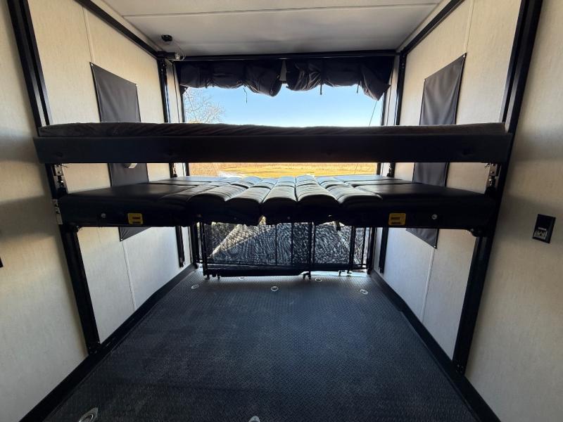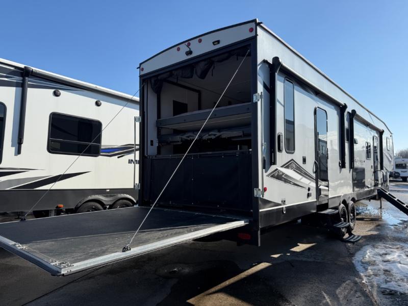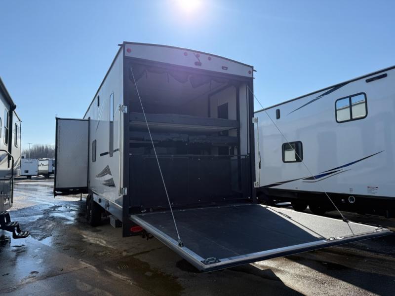 Come see all that this toy hauler has to offer! From the folding half bathroom walls in the 15' 10" garage to the outside kitchen protected by one of the two power awnings. The garage area also has a folding dinette table with a Happijac bed lift system above it, an area prepped to add an optional washer and dryer, and one of the dual entry doors to the unit. The little ones will love the loft above it all, and a 96" x 96" ramp door "party patio" will be perfect for guests. The open kitchen has everything you need to prepare your best home cooked meals including a large pantry and a table with bench seating to enjoy them at. Relax each night on the party recliner sofa while enjoying the fireplace across from it. The dual entry bathroom has a radius shower and is easy for everyone to access, especially those staying in the front private bedroom where there is a 67" x 74" Wolf Pack king bed to lay your head on at night and a wardrobe with nightstand slide!