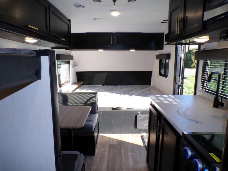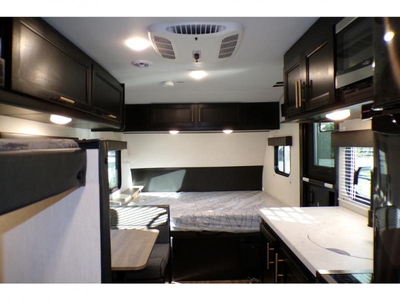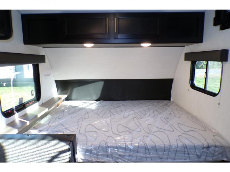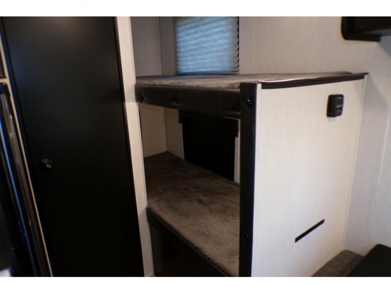 What I liked most: You can see a lot of thought has gone into this small end camper. The bunks and bed have been placed with space efficiency. The storage throughout actually has some nice depth.