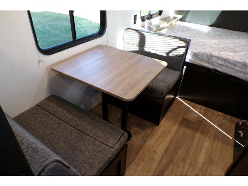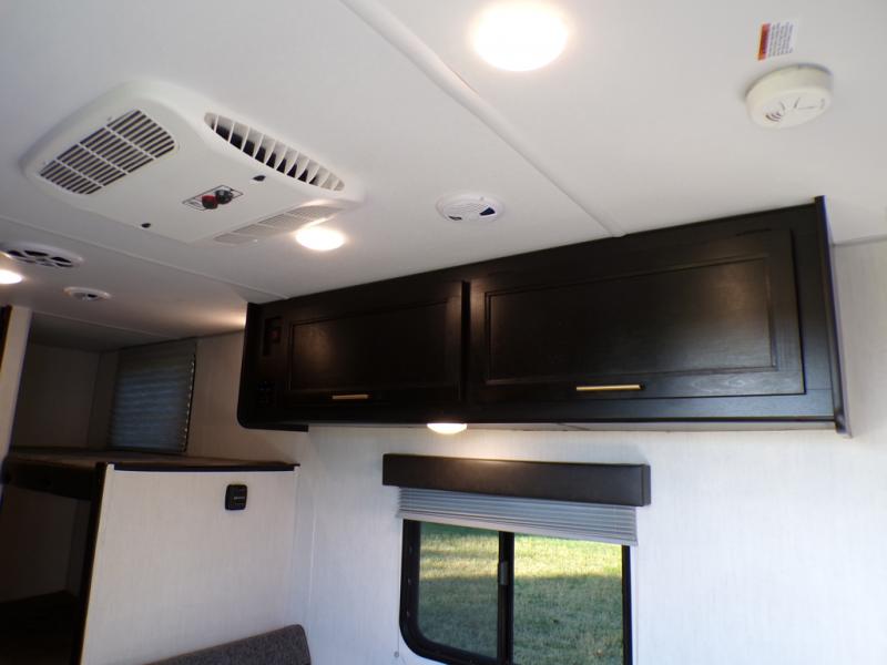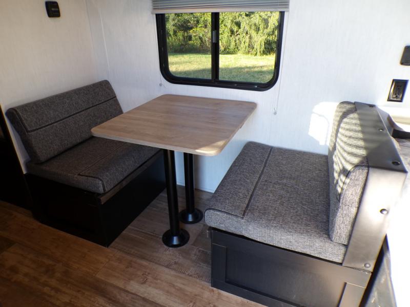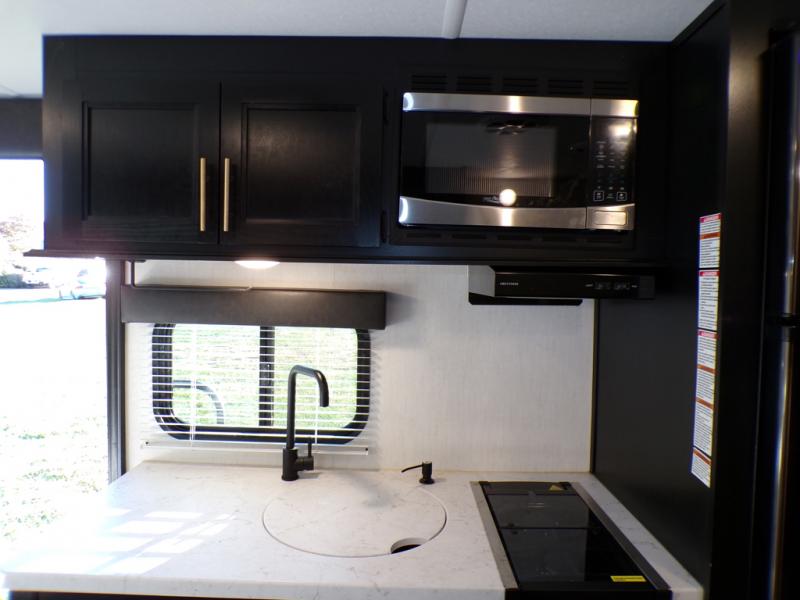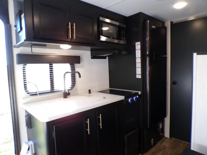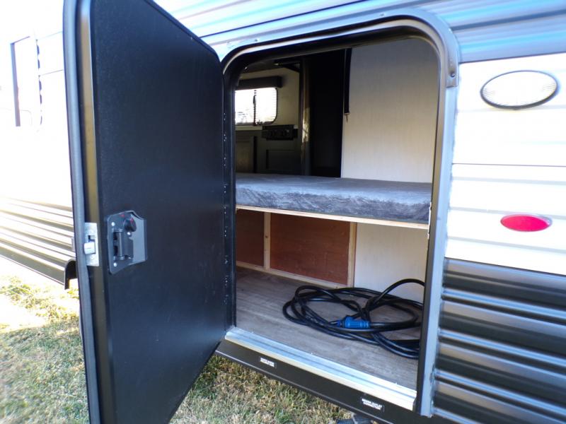 The whole family can sleep comfortably in this travel trailer! It has a set of bunk beds for the kids to sleep on with a TV mount location for extra entertainment, and you can sleep comfortably on the front queen bed with overhead cabinets and a shelf. There is even an exterior pack and play door that accesses the storage space under the bottom bunk. The chef will enjoy preparing their best home cooked meals either indoors with the high output cooktop or at the outside mini kitchen while staying protected by the 12' power awning, plus you have an outside TV mount location for added entertainment while you cook!