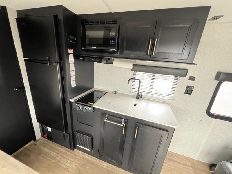 You will experience versatile living in this travel trailer with the Cherokee Sleep System! It lets you easily convert the front queen bed into a comfortable sofa to sit on during the day. Freshen up each morning in the full rear bathroom with the tub/shower and large sink with cabinet storage below it and mirror above it. Fill your bellies with the perishables stored in the 11 cu. ft. Cannon high efficiency refrigerator and cook them on the high output cooktop then enjoy them at the booth dinette. You could even prepare a meal while breathing in some fresh air at the outside mini kitchen while staying protected by the 12' power awning. Easily store all of your outdoor gear in the outside storage area too!