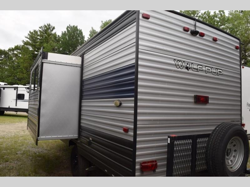 Each one of these Forest River Cherokee Wolf Pup travel trailers and toy haulers are lightweight and easy to tow! They are fully self contained with ample tank capacities, an abundance of storage space, and filled with at home amenities. The aerodynamic smooth radius front profile, the Power Gear frame technology, and the space saver rail design make them easier to maneuver. You will also appreciate the seamless roofing membrane with heat reflectivity to keep the sun from making your unit a hot box. The tongue and groove plywood flooring will hold up for years of fun and the USB charging stations help to keep your electronics at 100% while you're away. Come find the best model for you today!
