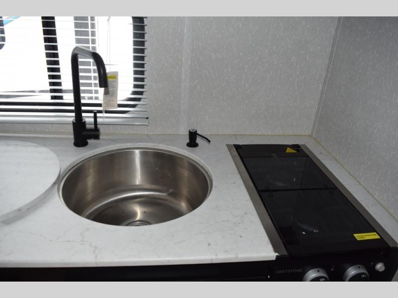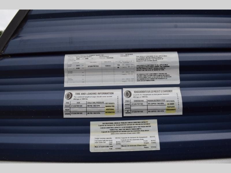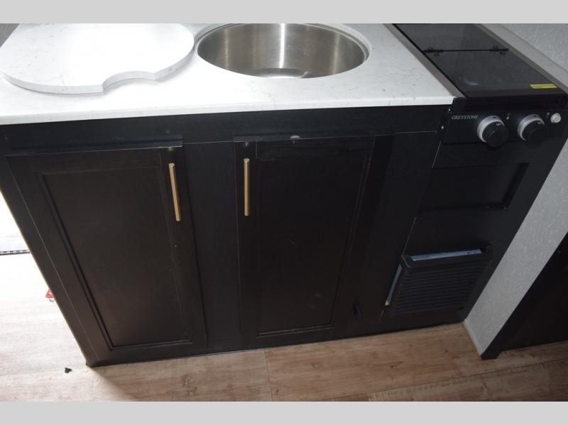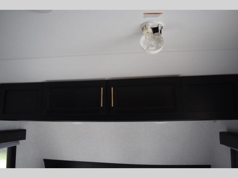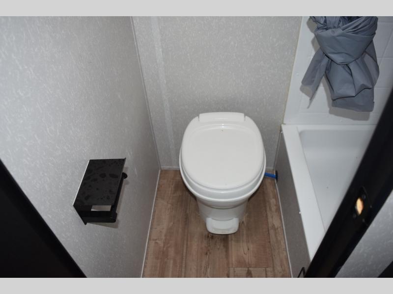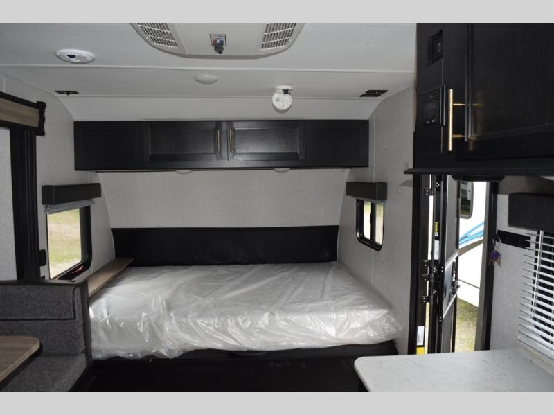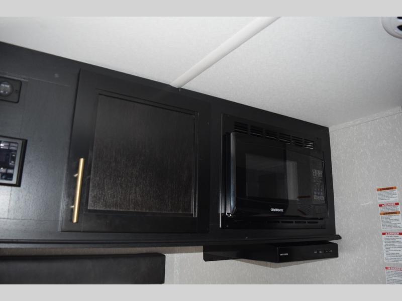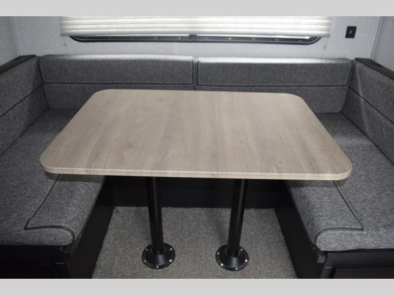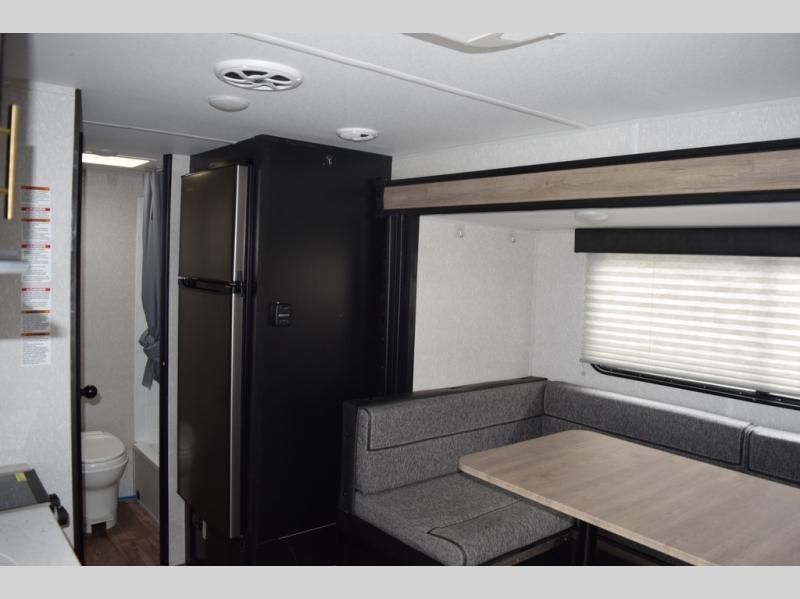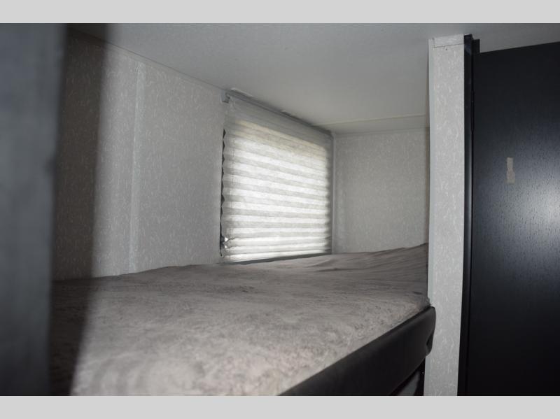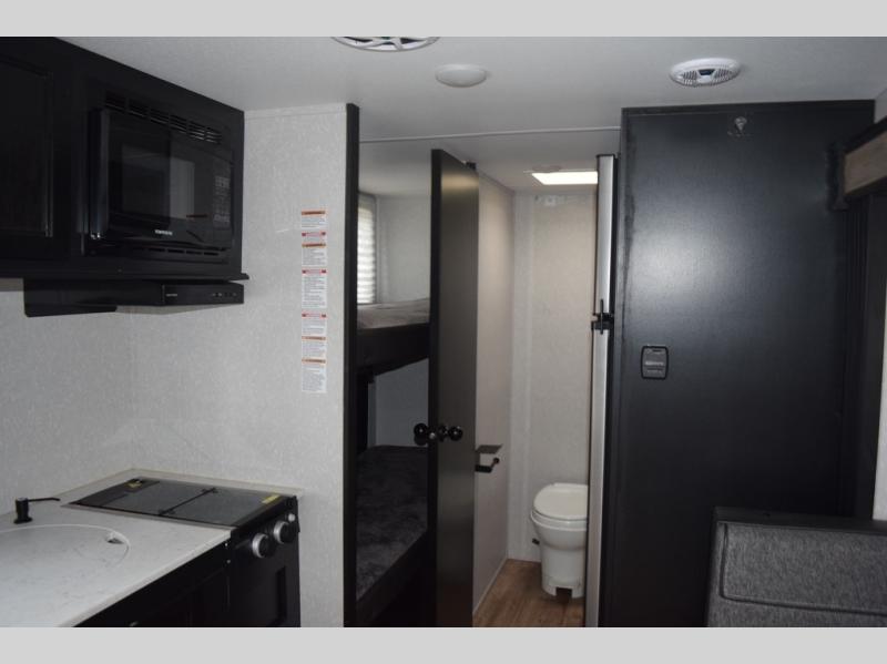 This family travel trailer is ready to head to the campground whenever you are! The kiddos can sleep on the set of bunk beds and you can sleep on the front queen bed, plus the U-shaped dinette slide can also transform into an extra sleeping space when you aren't using it to enjoy a meal prepared with the high output cooktop. You can also prepare your delicious meals at the outside mini kitchen and stay protected by the 12' power awning. The exterior not only as outside storage and an outside TV mount, but also an outside storage plus door for access to the storage space underneath the bottom bunk bed. Everyone can stay squeaky clean with the tub/shower in the rear corner bathroom too!