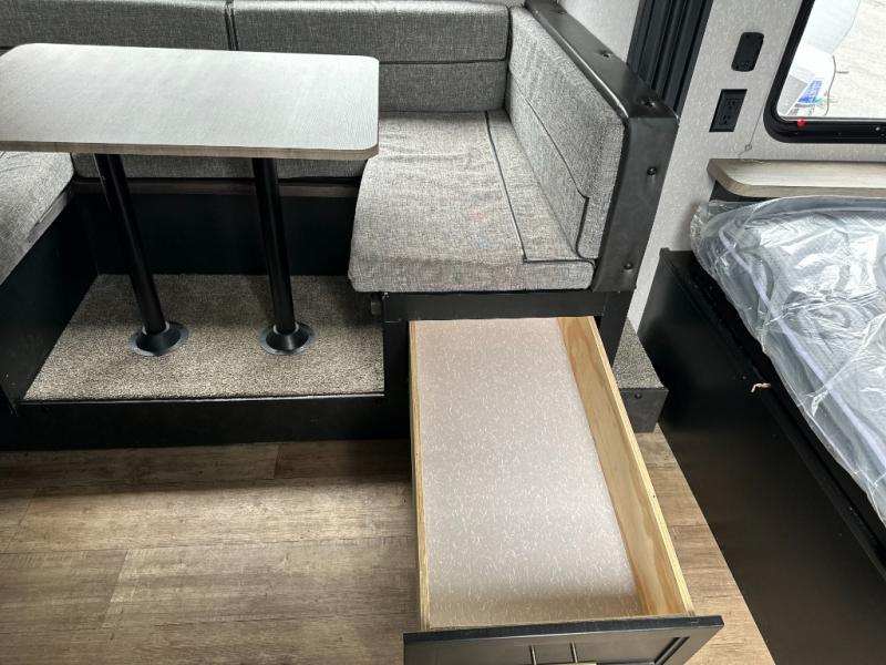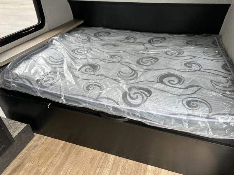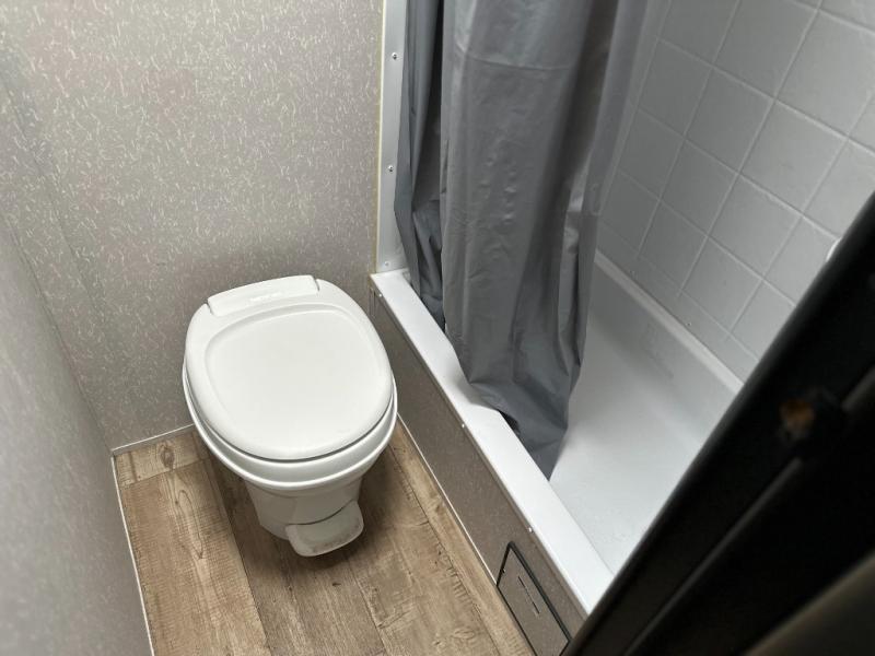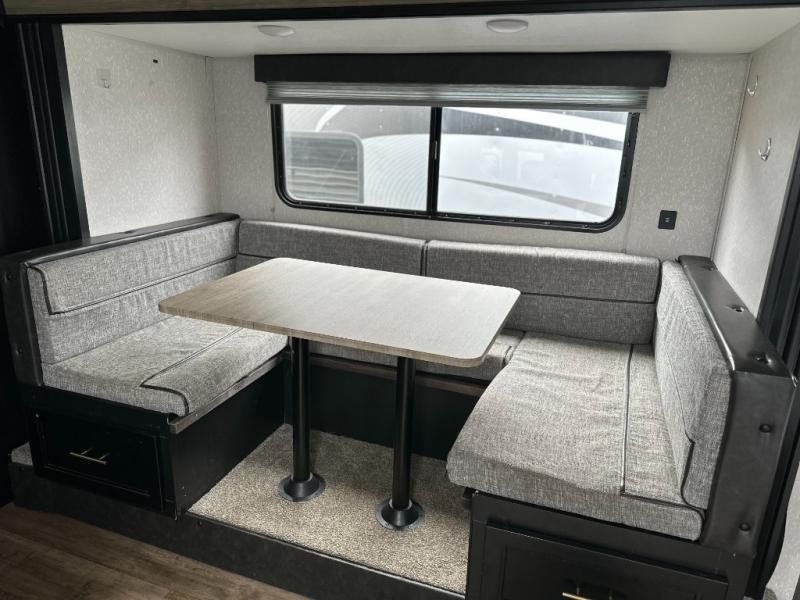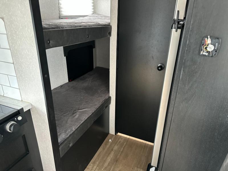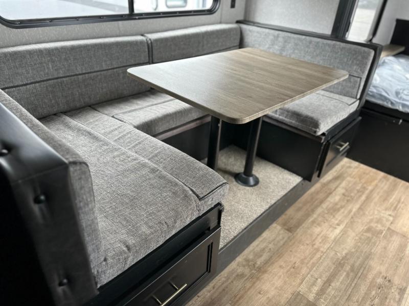 This family travel trailer is ready to head to the campground whenever you are! The kiddos can sleep on the set of bunk beds and you can sleep on the front queen bed, plus the U-shaped dinette slide can also transform into an extra sleeping space when you aren't using it to enjoy a meal prepared with the high output cooktop. You can also prepare your delicious meals at the outside mini kitchen and stay protected by the 12' power awning. The exterior not only as outside storage and an outside TV mount, but also an outside storage plus door for access to the storage space underneath the bottom bunk bed. Everyone can stay squeaky clean with the tub/shower in the rear corner bathroom too!
