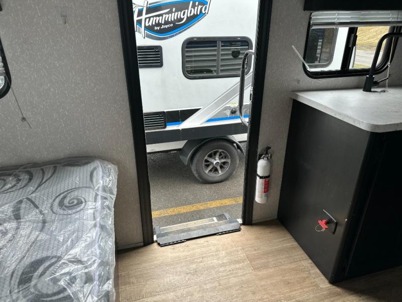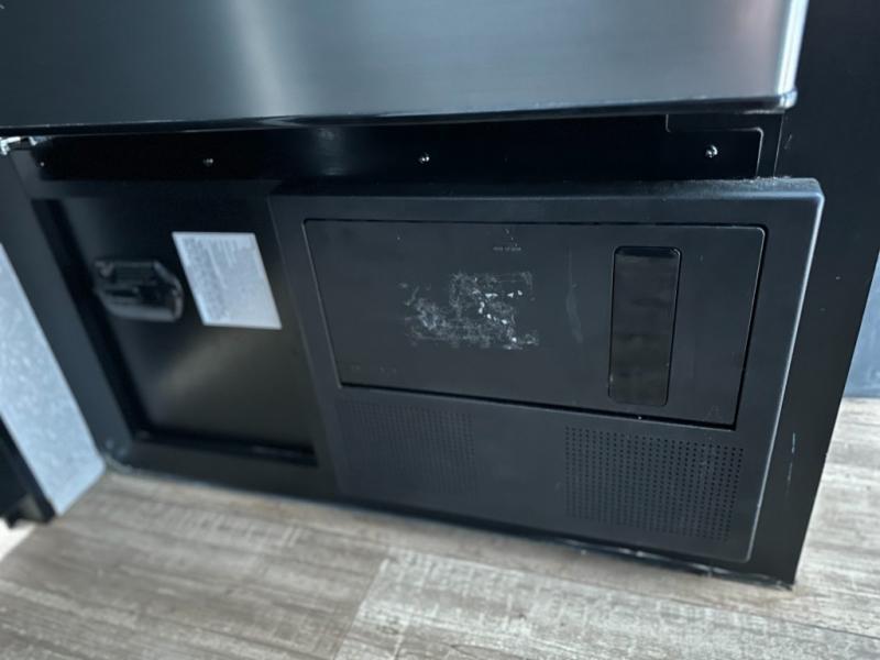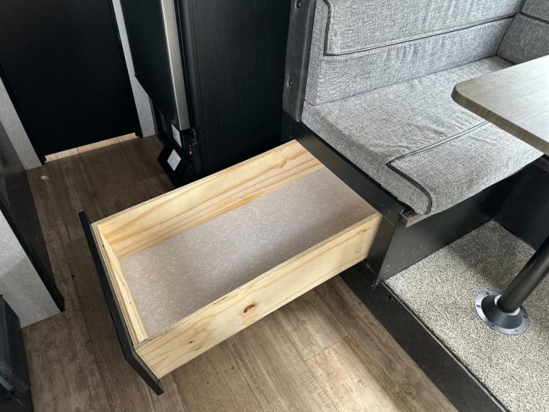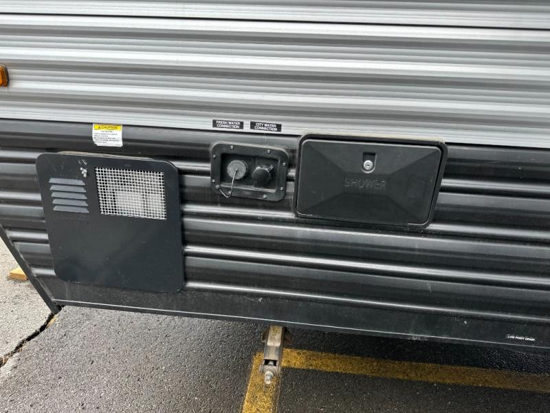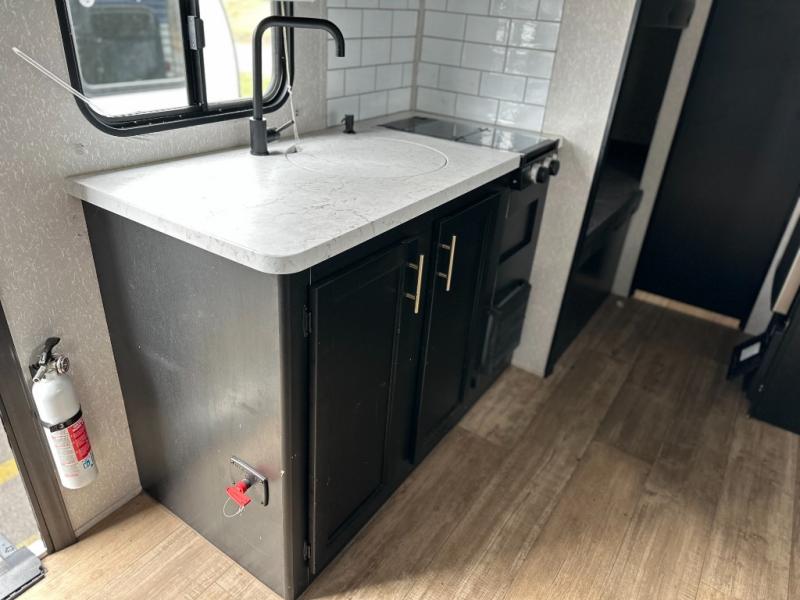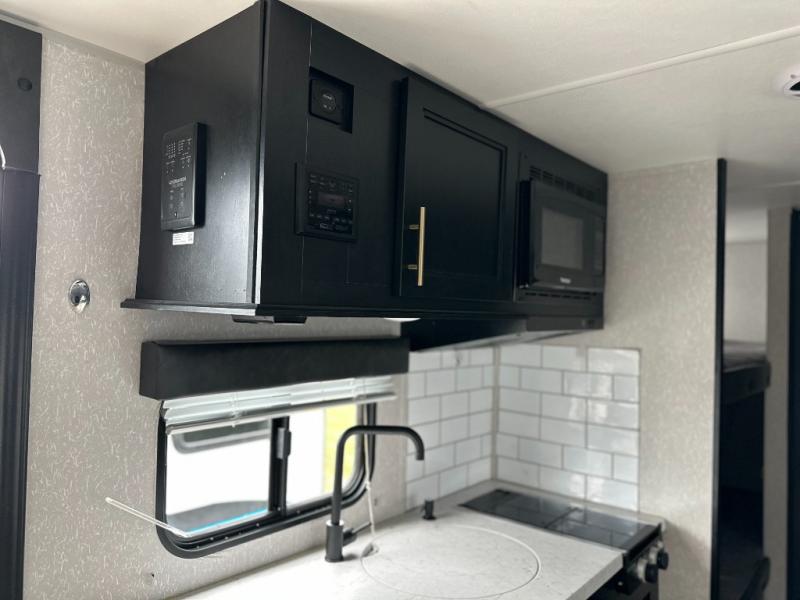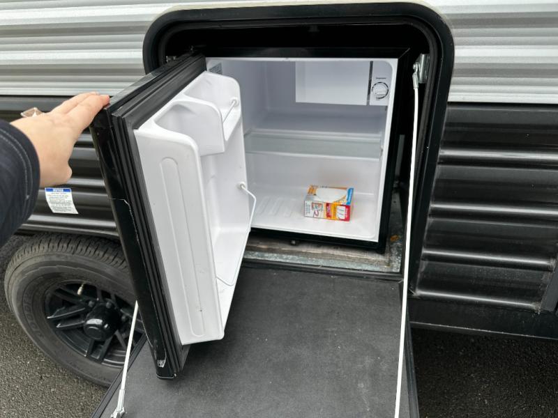 This family travel trailer is ready to head to the campground whenever you are! The kiddos can sleep on the set of bunk beds and you can sleep on the front queen bed, plus the U-shaped dinette slide can also transform into an extra sleeping space when you aren't using it to enjoy a meal prepared with the high output cooktop. You can also prepare your delicious meals at the outside mini kitchen and stay protected by the 12' power awning. The exterior not only as outside storage and an outside TV mount, but also an outside storage plus door for access to the storage space underneath the bottom bunk bed. Everyone can stay squeaky clean with the tub/shower in the rear corner bathroom too!