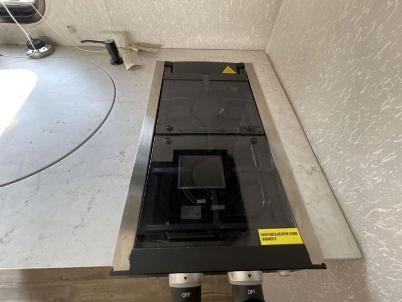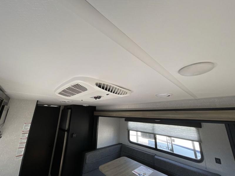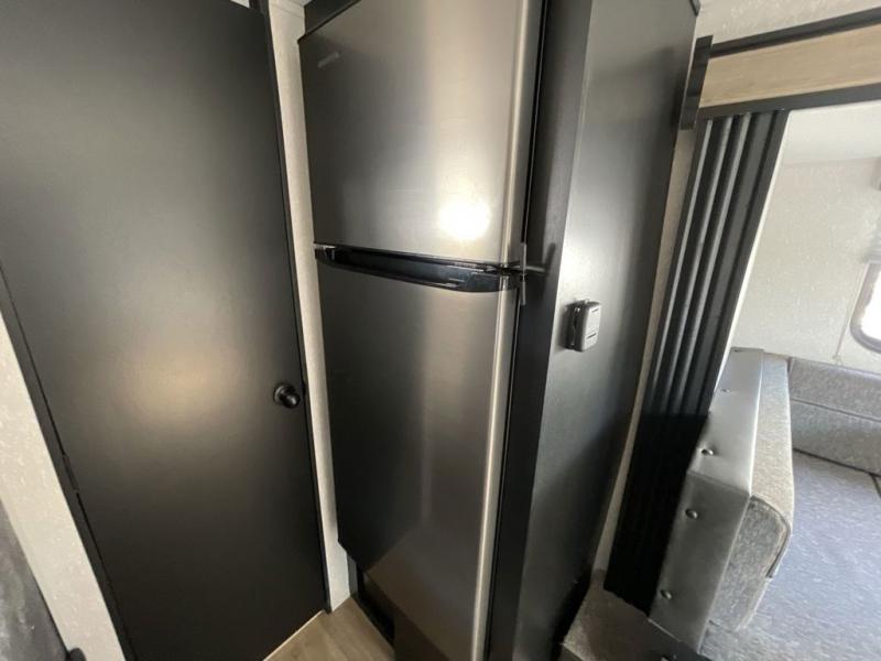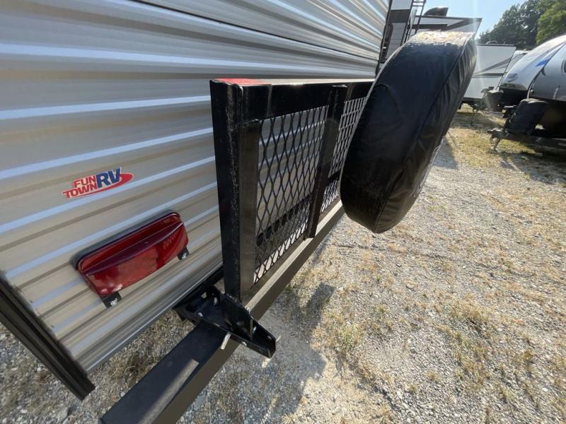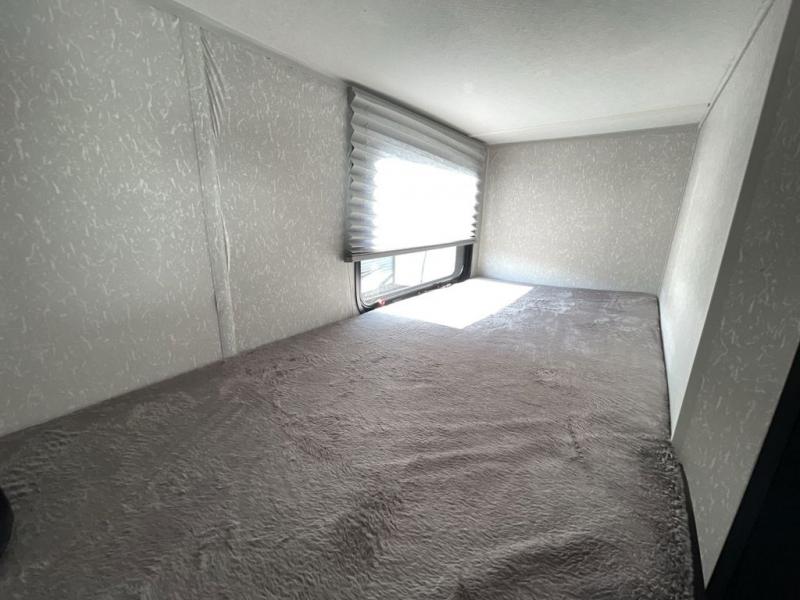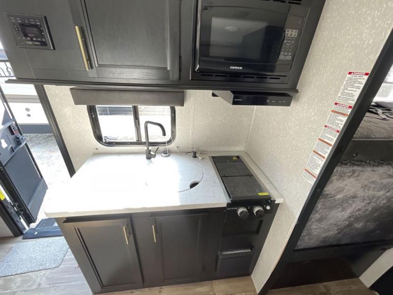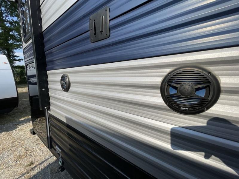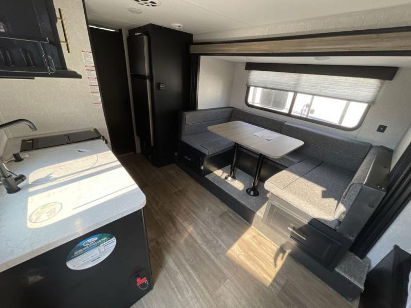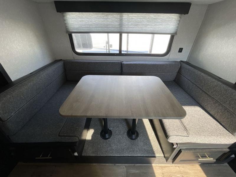 This family travel trailer is ready to head to the campground whenever you are! The kiddos can sleep on the set of bunk beds and you can sleep on the front queen bed, plus the U-shaped dinette slide can also transform into an extra sleeping space when you aren't using it to enjoy a meal prepared with the high output cooktop. You can also prepare your delicious meals at the outside mini kitchen and stay protected by the 12' power awning. The exterior not only as outside storage and an outside TV mount, but also an outside storage plus door for access to the storage space underneath the bottom bunk bed. Everyone can stay squeaky clean with the tub/shower in the rear corner bathroom too!