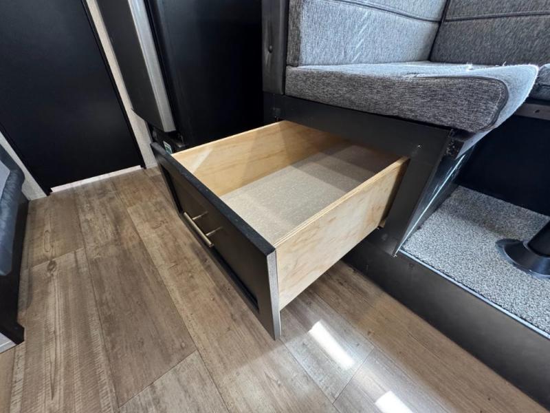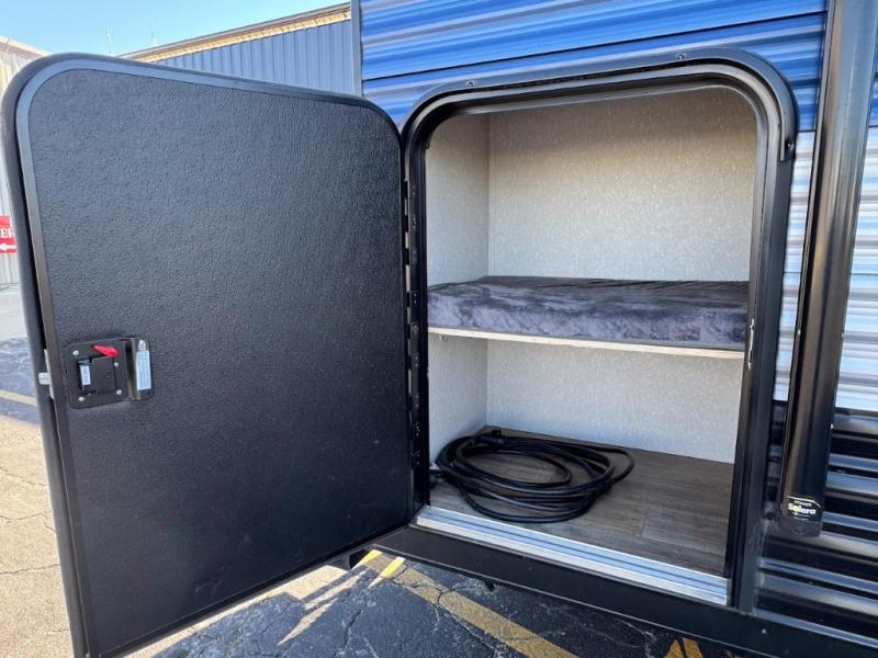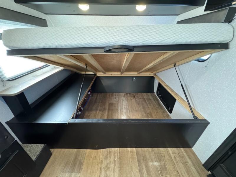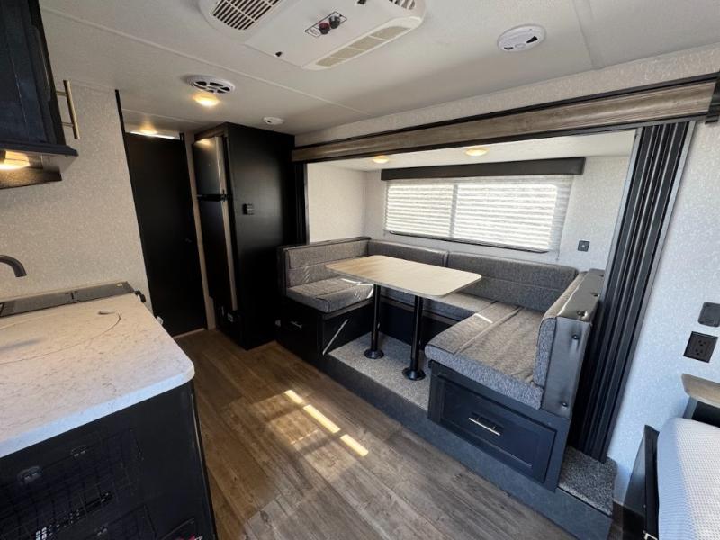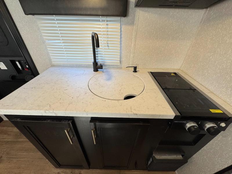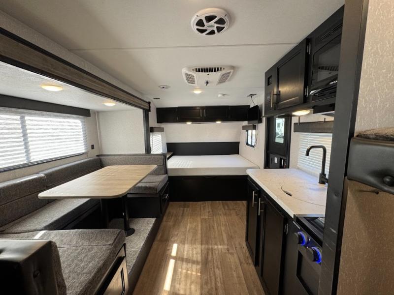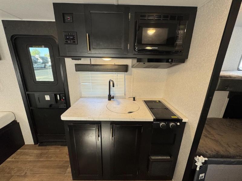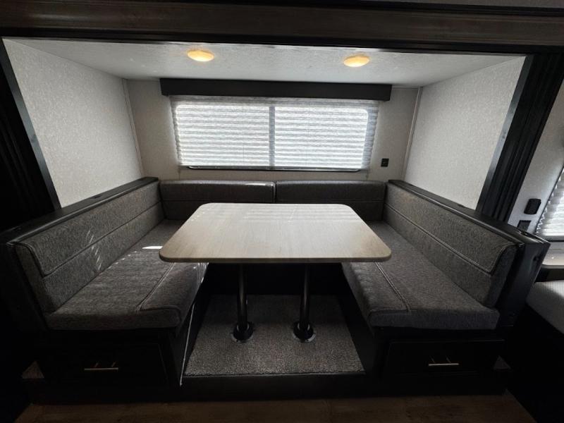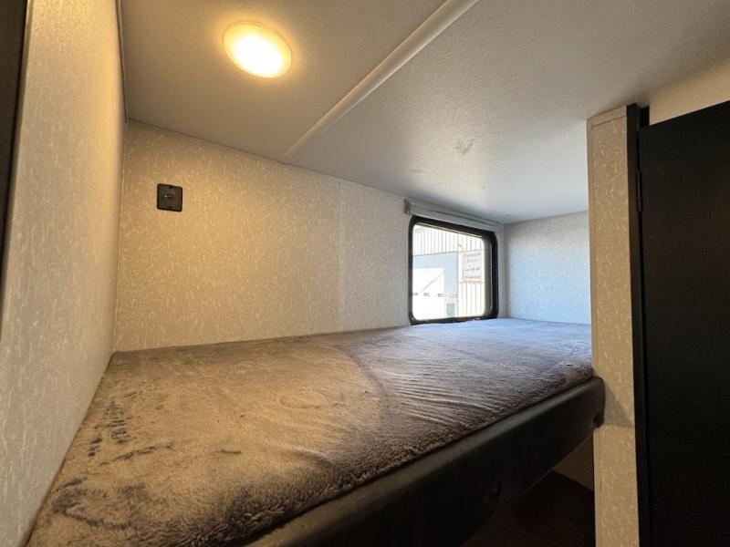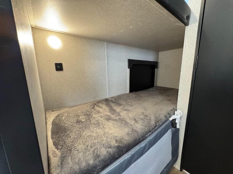 This family travel trailer is ready to head to the campground whenever you are! The kiddos can sleep on the set of bunk beds and you can sleep on the front queen bed, plus the U-shaped dinette slide can also transform into an extra sleeping space when you aren't using it to enjoy a meal prepared with the high output cooktop. You can also prepare your delicious meals at the outside mini kitchen and stay protected by the 12' power awning. The exterior not only as outside storage and an outside TV mount, but also an outside storage plus door for access to the storage space underneath the bottom bunk bed. Everyone can stay squeaky clean with the tub/shower in the rear corner bathroom too!