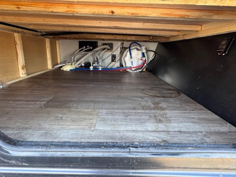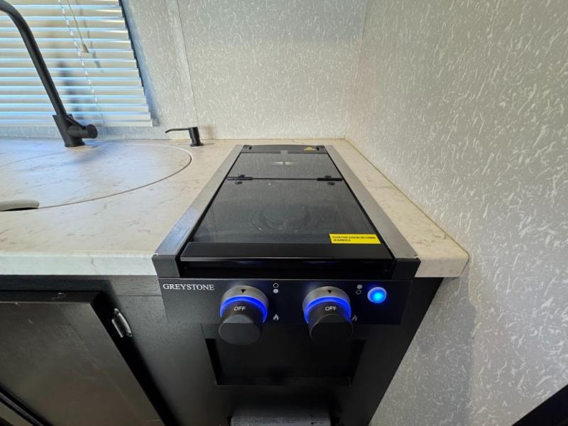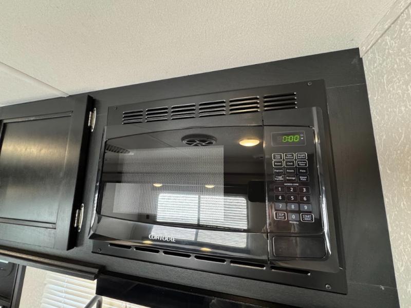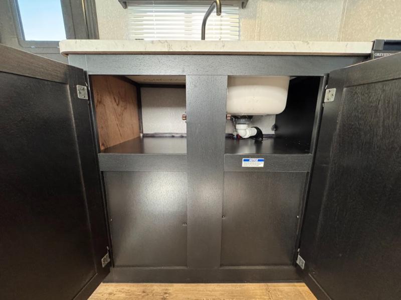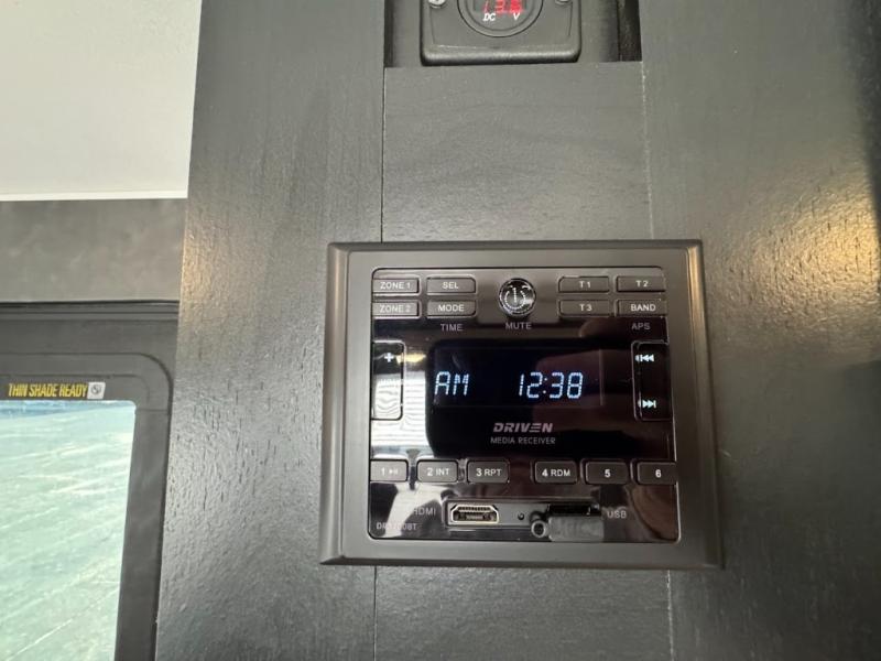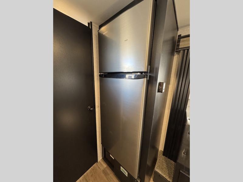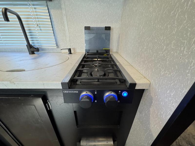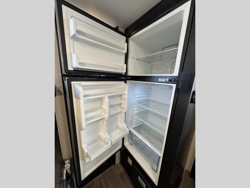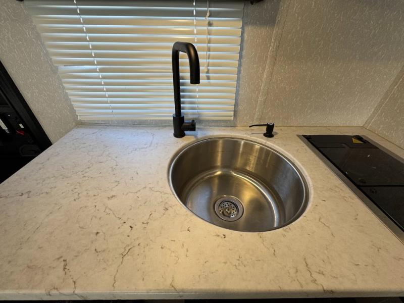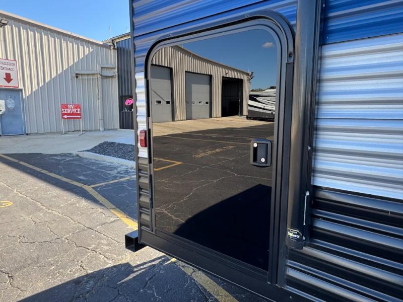 This family travel trailer is ready to head to the campground whenever you are! The kiddos can sleep on the set of bunk beds and you can sleep on the front queen bed, plus the U-shaped dinette slide can also transform into an extra sleeping space when you aren't using it to enjoy a meal prepared with the high output cooktop. You can also prepare your delicious meals at the outside mini kitchen and stay protected by the 12' power awning. The exterior not only as outside storage and an outside TV mount, but also an outside storage plus door for access to the storage space underneath the bottom bunk bed. Everyone can stay squeaky clean with the tub/shower in the rear corner bathroom too!