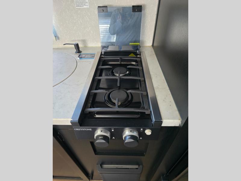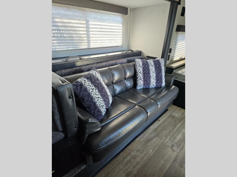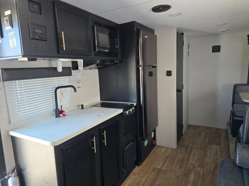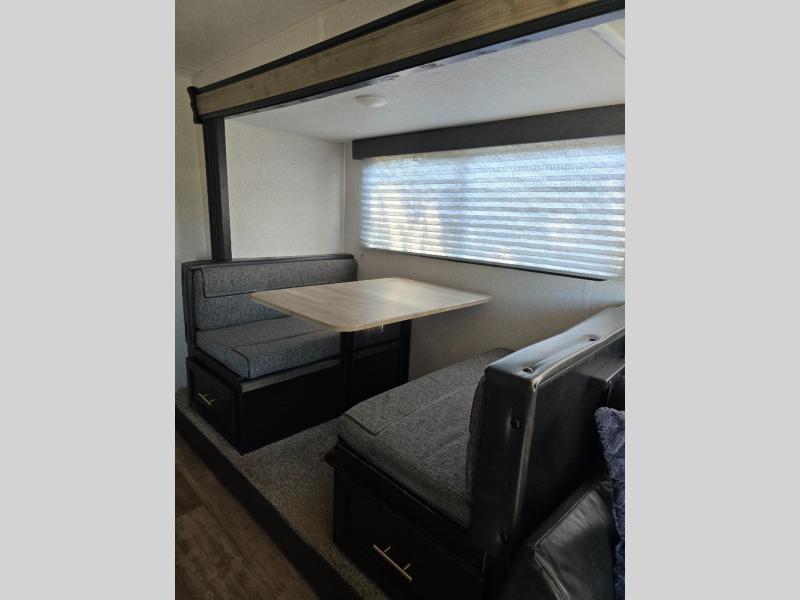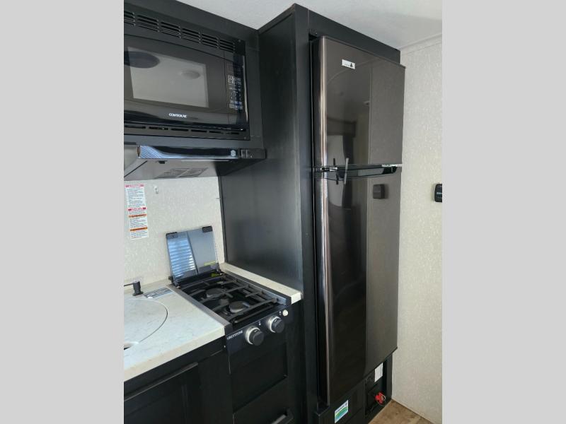 Enjoy plenty of walking around space in this travel trailer with the full slide! Inside the slide is a sofa with a hidden bunk above it and a booth dinette to play card games and enjoy delicious meals prepared with the high output cooktop and 11 cu. ft. Cannon high efficiency refrigerator. There is also an outside mini kitchen to cook your meals, outside storage to keep your camping chairs, and a 12' power awning to protect you while you cook and relax in the chair. For your entertainment needs, there is an outside TV mount and a TV mount location next to the rear corner bathroom which has a tub/shower to get squeaky clean each morning!