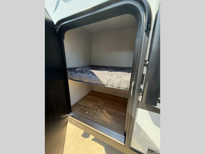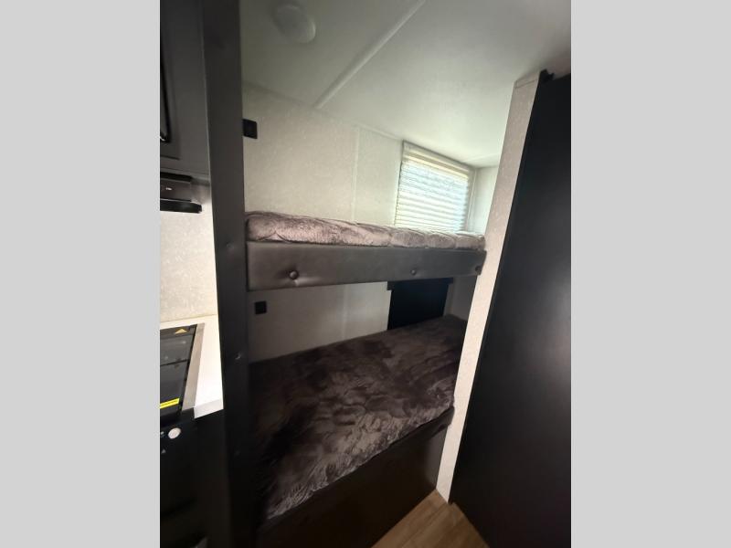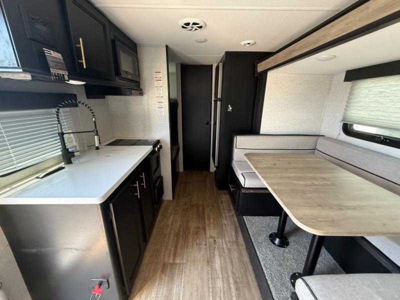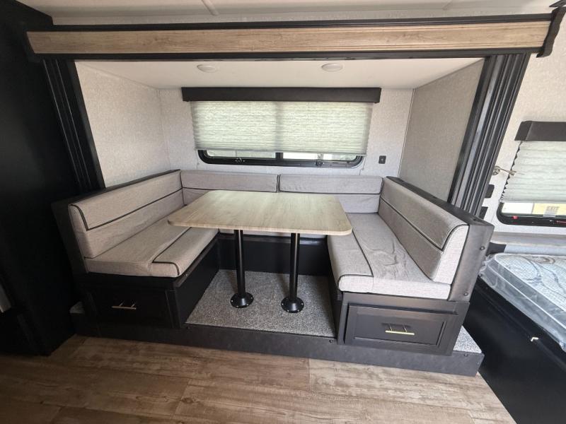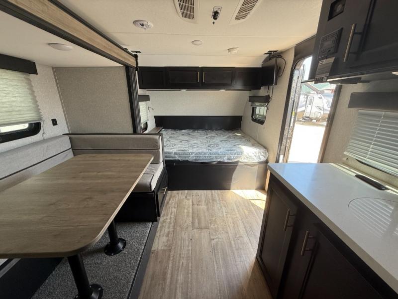 Get away with the family for a fun vacation in this travel trailer! The kiddos can sleep on the set of bunk beds and you can sleep on the front queen bed with a pillowtop mattress and TV mount at the foot of the bed. You could even transform the U-shaped dinette slide into an extra sleeping space for another friend or two to tag along. Everyone can stay squeaky clean with the tub/shower in the rear corner bathroom, and their bellies full with the high output cooktop and 11 cu. ft. Cannon high efficiency refrigerator. There is plenty of storage throughout the inside and outside with the front outside storage area and the storage plus door with access to the storage space underneath the lower bunk bed. Plus, an outside mini kitchen to cook meals in the great outdoors and an outside TV mount for added entertainment!