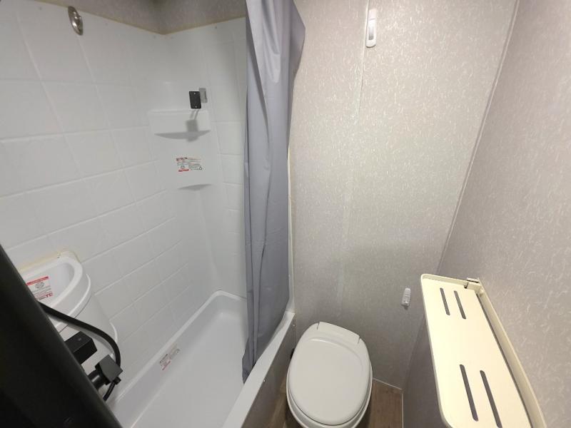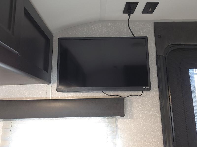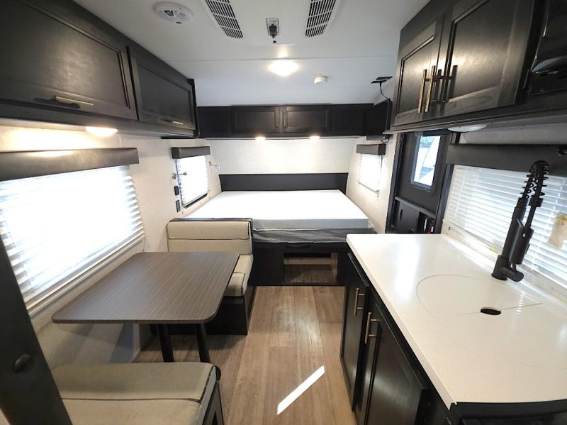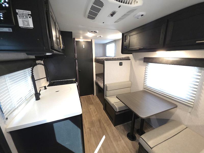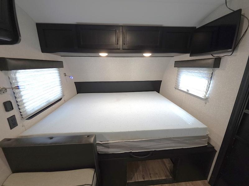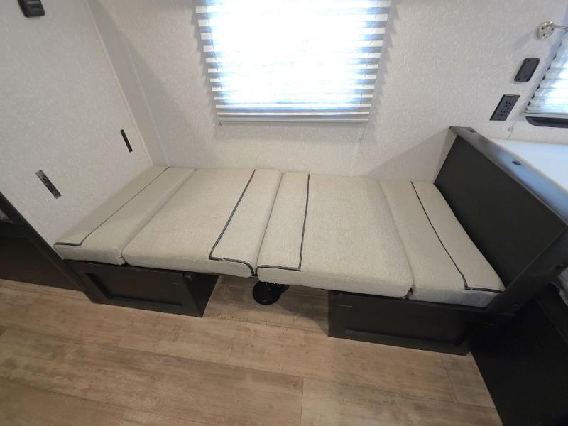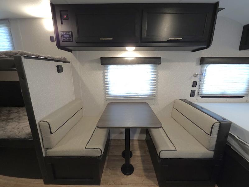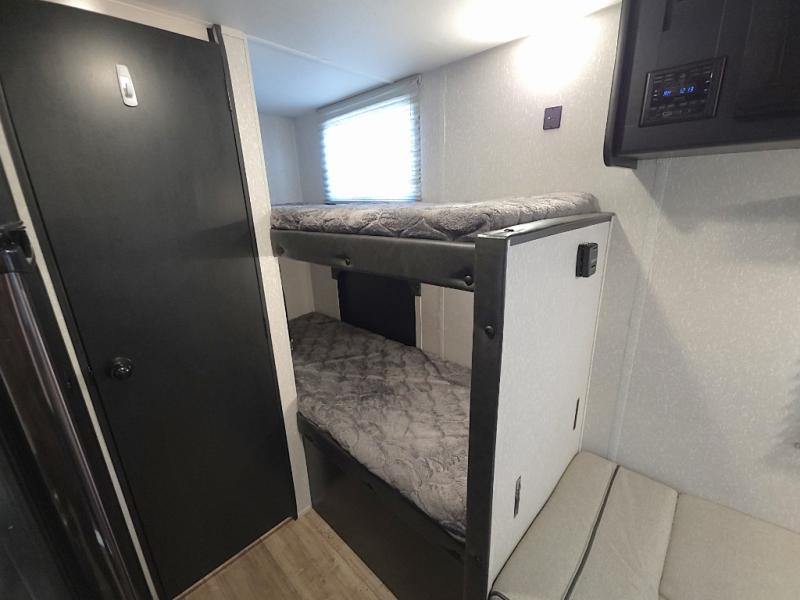 Inside, the whole crew can relax after a day outdoors. The kids will love the rear bunk beds with a TV mount location for added entertainment, while you unwind on the comfortable front queen bed complete with overhead cabinets and a handy shelf. The booth dinette offers a cozy place to enjoy meals, play cards, or convert into additional sleeping space when needed.