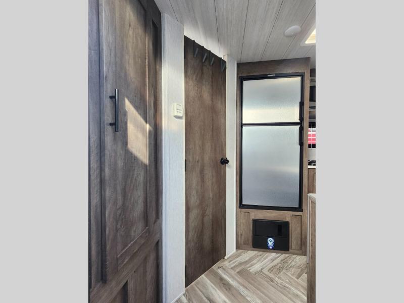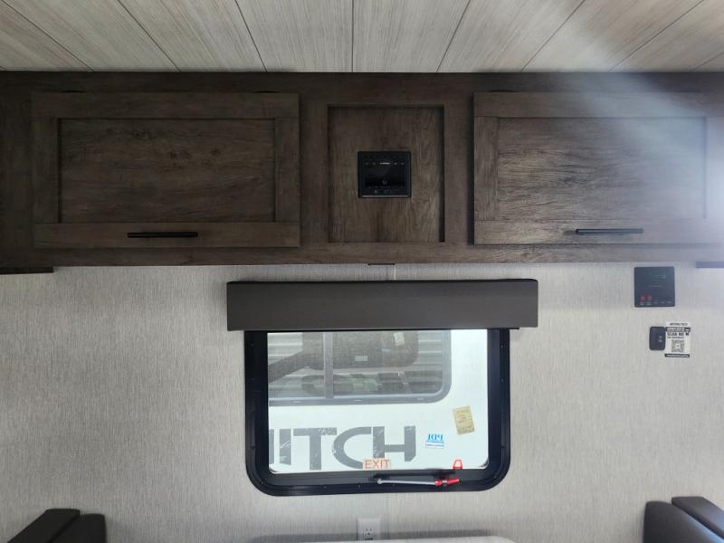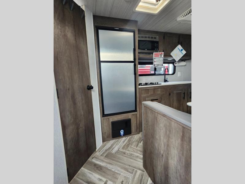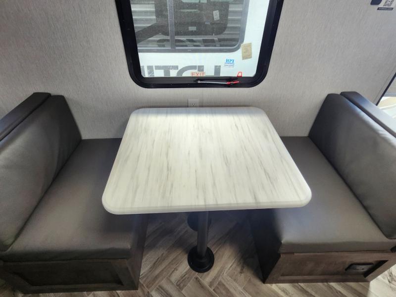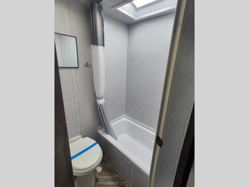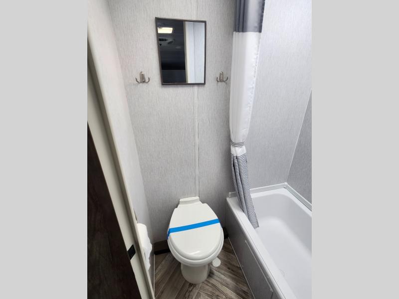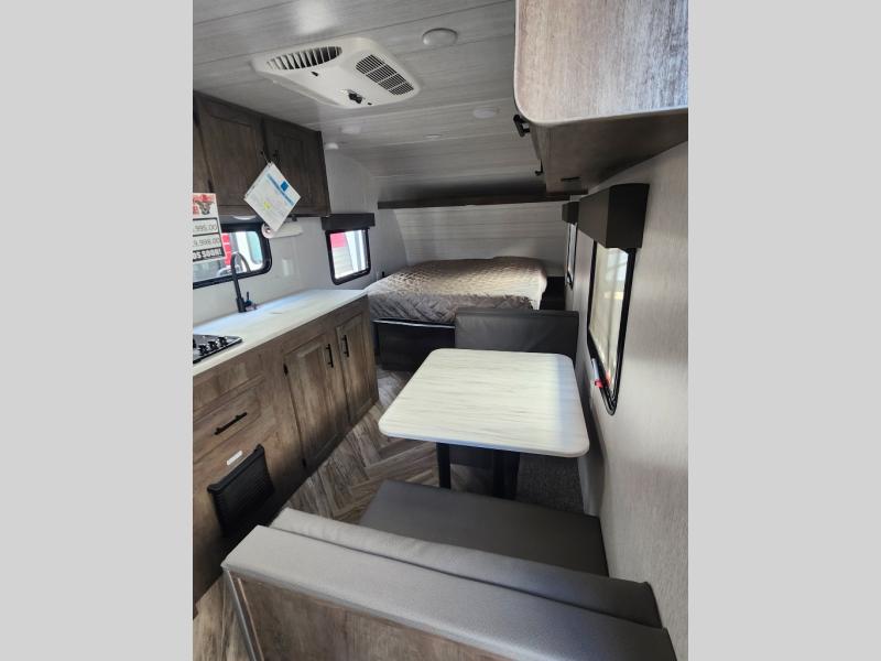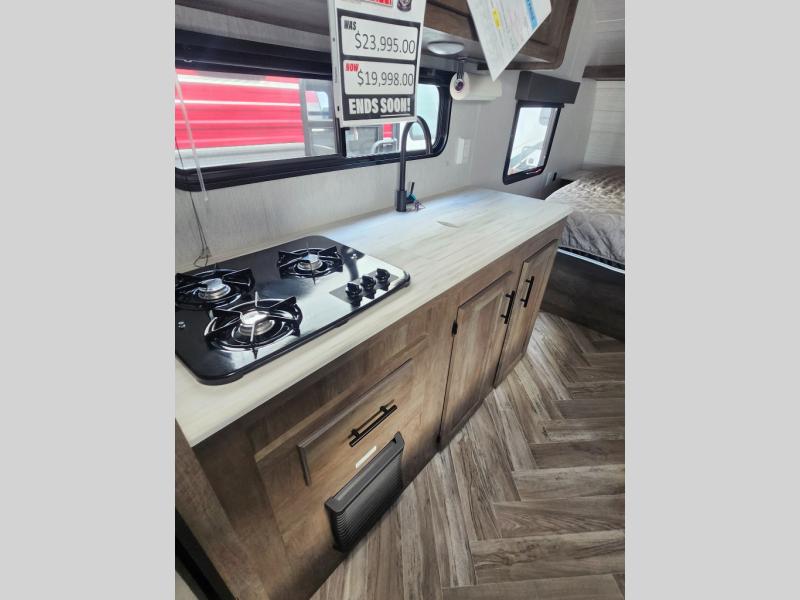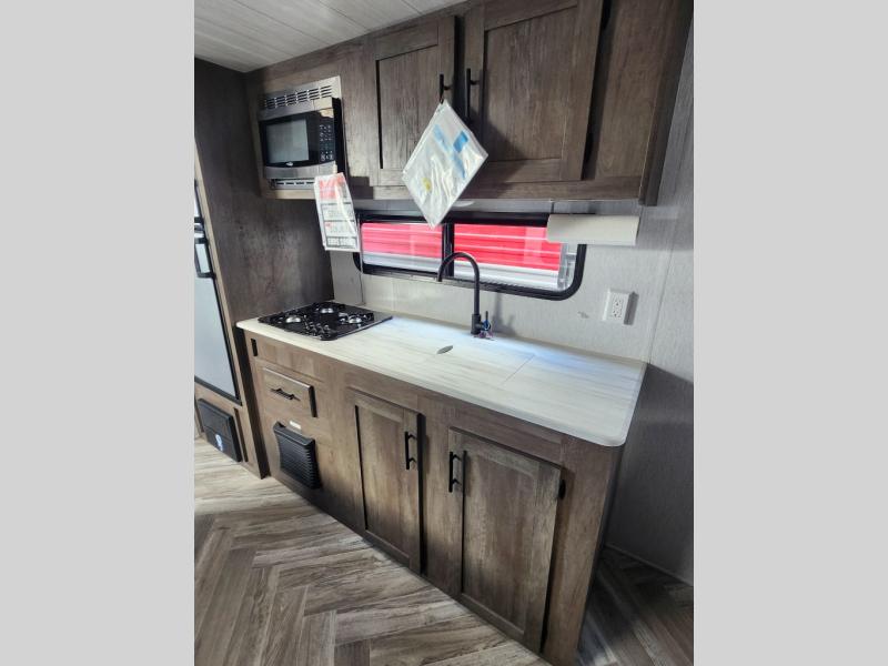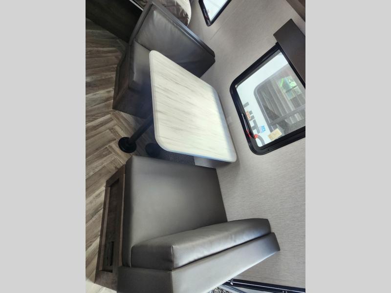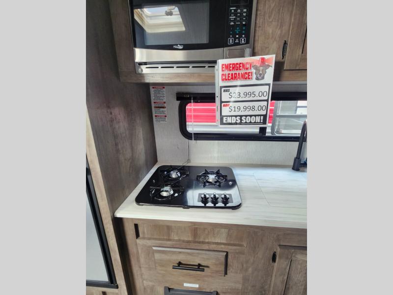 Take this travel trailer to all of your favorite campgrounds! It features a front queen bed with wardrobes on either side of it to keep your clothes looking nice, plus there is a large wardrobe in the rear for even more storage space. Whip up your best home cooked meals with the two burner cooktop, double door 6 cu. ft. refrigerator, and microwave then enjoy them at the booth dinette with overhead cabinets. The rear corner bathroom has a tub/shower for you to freshen up in after a fun day at the beach. Grab a chair from the front exterior pass-through storage area and relax underneath the 12' power awning as you gaze out at your beautiful surroundings!