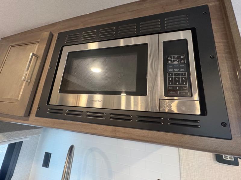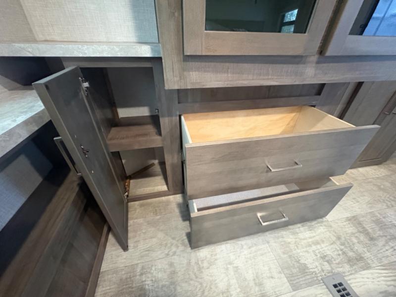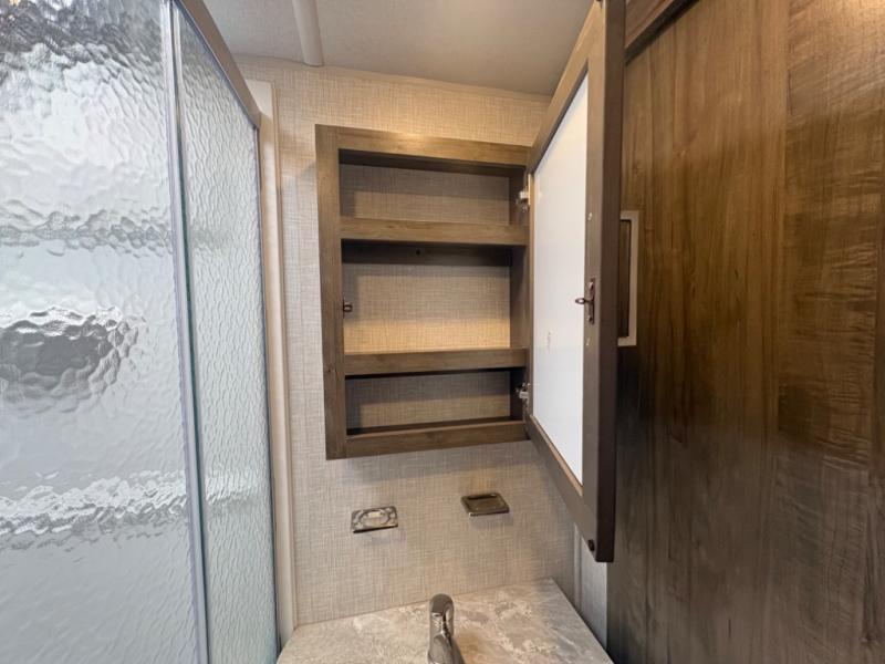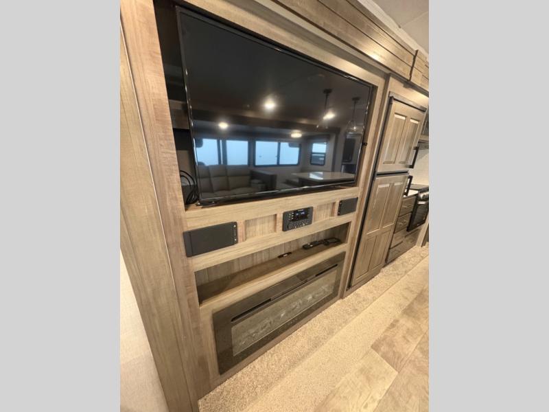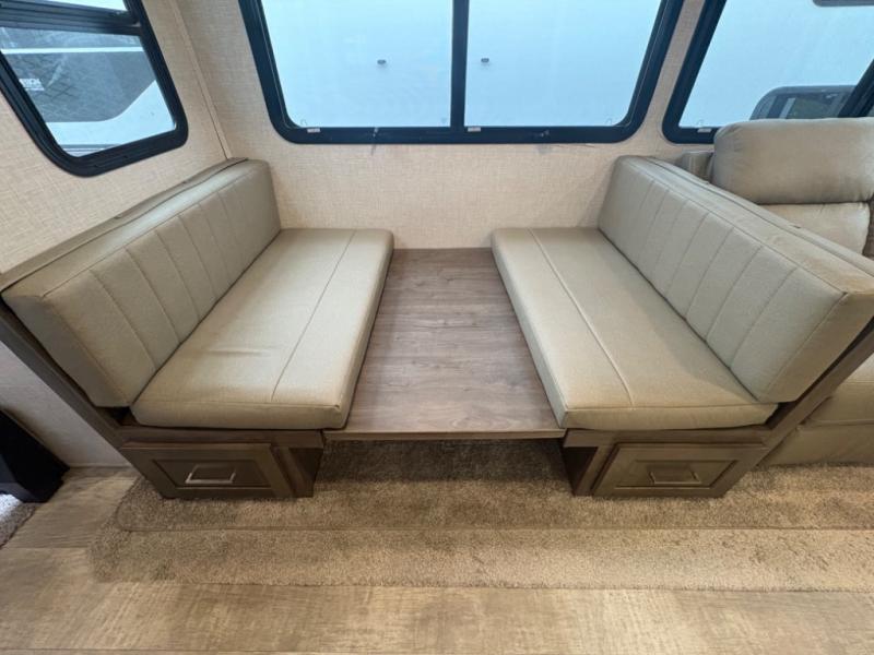 If you enjoy entertaining friends while camping, this trailer offers seating for nine in the combined living and kitchen area on the hide-a-bed sofa, the theater seats and the booth dinette. Everyone can visit, watch the LED TV and enjoy the fireplace all while the cook is preparing snacks in the kitchen with full amenities. The snacks and drinks can be served from the center island, and everyone can enjoy all the views out of the windows along the rear and door side wall. The full bathroom has two entries for convenience, and the front bedroom offers a queen bed slide for more floor space or choose a king option, plus plenty of storage. And the two 11' awnings offer an outdoor living area after you add your camping chairs.