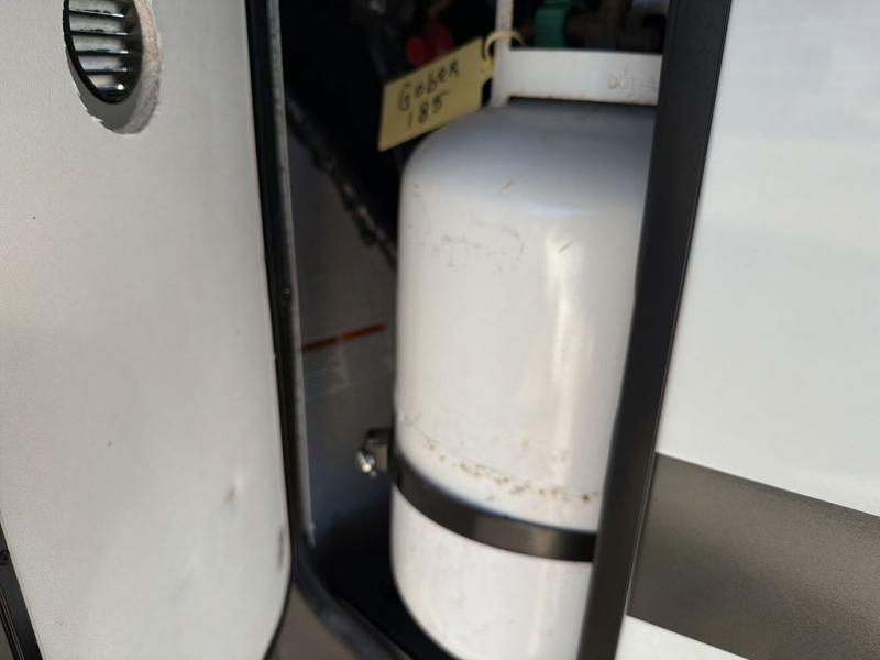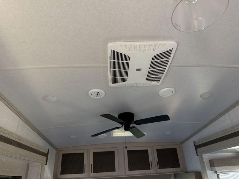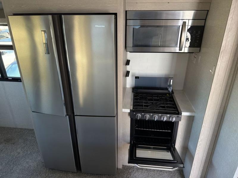 Meal prepping is made easy in this fifth wheel with a kitchen island! You can even prepare dinner outdoors at the outside kitchen with a refrigerator to keep your beverages cold while you cook. The 44" King U-shaped dinette is big enough for everyone to gather around for game night, or some can choose to relax on either the rear 76" hide-a-bed sofa or 60" theater seating across from the entertainment center with a fireplace. The full bathroom has a shower with a seat to rinse the sand out of your hair and a linen closet close by to store your towels. Inside the front private bedroom is a king bed slide across from a dresser with the option to add a TV, as well as a front wardrobe with a shirt closet and an area to add an optional washer and dryer!