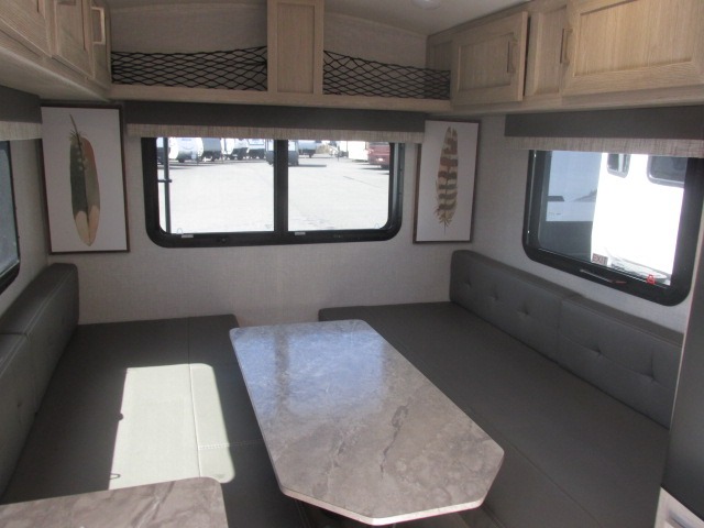 It's time to hit the road in this small, yet walkable travel trailer that is versatile to your needs and offers everything you will want to stay comfortable at a campground or off-grid. You can make meals using the cooktop and microwave up front and store your cold items in the 12V refrigerator. Take turns getting cleaned up in the wet bath so you can skip the public facilities, and store your clothing in the overhead cabinets. You can watch the TV while dining or sleeping on the twin beds that offer a table top to help you convert this area into a king bed. And the 10' power awning will give you a place to hang out while you use the outdoor griddle.