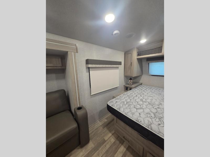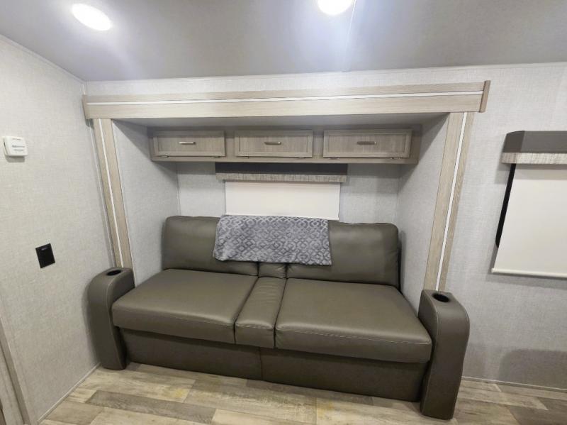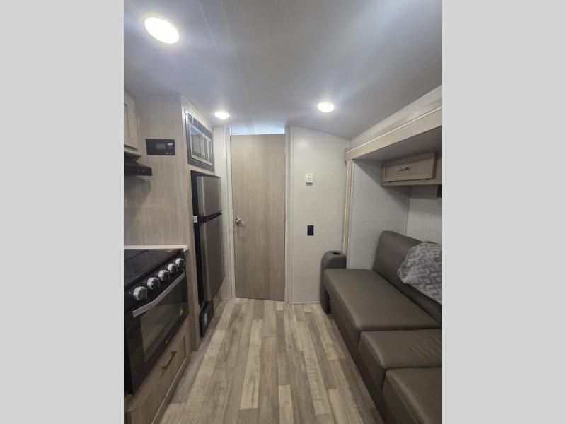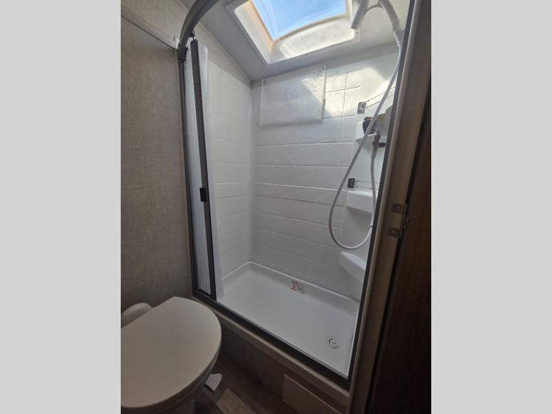 Get ready for a spacious and comfortable trip in this trailer, plus you will have a convenient rear full bathroom with an oversized shower and linen storage to utilize instead of using the campground's facilities. The walk-around full bed gives you two sides with wardrobes to claim as your own. And the kitchen offers full amenities to make meals, and the outside griddle gives you even more choices when cooking. You can relax, dine or even work from the slide out sofa with table and watch the TV. You will find storage along the exterior for your outdoor gear, plus a 14' power awning.