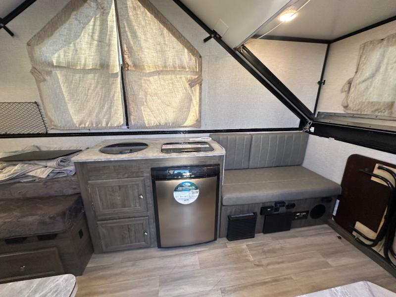 The Forest River Flagstaff Hard Side High Wall A-frame is special because it allows you to adventure into the unknown with the advantages of a tent camper protected by the solid exterior found on a travel trailer. Some of the helpful features that make camping easy are the 10K BTU Cool Cat heat pump (A/C and heater) which will allow you to keep the interior at the right temperature, the water filtration system which will keep your water supply fresh, the power roof lift which will set up without much effort, and the ProRac permanent crossbars which can hold up to 150 pounds. Each model is also prepped for a Wi-Fi booster with LTE to add some modern convenience.