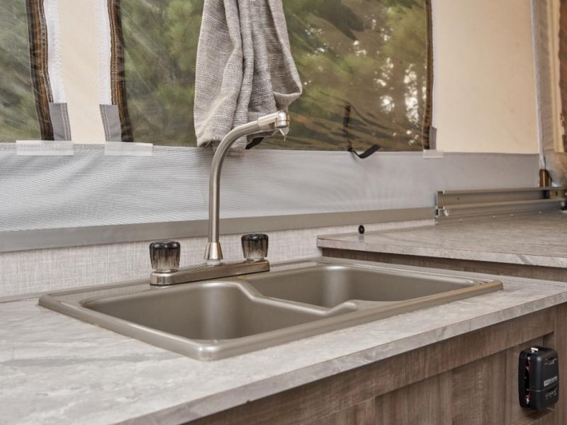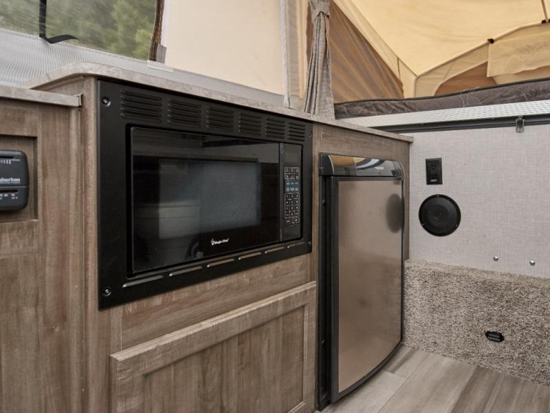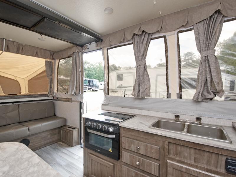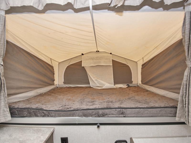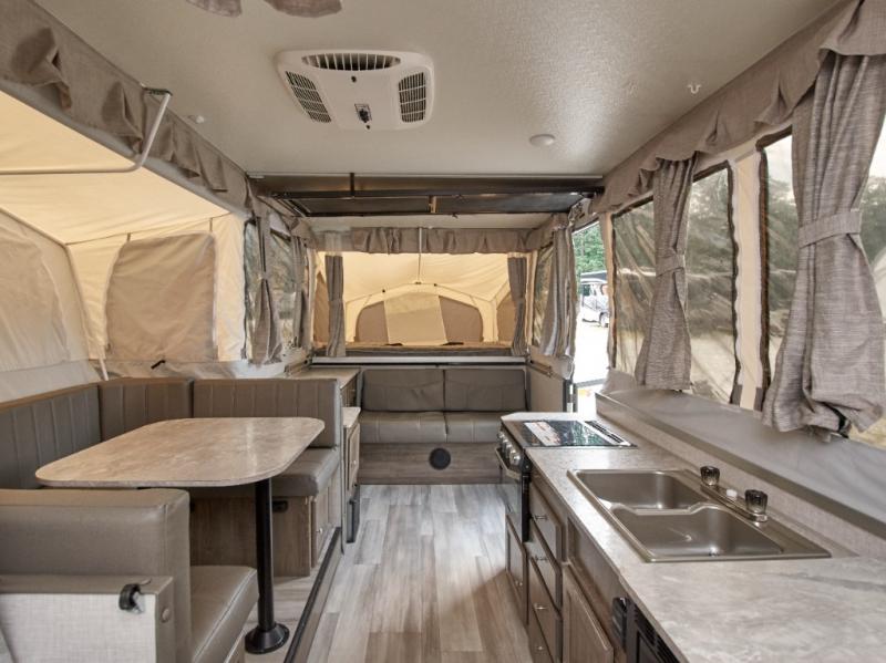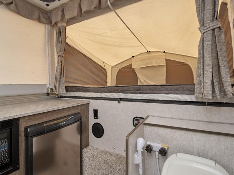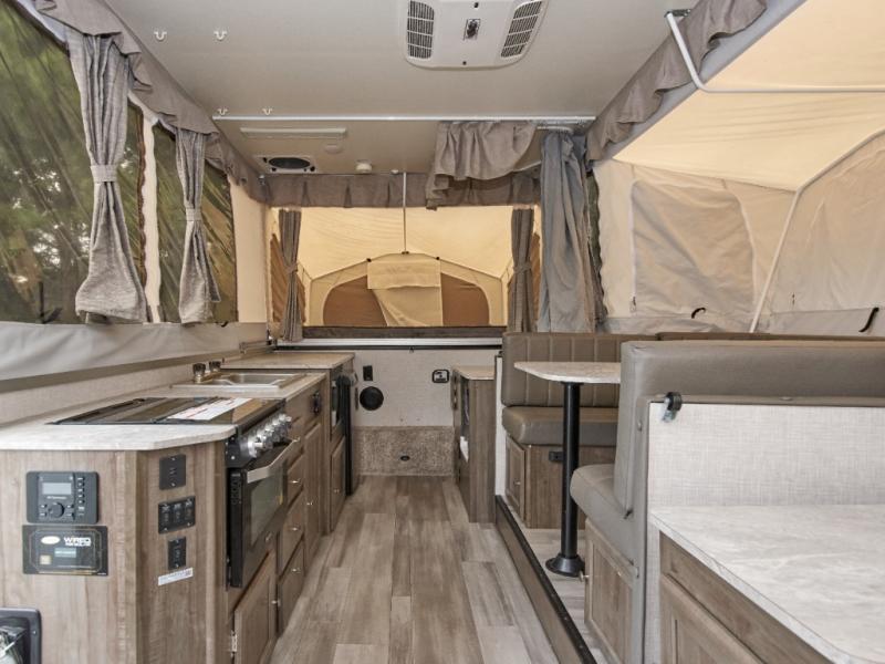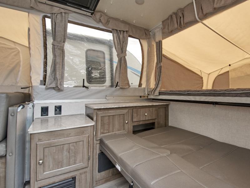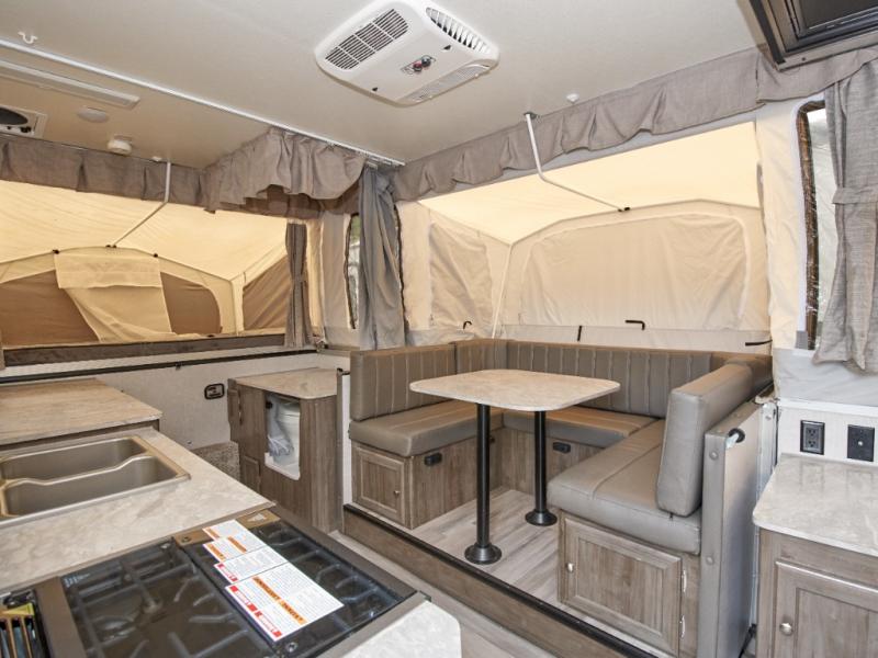 The Flagstaff High Wall HW29SC pop-up camper is designed to deliver a full-featured camping experience in a lightweight, easy-to-tow format. With two roomy tent end beds, a convertible sofa with table, and a U-shaped dinette slide, this camper comfortably sleeps the whole family while offering flexible space for meals, games, or relaxation.
