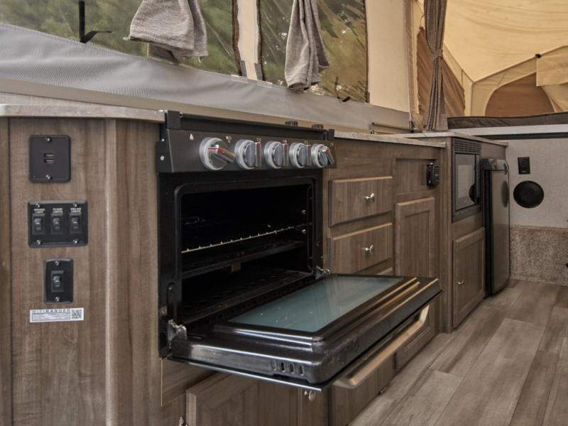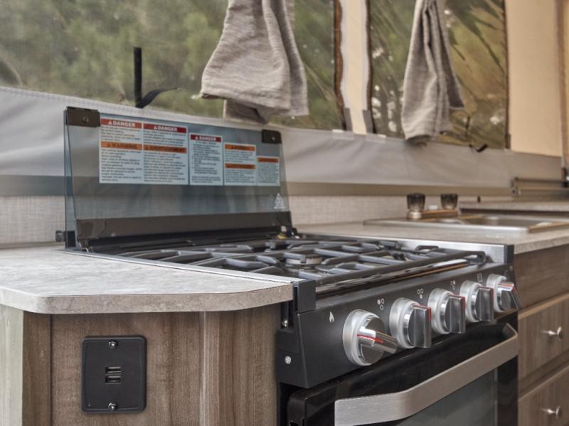 Enjoy hot meals indoors with the three-burner cooktop or take breakfast outside with the built-in griddle. The onboard shower and cassette toilet keep everyone fresh, and ample cabinetry plus exterior storage compartments ensure your gear stays organized and accessible.