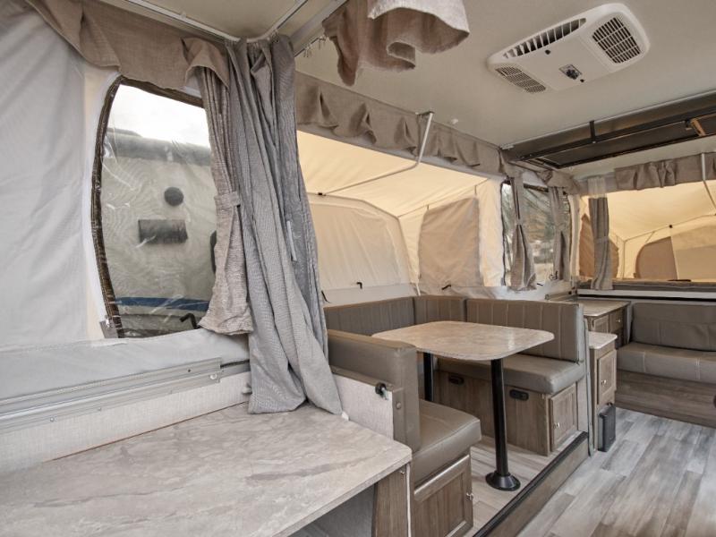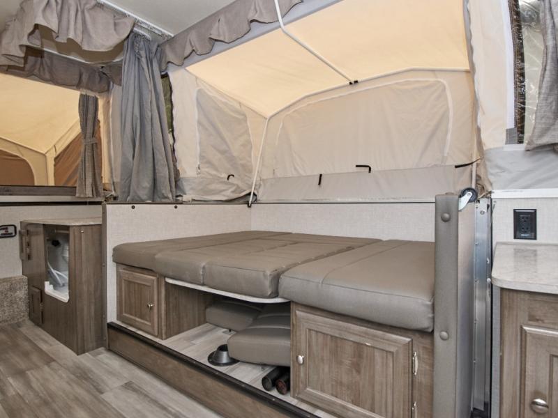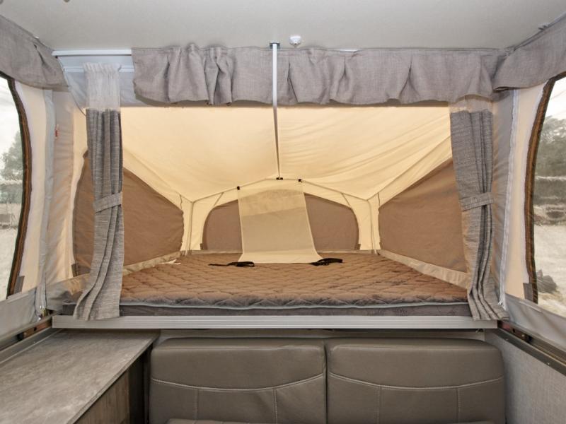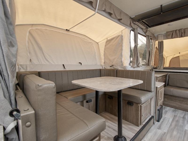 Enjoy spacious family camping with the Flagstaff High Wall HW29SC, featuring dual tent end beds and a U-shaped dinette slide for flexible sleeping and dining comfort.