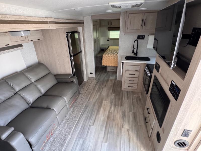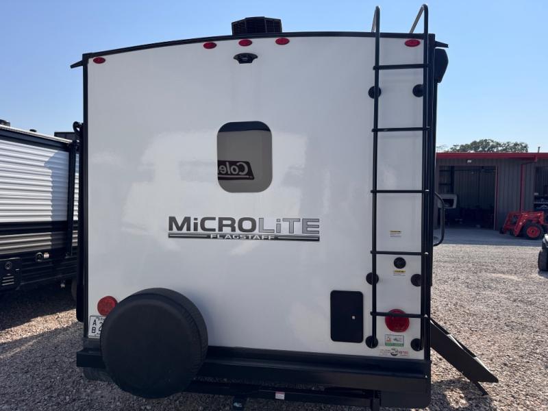 For the couple who enjoys a weekend camping trip, come choose this Flagstaff Micro Lite travel trailer. This unit features a slide that holds the theater seats with cupholders for your favorite beverage. You'll love relaxing on these in the evening while you enjoy your entertainment center with an LED TV. The private front bedroom includes an RV queen bed and a wardrobe slide. You'll love the cute kitchen with a countertop extension for meal prep and a large pantry to hold your favorite snacks. This trailer also features a drop-frame pass-through storage for your large camping items.