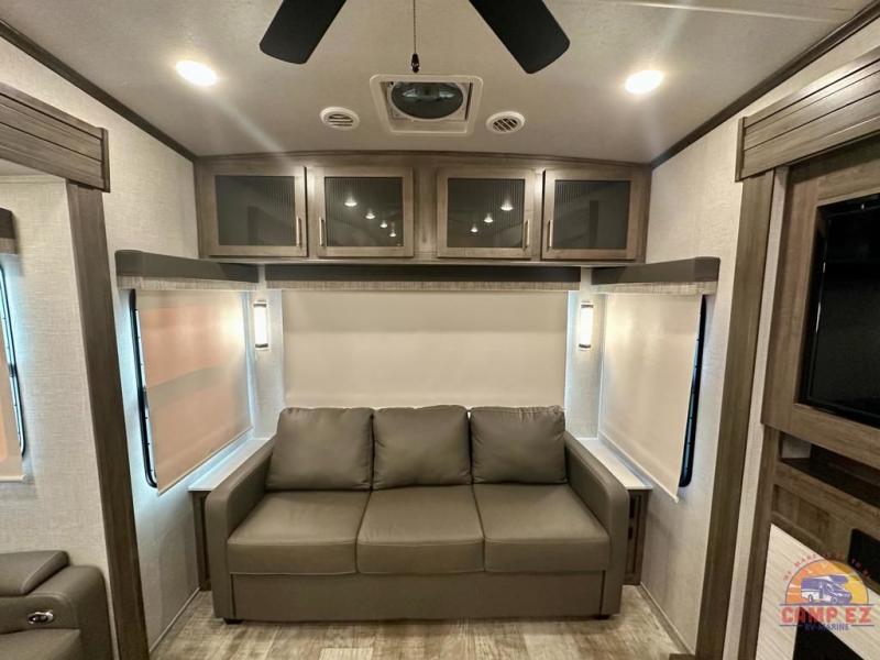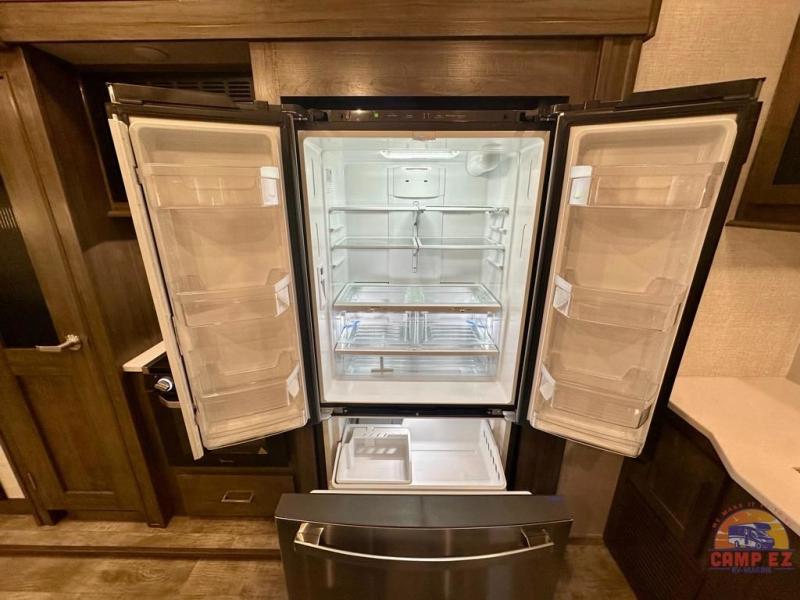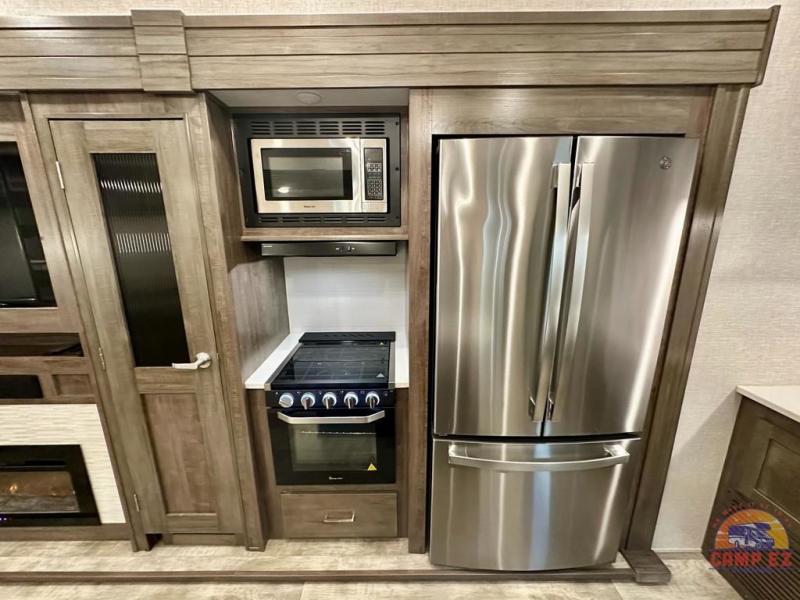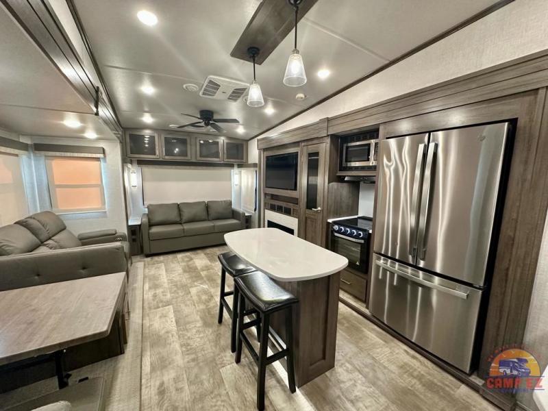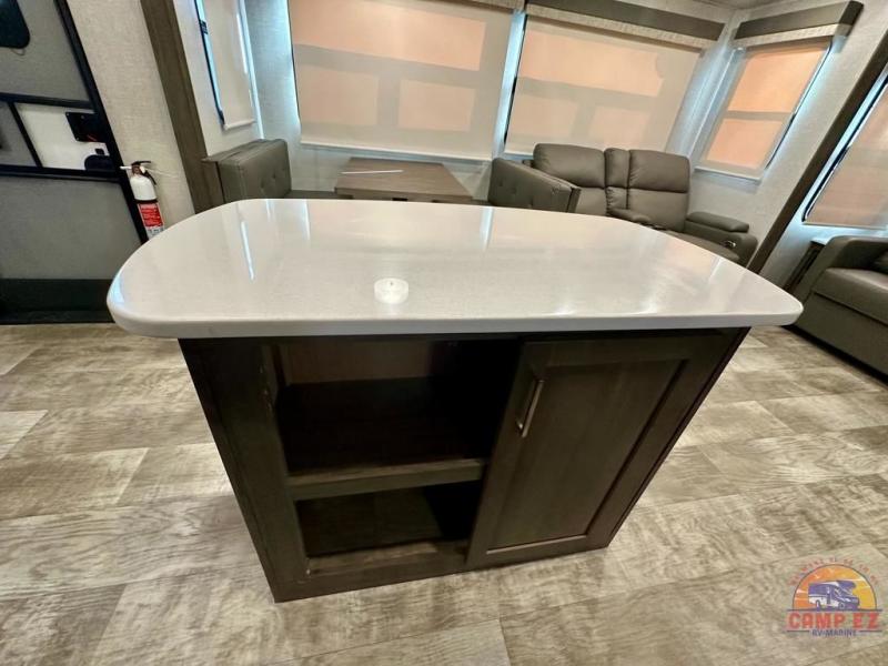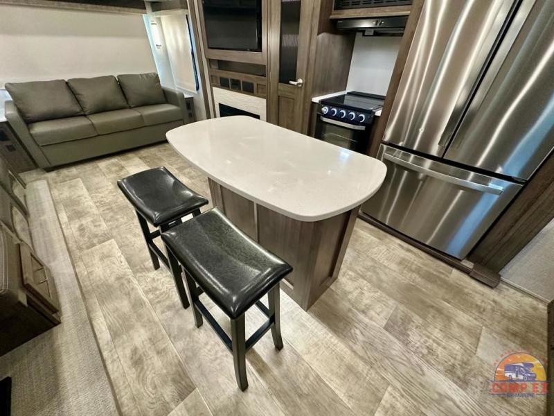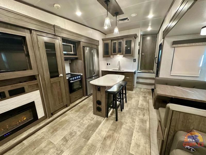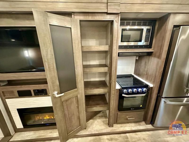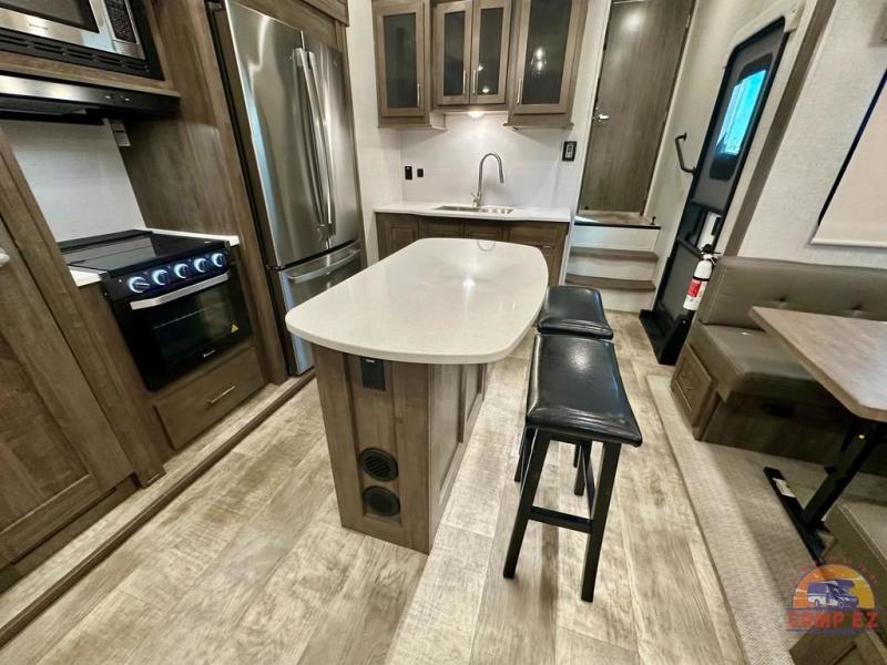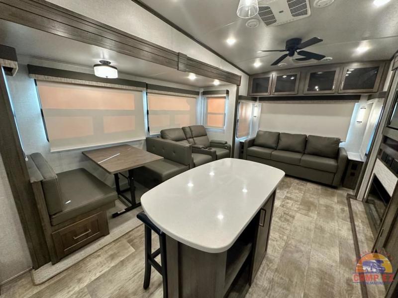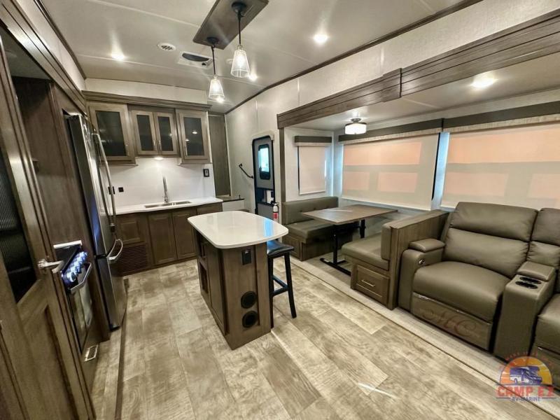 Get ready to enjoy the outdoors while inside with the enormous windows in both the rear, and the door side slide of this fifth wheel. The spacious main living area offers dual opposing slides giving you a great place to invite other RVers over to visit, eat and even play cards. There is seating for nine from the booth dinette, the theater seats and the rear hide-a-bed sofa. The cook will have a residential refrigerator to store lots of drinks and cold food, plus a pantry, and the center island offers extra counter space plus seating. After everyone has left, retire to the front bedroom with a queen bed slide, a shirt closet, a wardrobe with washer/dryer prep, plus more storage and a TV option. You might even like to choose a king bed option and/or an 18 cu. ft. gas/electric fridge option.