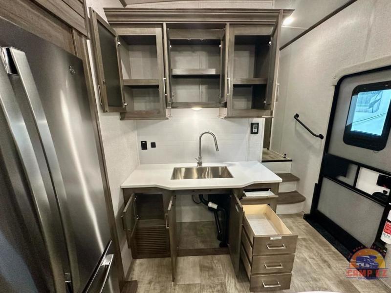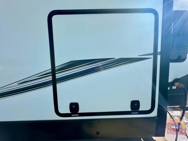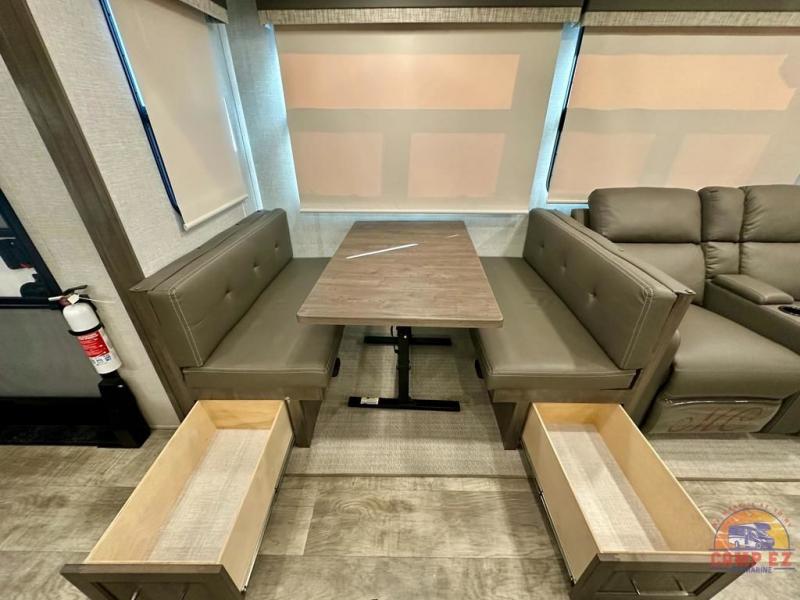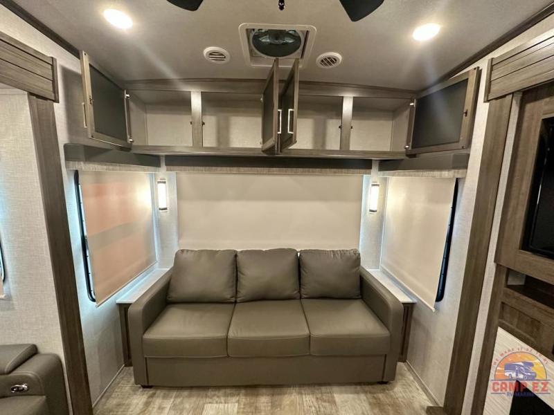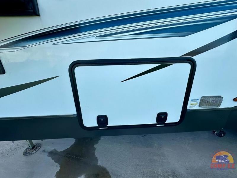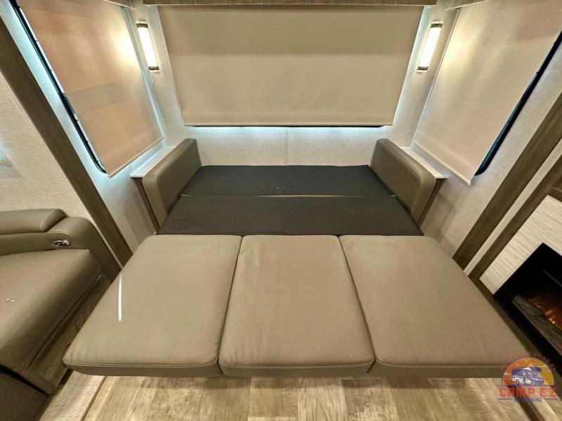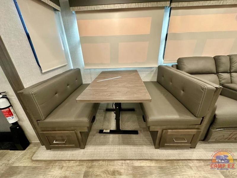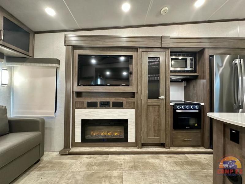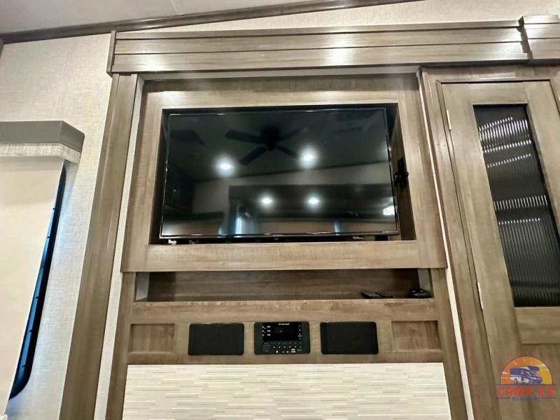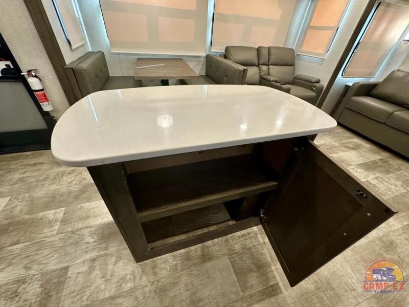Get ready to enjoy the outdoors while inside with the enormous windows in both the rear, and the door side slide of this fifth wheel. The spacious main living area offers dual opposing slides giving you a great place to invite other RVers over to visit, eat and even play cards. There is seating for nine from the booth dinette, the theater seats and the rear hide-a-bed sofa. The cook will have a residential refrigerator to store lots of drinks and cold food, plus a pantry, and the center island offers extra counter space plus seating. After everyone has left, retire to the front bedroom with a queen bed slide, a shirt closet, a wardrobe with washer/dryer prep, plus more storage and a TV option. You might even like to choose a king bed option and/or an 18 cu. ft. gas/electric fridge option.