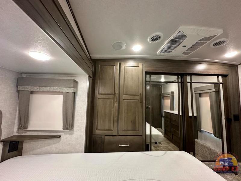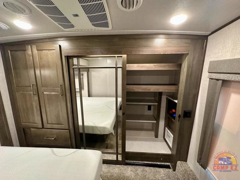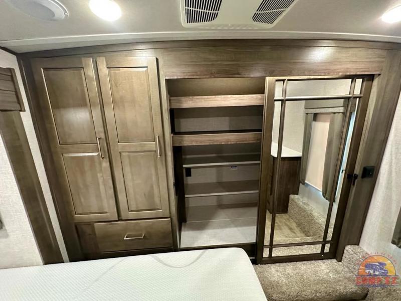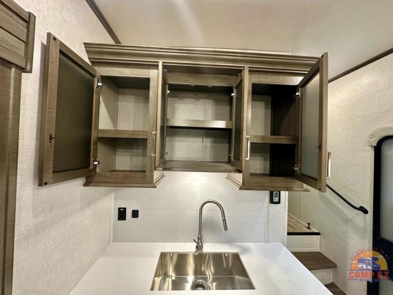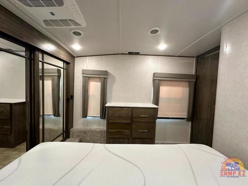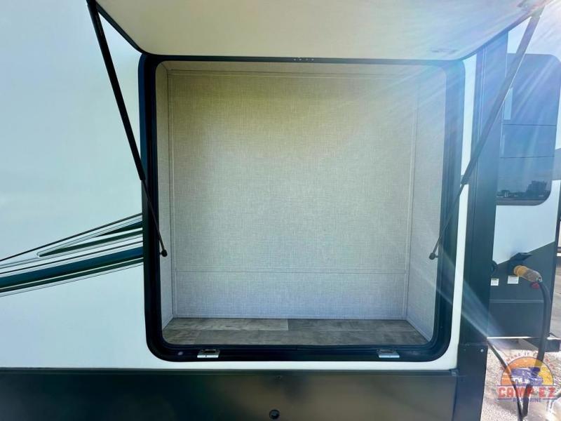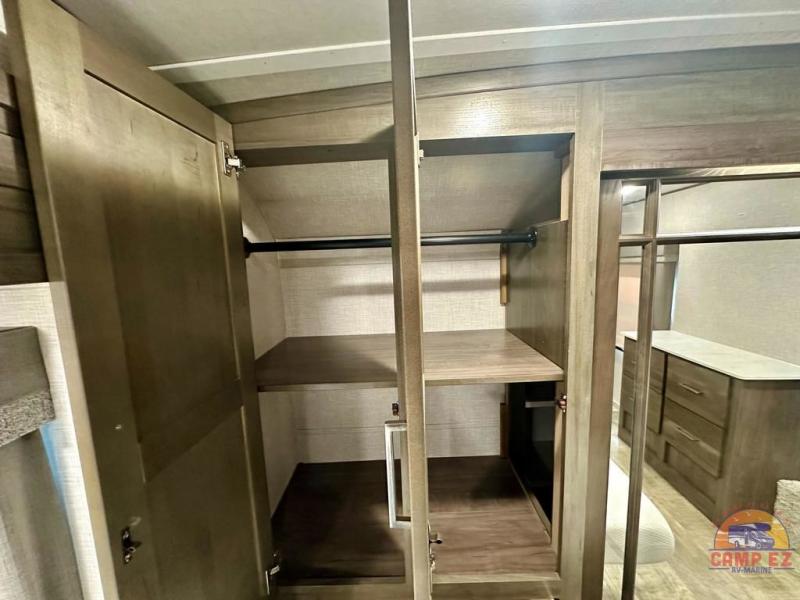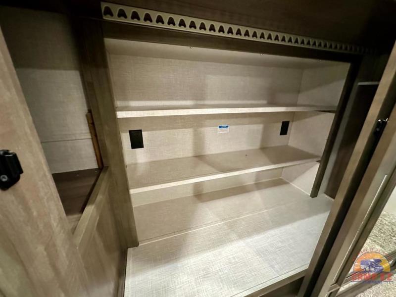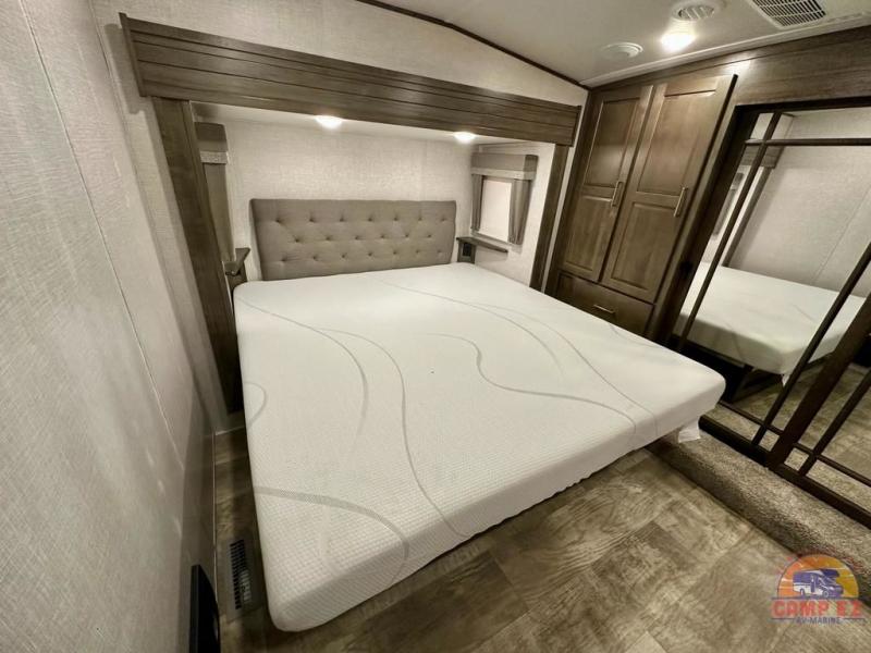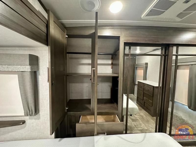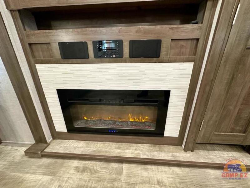 Get ready to enjoy the outdoors while inside with the enormous windows in both the rear, and the door side slide of this fifth wheel. The spacious main living area offers dual opposing slides giving you a great place to invite other RVers over to visit, eat and even play cards. There is seating for nine from the booth dinette, the theater seats and the rear hide-a-bed sofa. The cook will have a residential refrigerator to store lots of drinks and cold food, plus a pantry, and the center island offers extra counter space plus seating. After everyone has left, retire to the front bedroom with a queen bed slide, a shirt closet, a wardrobe with washer/dryer prep, plus more storage and a TV option. You might even like to choose a king bed option and/or an 18 cu. ft. gas/electric fridge option.
