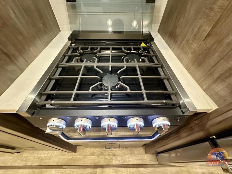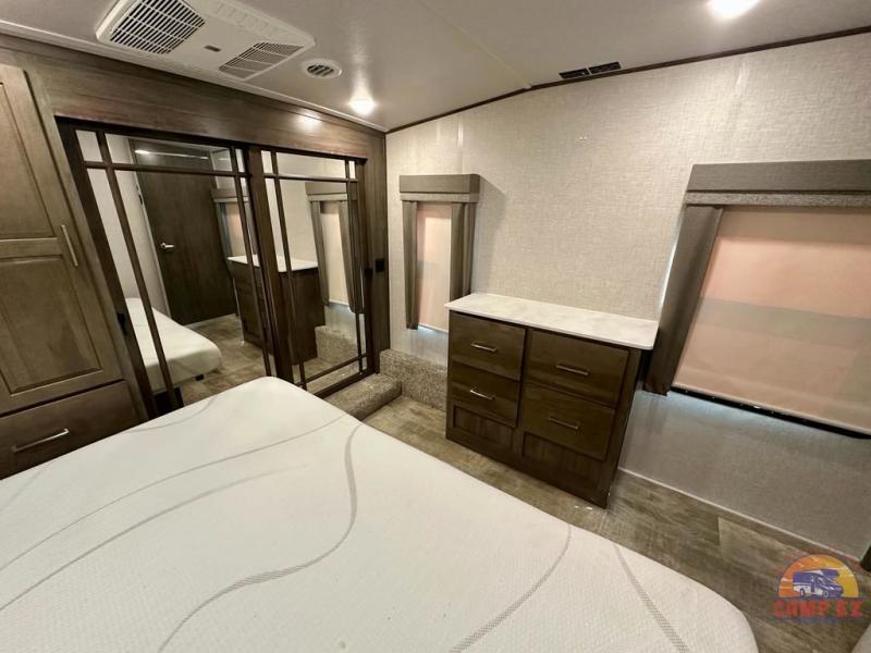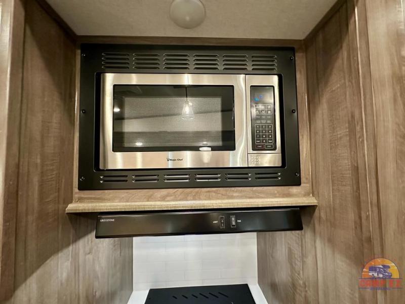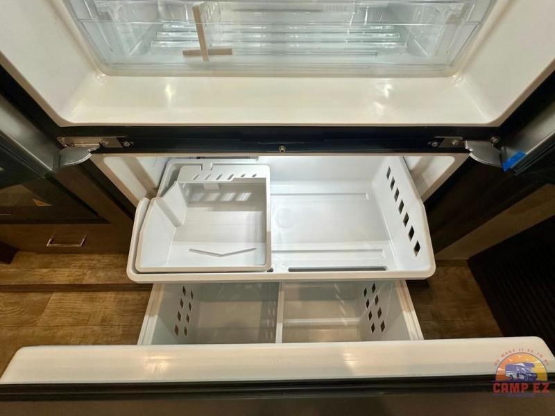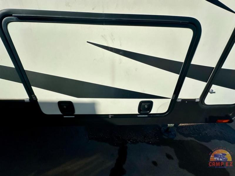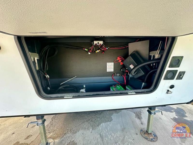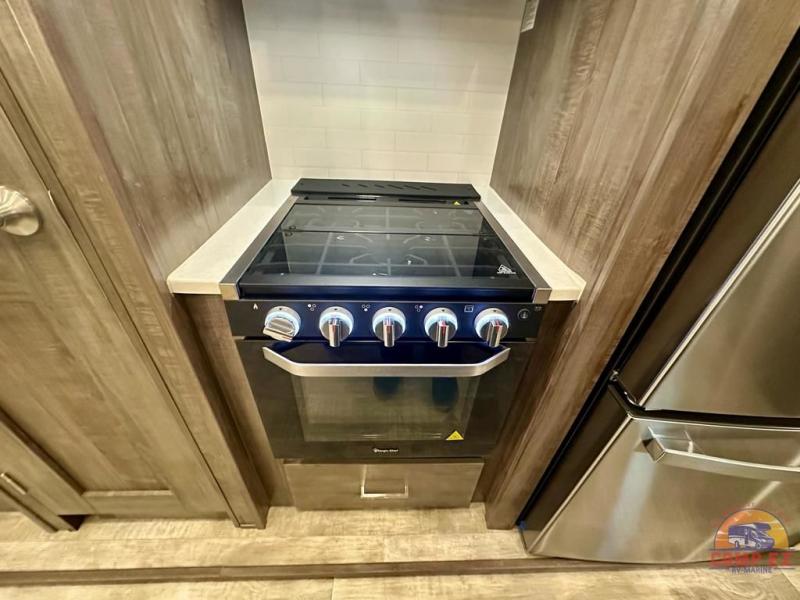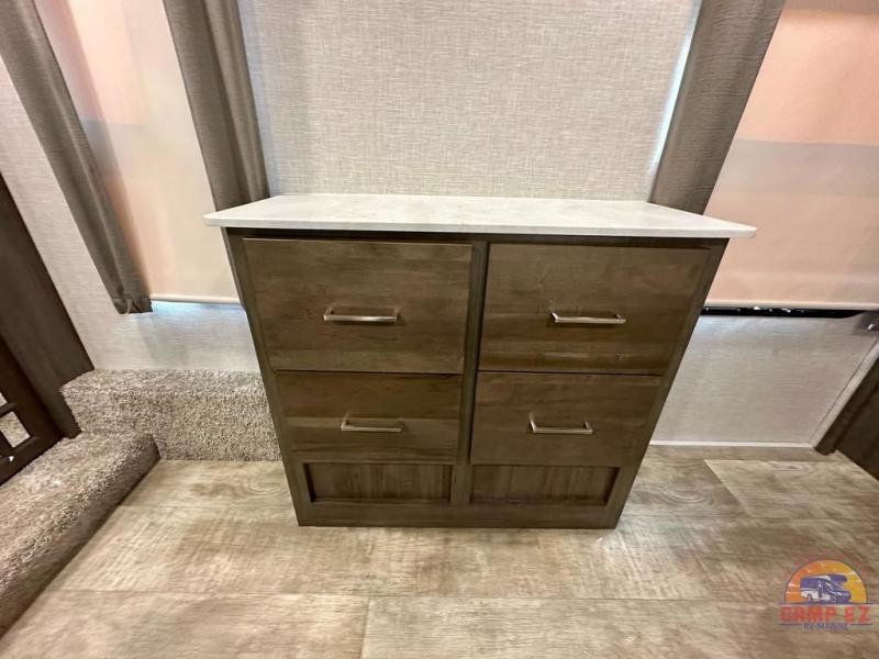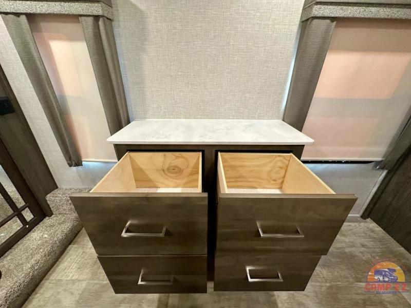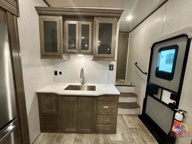 Get ready to enjoy the outdoors while inside with the enormous windows in both the rear, and the door side slide of this fifth wheel. The spacious main living area offers dual opposing slides giving you a great place to invite other RVers over to visit, eat and even play cards. There is seating for nine from the booth dinette, the theater seats and the rear hide-a-bed sofa. The cook will have a residential refrigerator to store lots of drinks and cold food, plus a pantry, and the center island offers extra counter space plus seating. After everyone has left, retire to the front bedroom with a queen bed slide, a shirt closet, a wardrobe with washer/dryer prep, plus more storage and a TV option. You might even like to choose a king bed option and/or an 18 cu. ft. gas/electric fridge option.