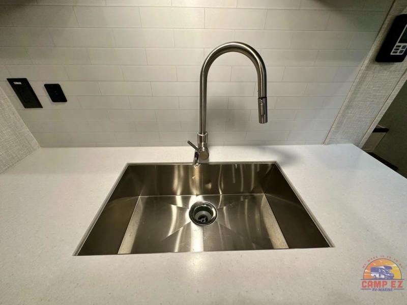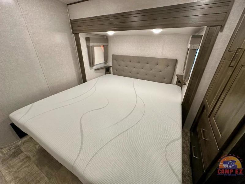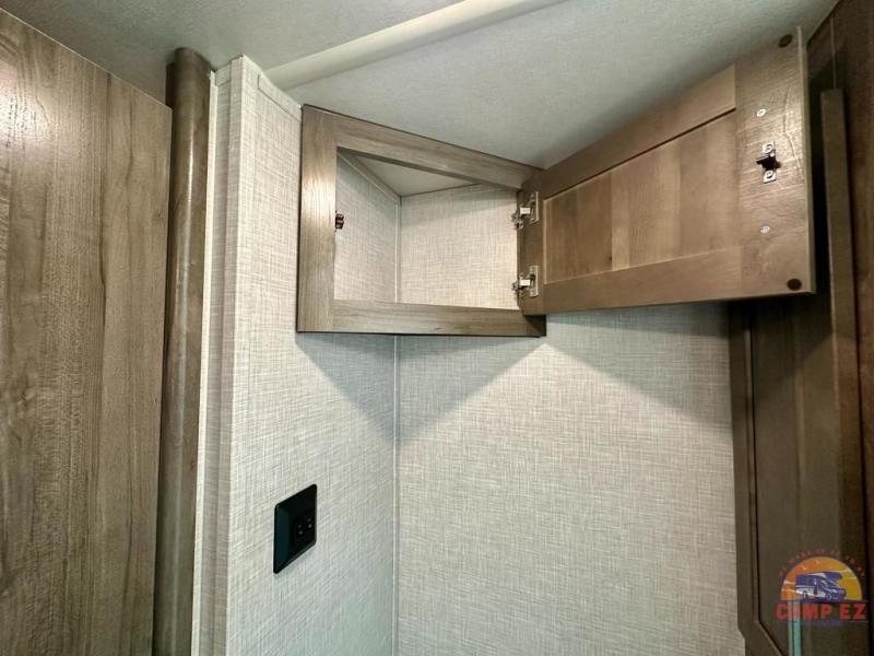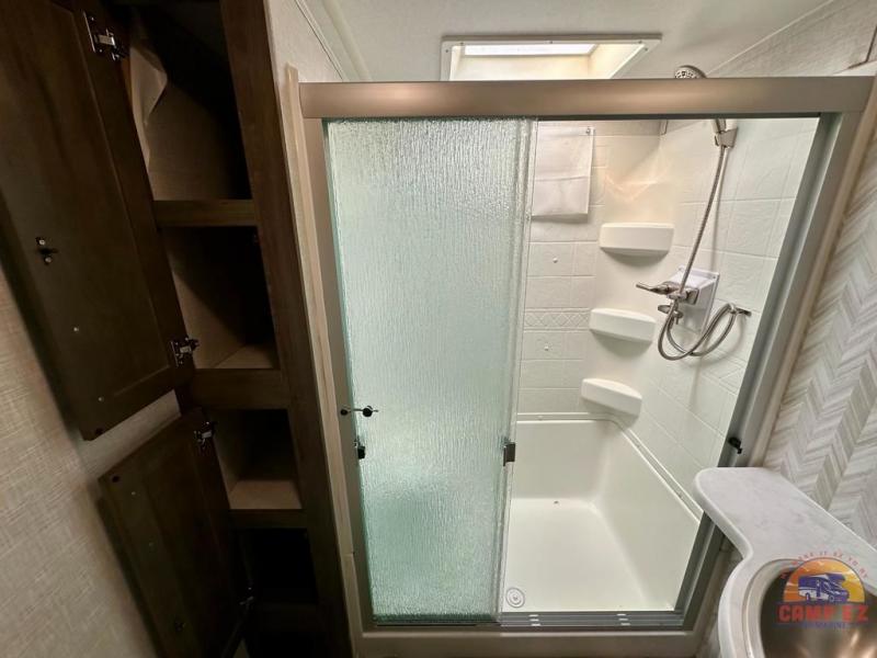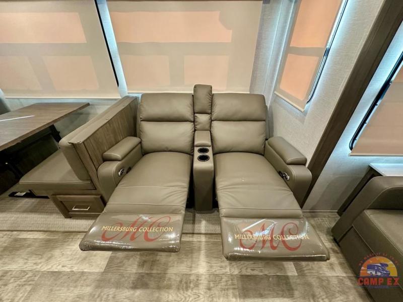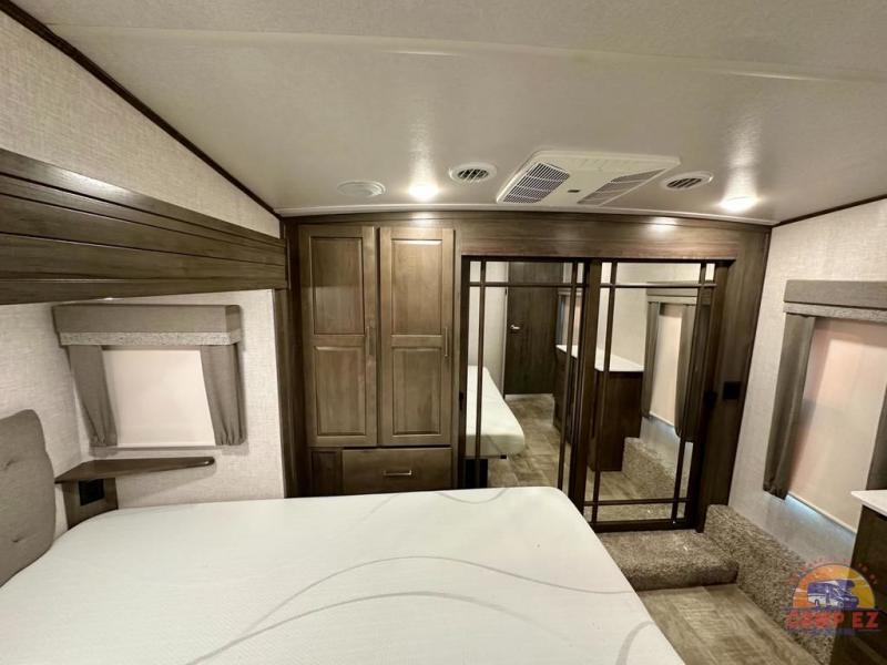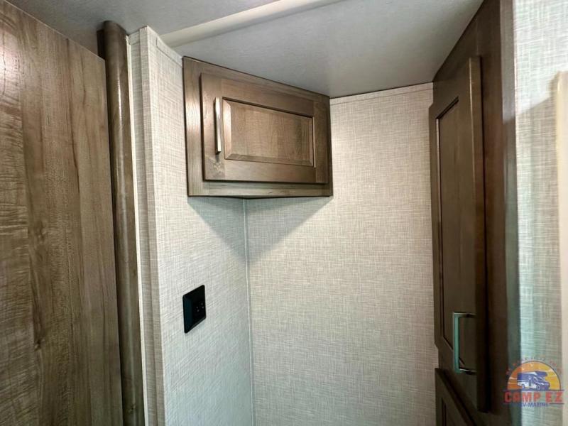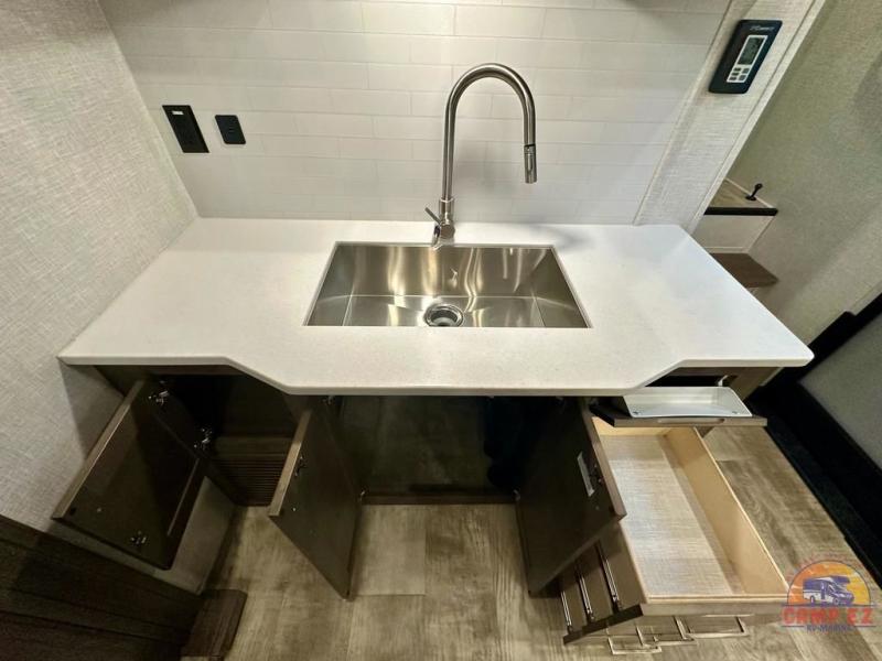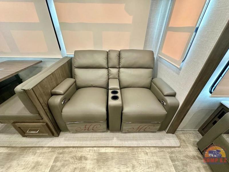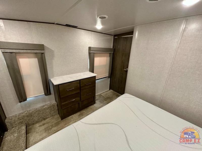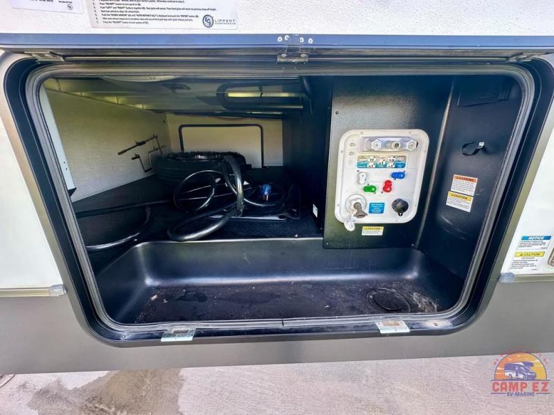 Get ready to enjoy the outdoors while inside with the enormous windows in both the rear, and the door side slide of this fifth wheel. The spacious main living area offers dual opposing slides giving you a great place to invite other RVers over to visit, eat and even play cards. There is seating for nine from the booth dinette, the theater seats and the rear hide-a-bed sofa. The cook will have a residential refrigerator to store lots of drinks and cold food, plus a pantry, and the center island offers extra counter space plus seating. After everyone has left, retire to the front bedroom with a queen bed slide, a shirt closet, a wardrobe with washer/dryer prep, plus more storage and a TV option. You might even like to choose a king bed option and/or an 18 cu. ft. gas/electric fridge option.
