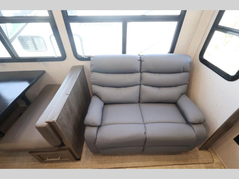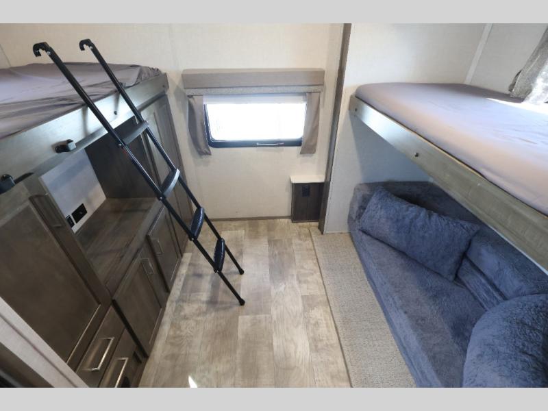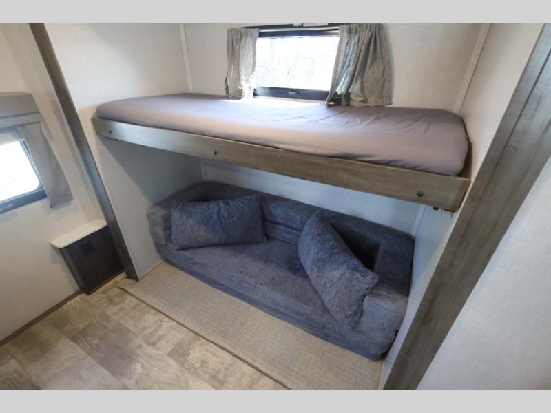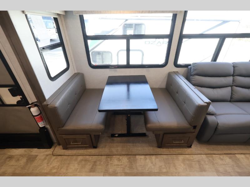 Convenience, comfort and lots of floor space is found in this fifth wheel from having a half bath within the private bunkhouse and fireplace in the living area to four slides found throughout, get ready to enjoy camping anywhere. The bunkhouse even has a rear window for great views, plus two bunk beds and a half bath. The kitchen offers full amenities and two pantries for lots of food storage. The double entry bathroom makes getting ready easy and nighttime trips even easier. And the queen bed will allow you to sleep comfortably each night after a fun day with your family and/or friends. Don't forget about the outdoor features like the outside kitchen, the rear ladder, the 18' awning and the exterior storage for your outdoor gear.