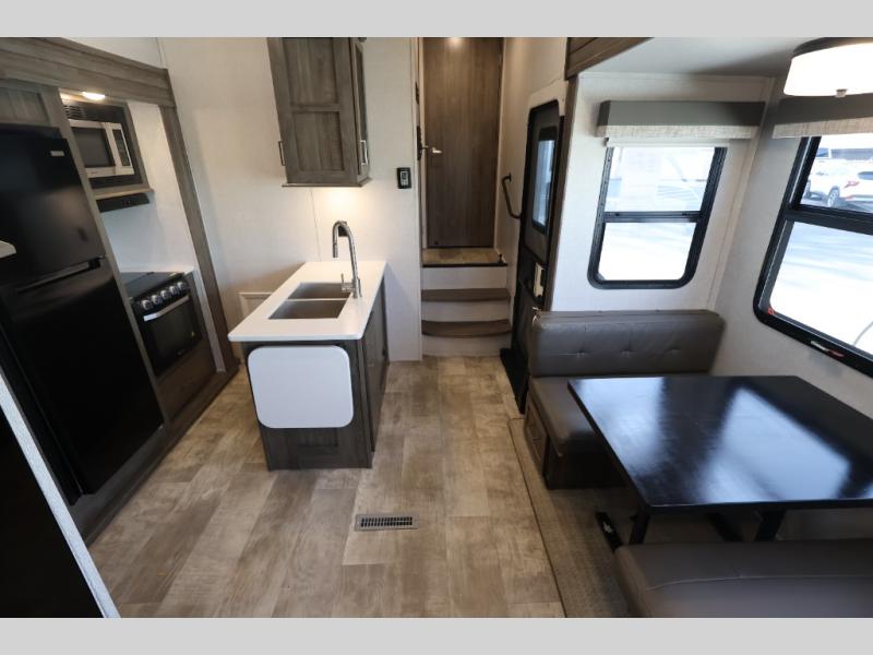 With any Flagstaff Super Lite fifth wheel by Forest River the towing features include Easy Lube axles and Nev-R adjust brakes, and rear observation camera prep. Each is built with 6 sided aluminum framed walls, floor and roof, a radius roof with a vaulted interior ceiling, thermostatically controlled heated holding tanks and an enclosed underbelly allowing you to travel during any season. The interior offers a Water-Pur filtration system, hidden hinge cabinet doors, a porcelain residential-style bowl toilet! Choose a lightweight, towable by half-ton or three-quarter ton pickup truck Flagstaff Super Lite today!