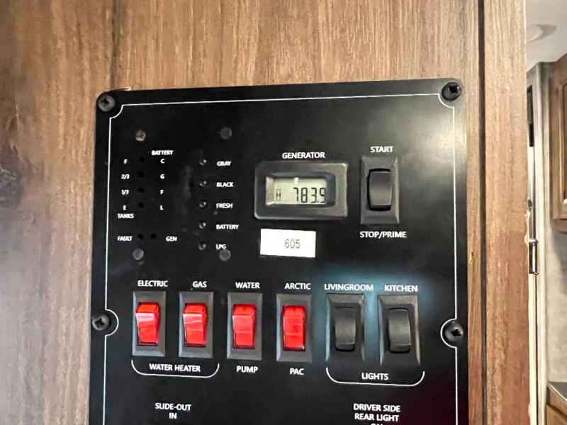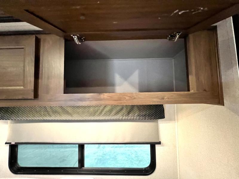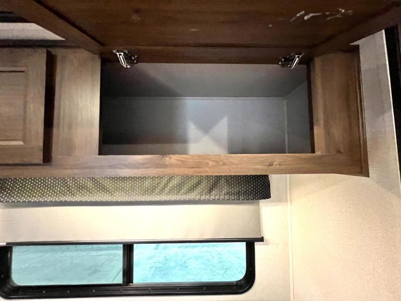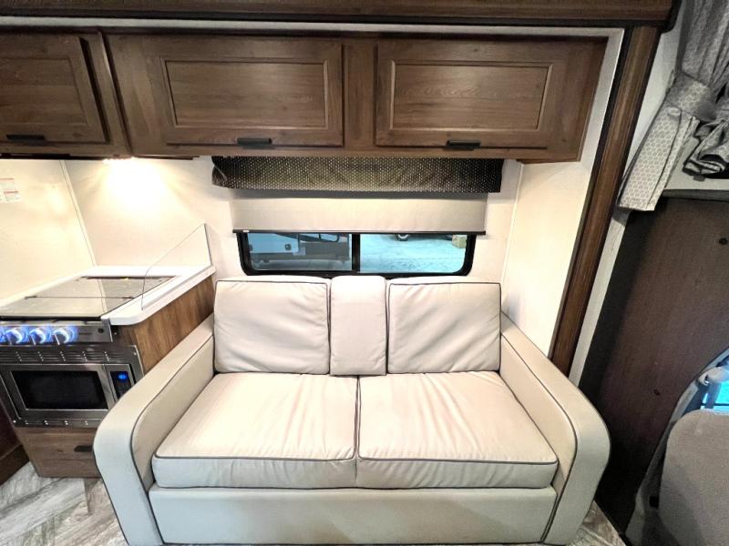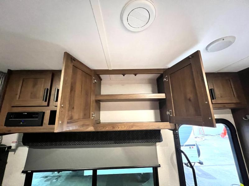 This family friendly coach allows the kids to have their own space either on the flip-down bunk above the kid's sofa sleeper that is across from the full bathroom and offers dividers for privacy or on the queen bunk over the cab up front. You will have the rear bedroom all to yourself after closing the divider, and there are dual nightstands, two wardrobes, and drawers for more storage, plus your own queen bed. Everyone can visit while relaxing on the sofa and booth dinette while watching the LED TV or even while sitting under the 11' power awning outside when you add your camping chairs. The kitchen offers a corner area to make meals with a convection microwave and recessed three-burner range, plus a round sink and flip-up counter extension, and you can store cold items in the 10 cu. ft. 12V refrigerator near the entry, and the soft touch self-closing drawer guides and cordless 12V charging plate are features you will love.