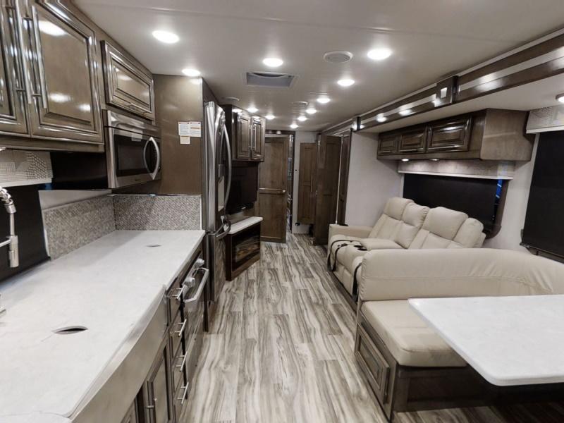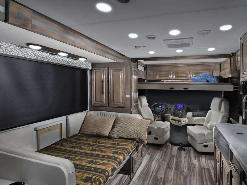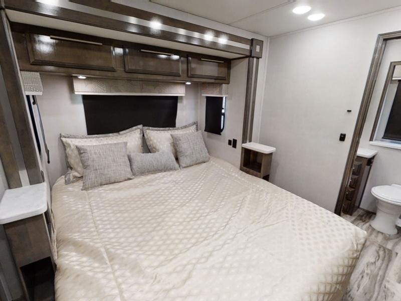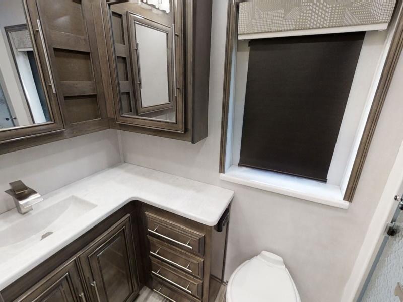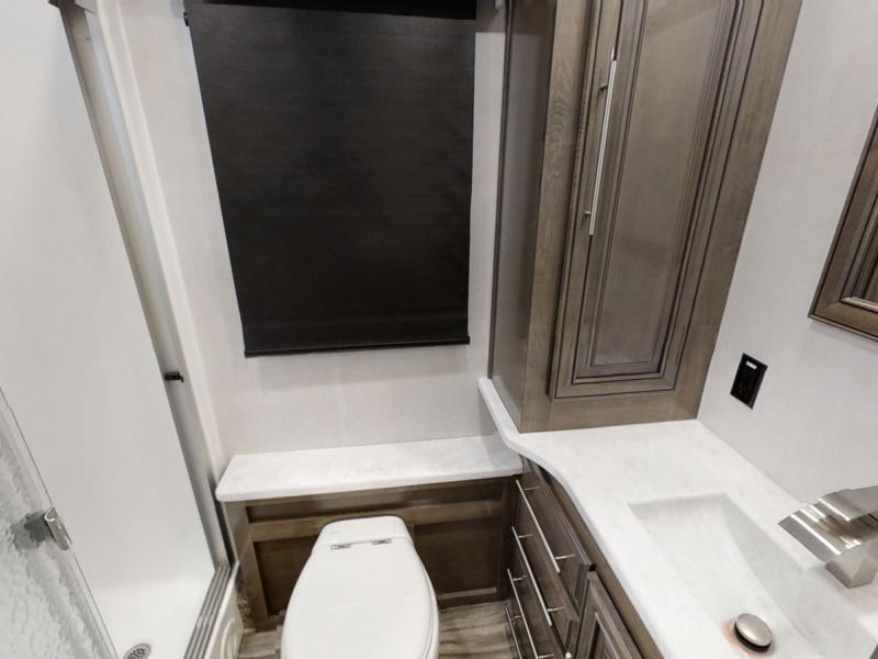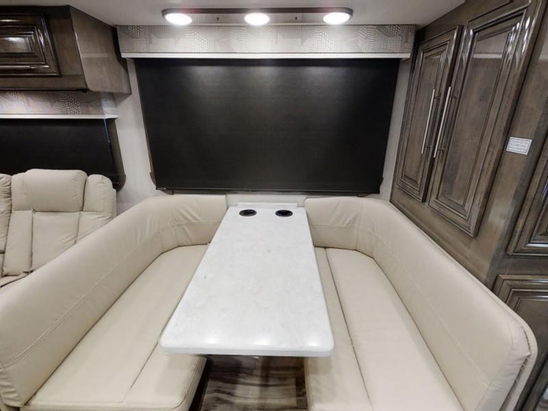 It's a clean decision to take this motorhome on all of your adventures with two full bathrooms! The full rear bathroom has a 42" x 30" shower with a seat and creates a master suite with the bedroom which has a 72" x 80" king bed slide across from a dresser with a 32" LED TV and wardrobes on either side of it with one of them prepped to add an optional washer and dryer. The set of bunk beds are conveniently across from the second full bathroom which will come in handy at night and keep things running smoothly in the mornings with a 41" x 34" shower. Prepare your best home cooked meals with the three burner cooktop and enjoy them at the booth dinette then relax on the theater seating!